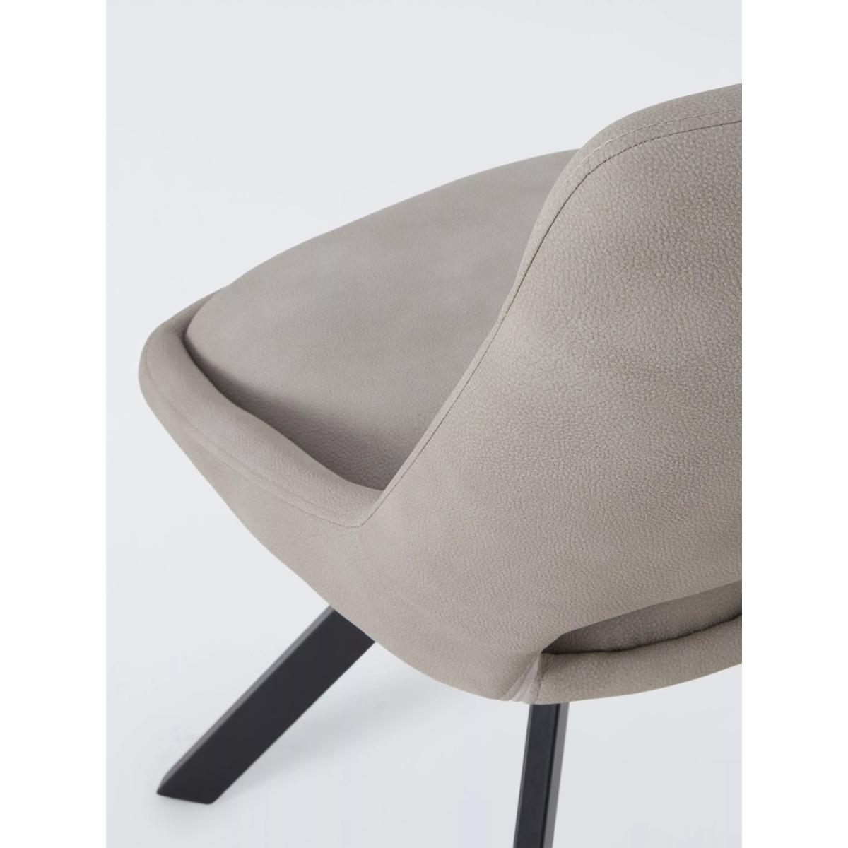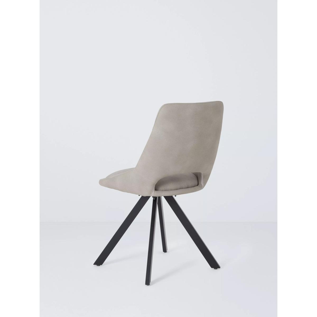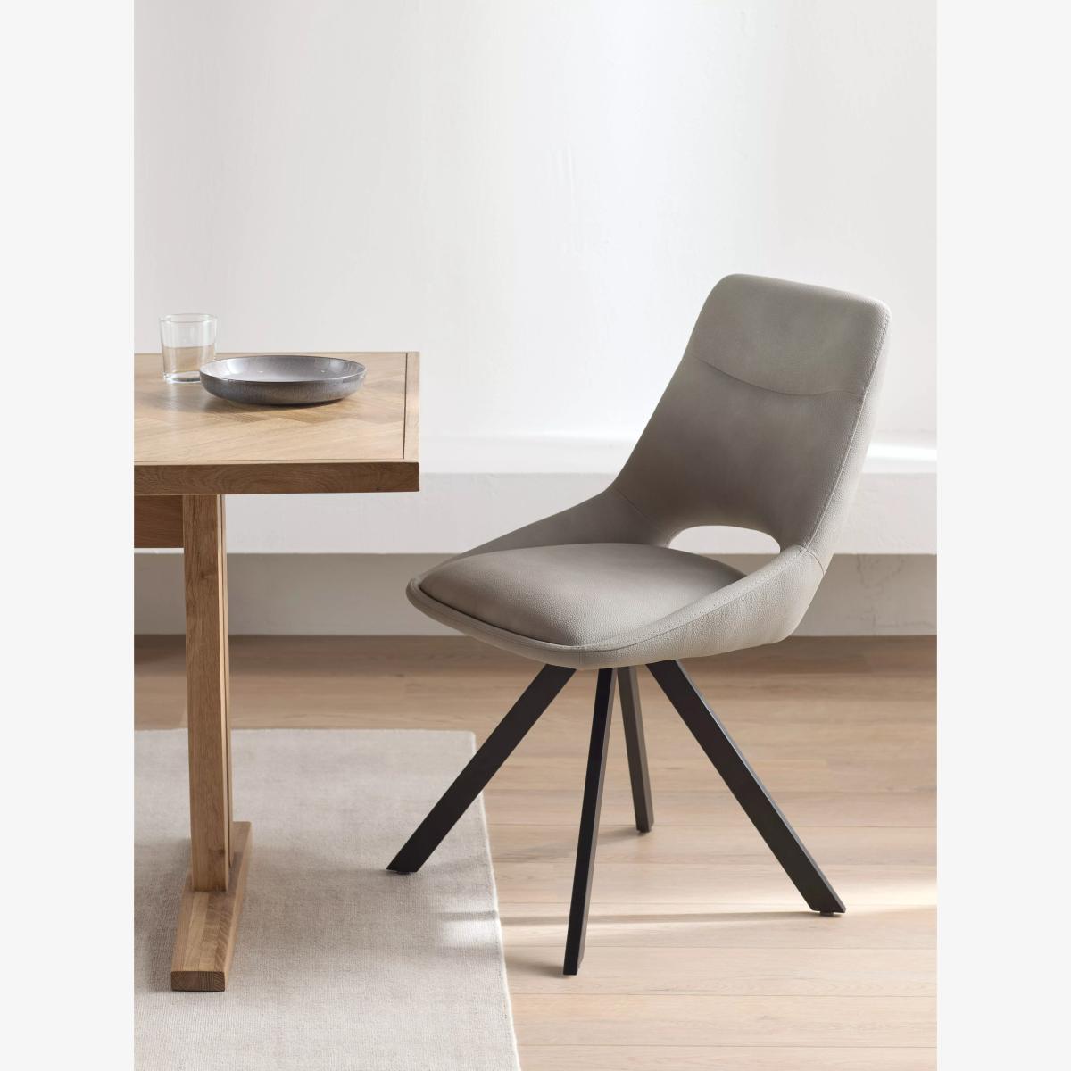 This dining chair features a sleek, contemporary design in polyurethane and textured misty polyester upholstery, offering a refined touch to any space. Its ergonomic seat and backrest provide excellent comfort, while the durable matte black metal legs add stability and style. Equipped with a swivel mechanism, it ensures enhanced versatility and functionality - perfect for modern dining areas. Want to see it first? You may want to see and get a feel for the furniture in one of our shops before ordering. We'll be able to tell you where the range you'd like to view is on display.