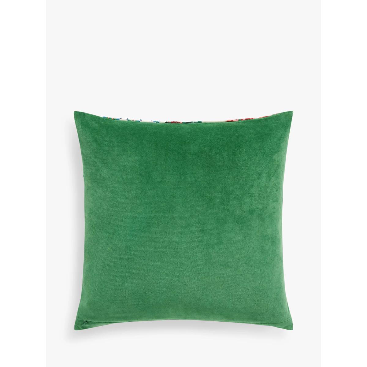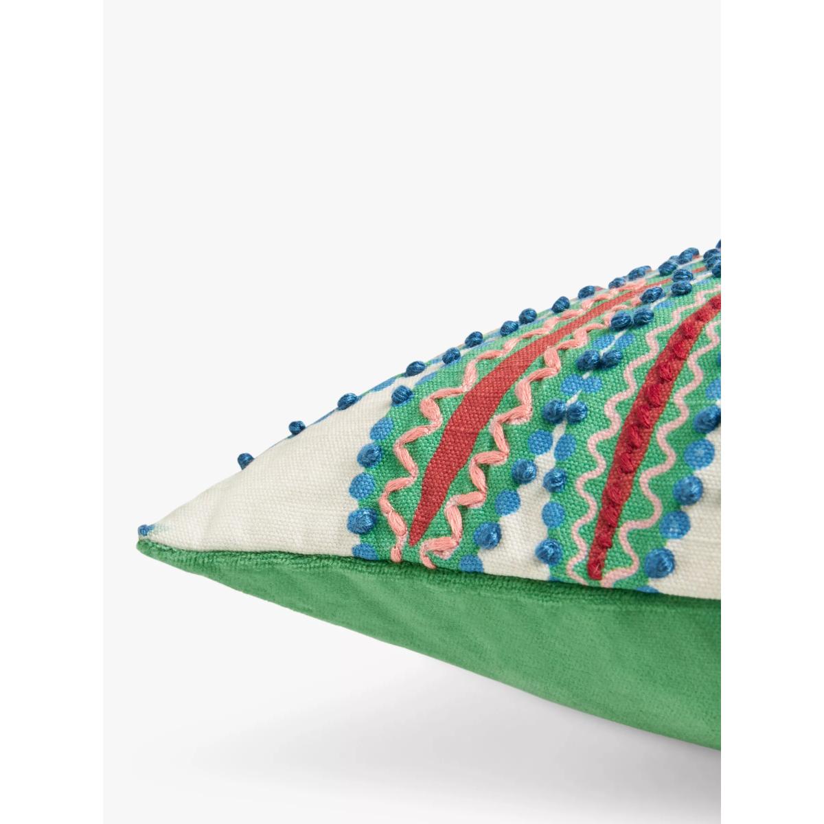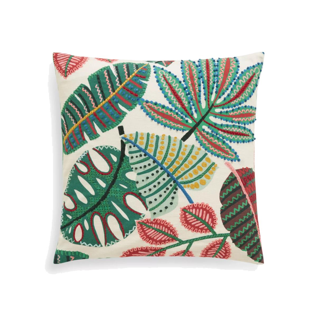 A digital print of colourful exotic leaves, given added vibrancy and texture with hand embroidery. The reverse is made from plush cotton velvet.
