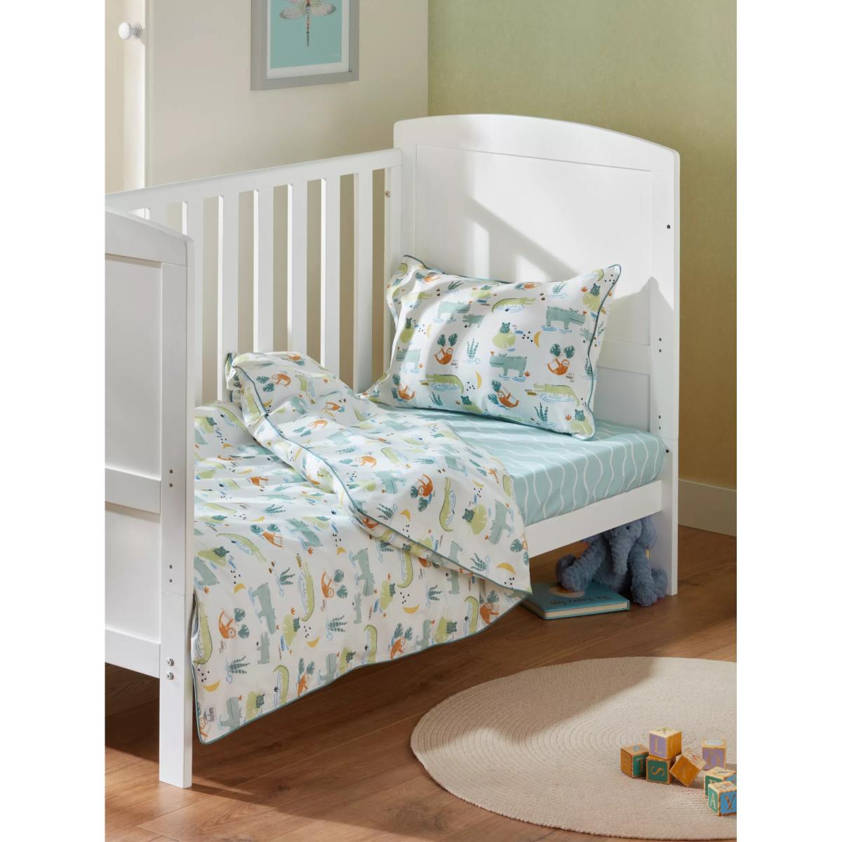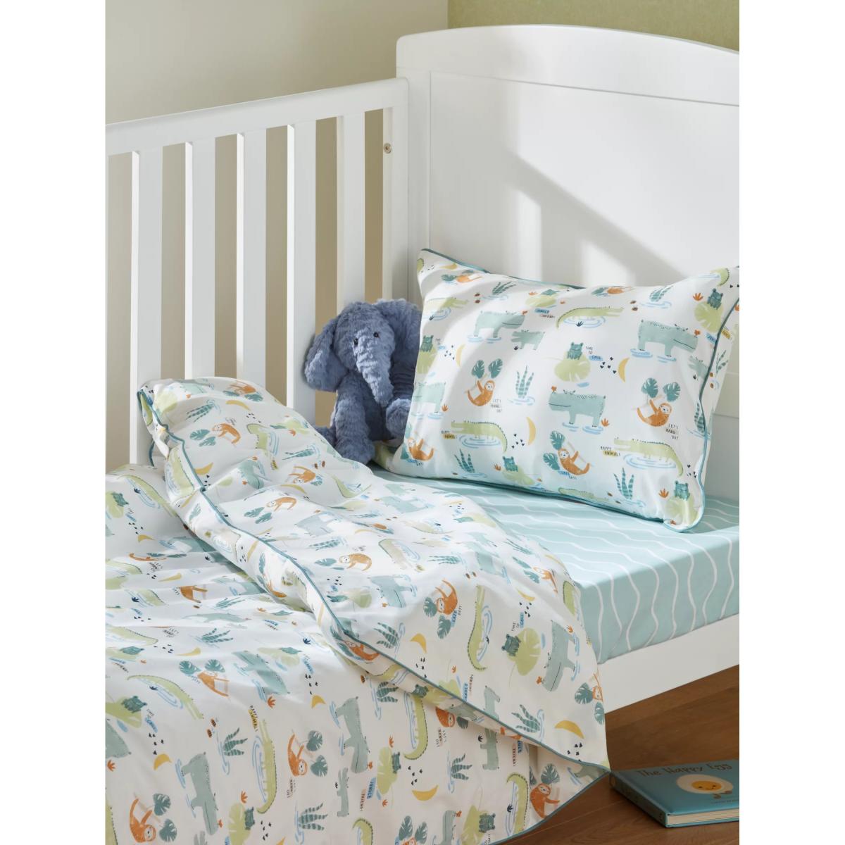Add some jungly fun with this attractive duvet cover and pillowcase set. With an all-over print of jungle friends, it's a fun style you'll both love. Crafted from pure cotton for a breathable feel that won't irritate their skin, it has a 200 thread count to ensure the little one stays comfortable at all times. Pair with other matching items from our nursery range. Please remember: Quilts, duvets and pillows are not suitable for children under 12 months due to the risk of overheating. Better Cotton By choosing our cotton products, you’re supporting our investment in Better Cotton’s mission to help cotton communities survive and thrive while protecting and restoring the environment. Better Cotton Farmers are farmers who care for the environment and respect workers’ rights and wellbeing. This product is sourced via a system of mass balance and therefore may not contain Better Cotton.