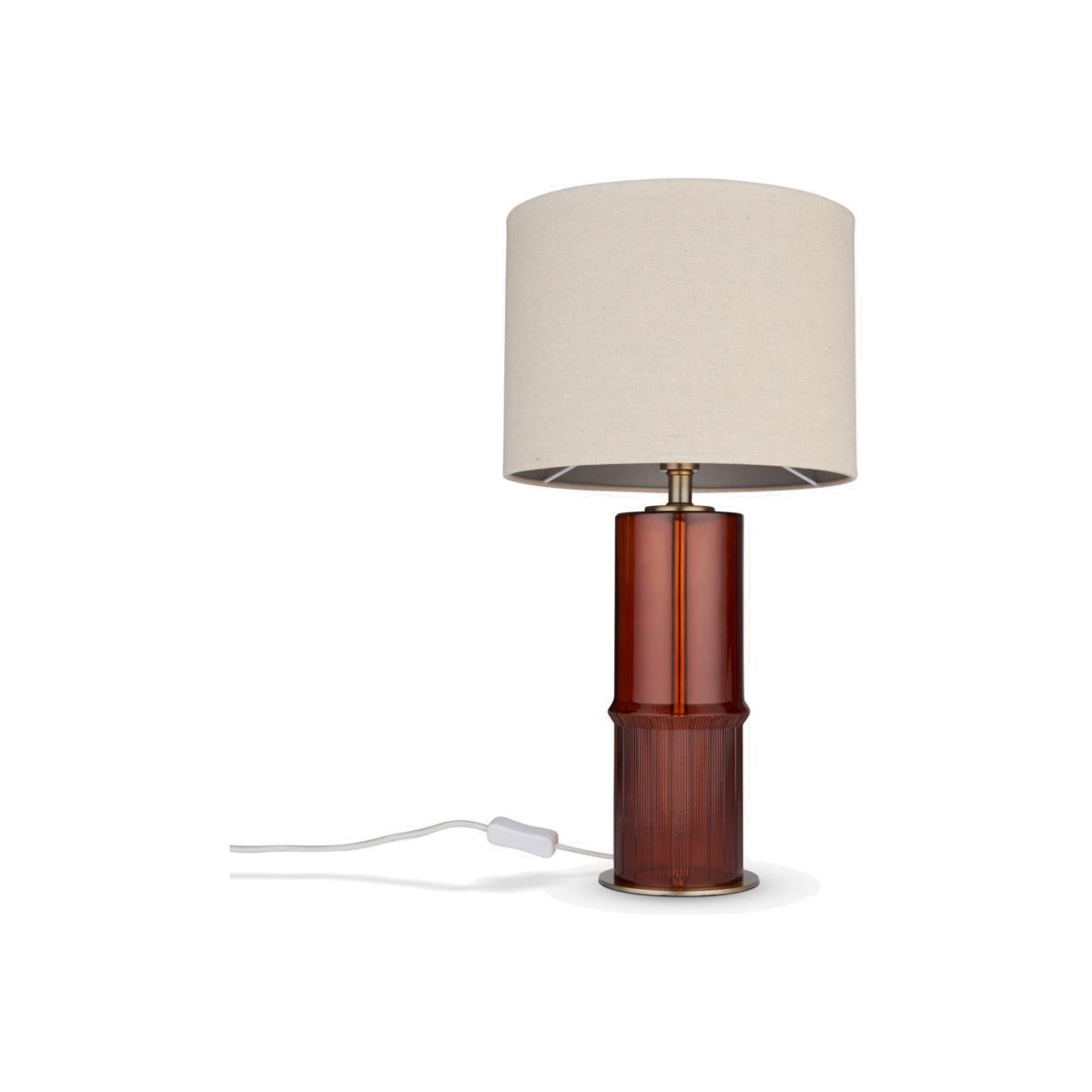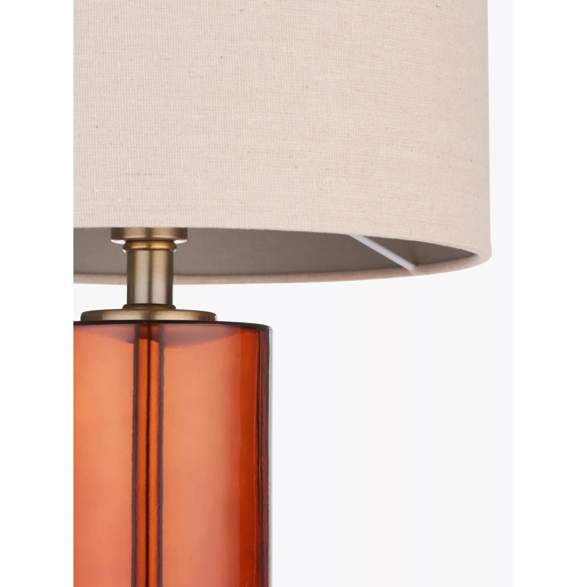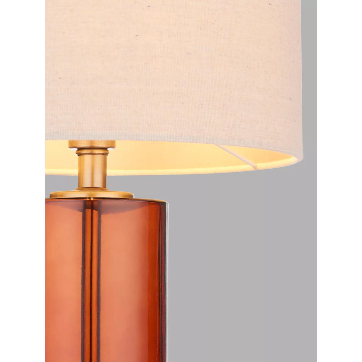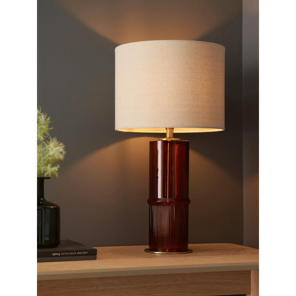This unique table tamp features a bottle-brown glass base finished with antique brass effect accents. Complete with a faux linen shade.
