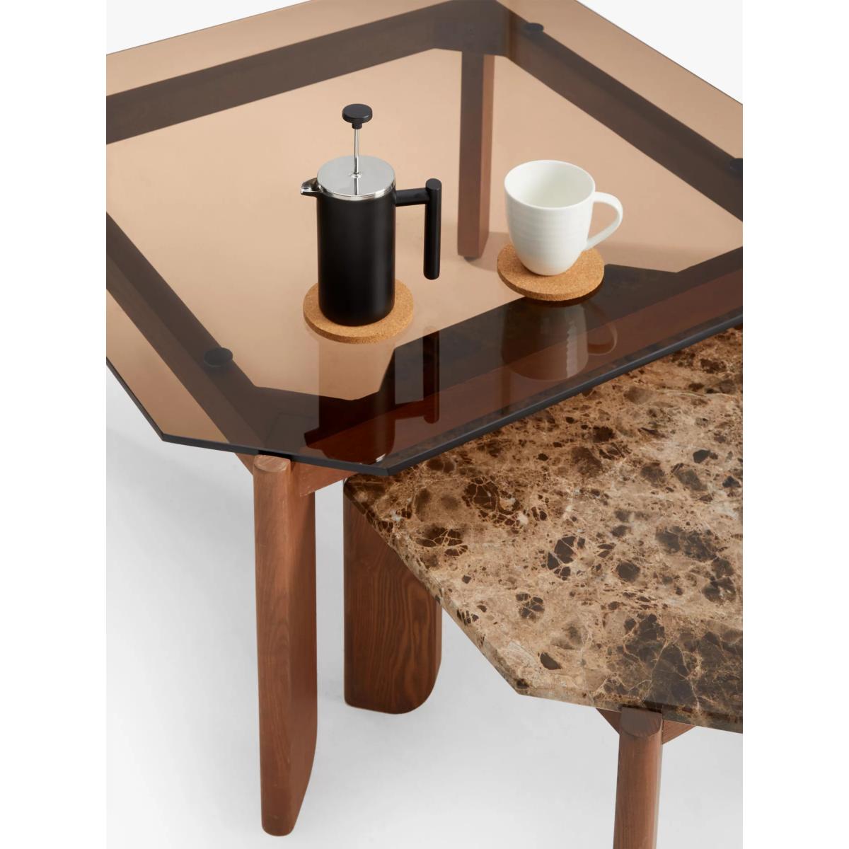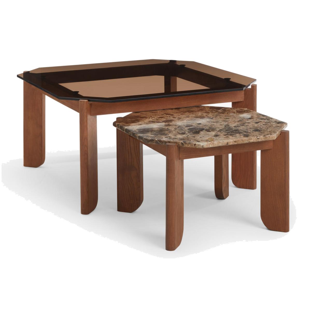 A pair of nesting tables, one with a smoked glass top and the other with marble, make for an eclectic modern choice with innate durability. Stained ash frames, with four sturdy legs, have an attractive added feature of a curve at the base. Want to see it first? You may want to see and get a feel for the furniture in one of our shops before ordering. We'll be able to tell you where the range you'd like to view is on display.