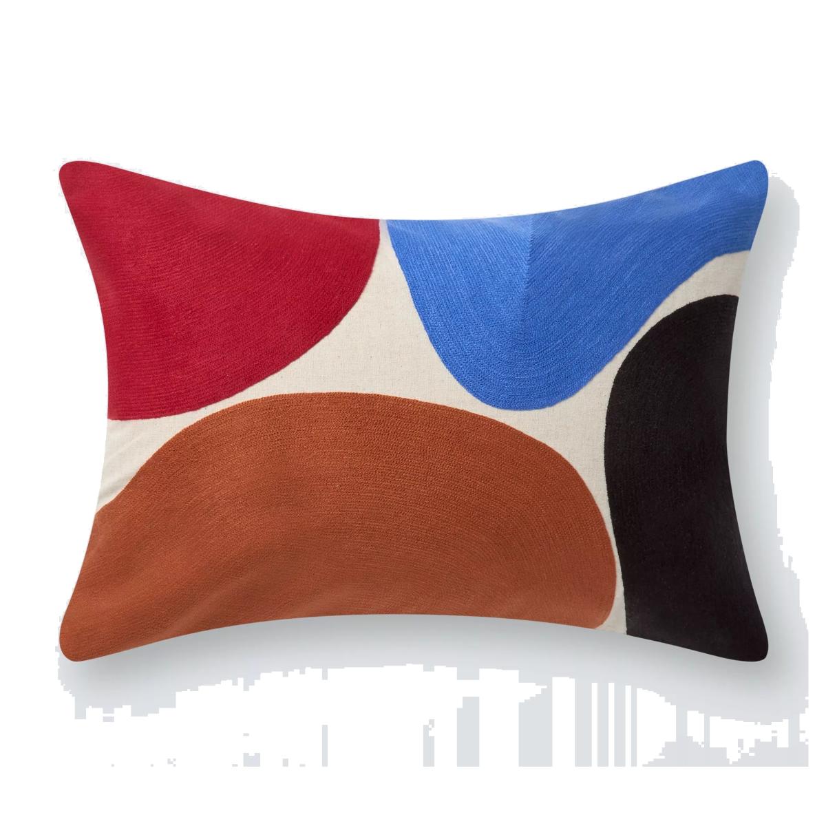 Textured and colourful, this abstract cushion features chainstitched "pebbles" on a natural background.