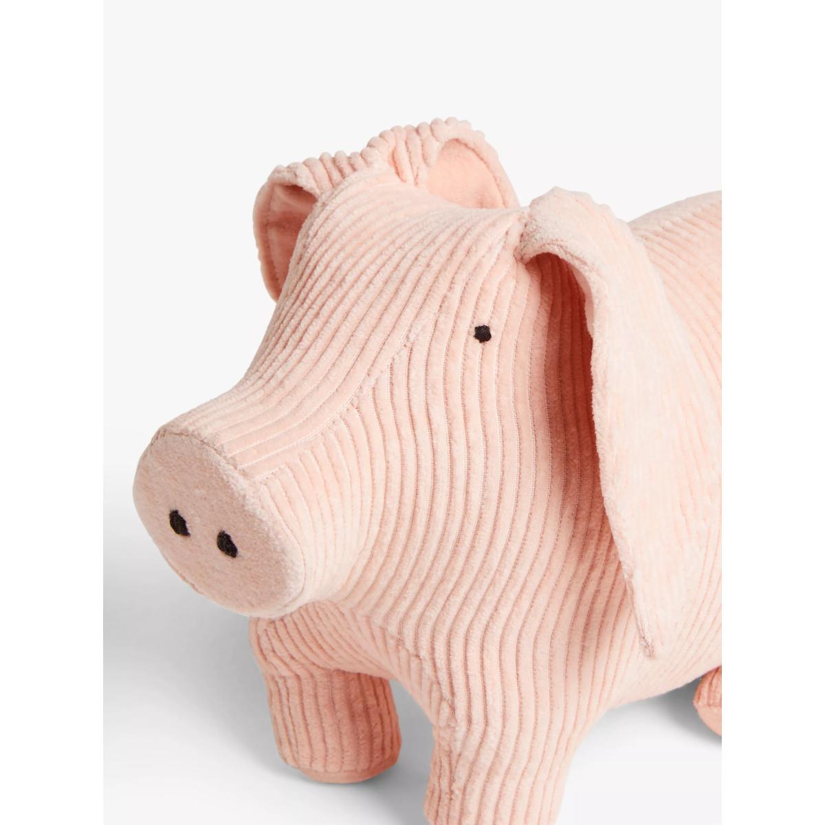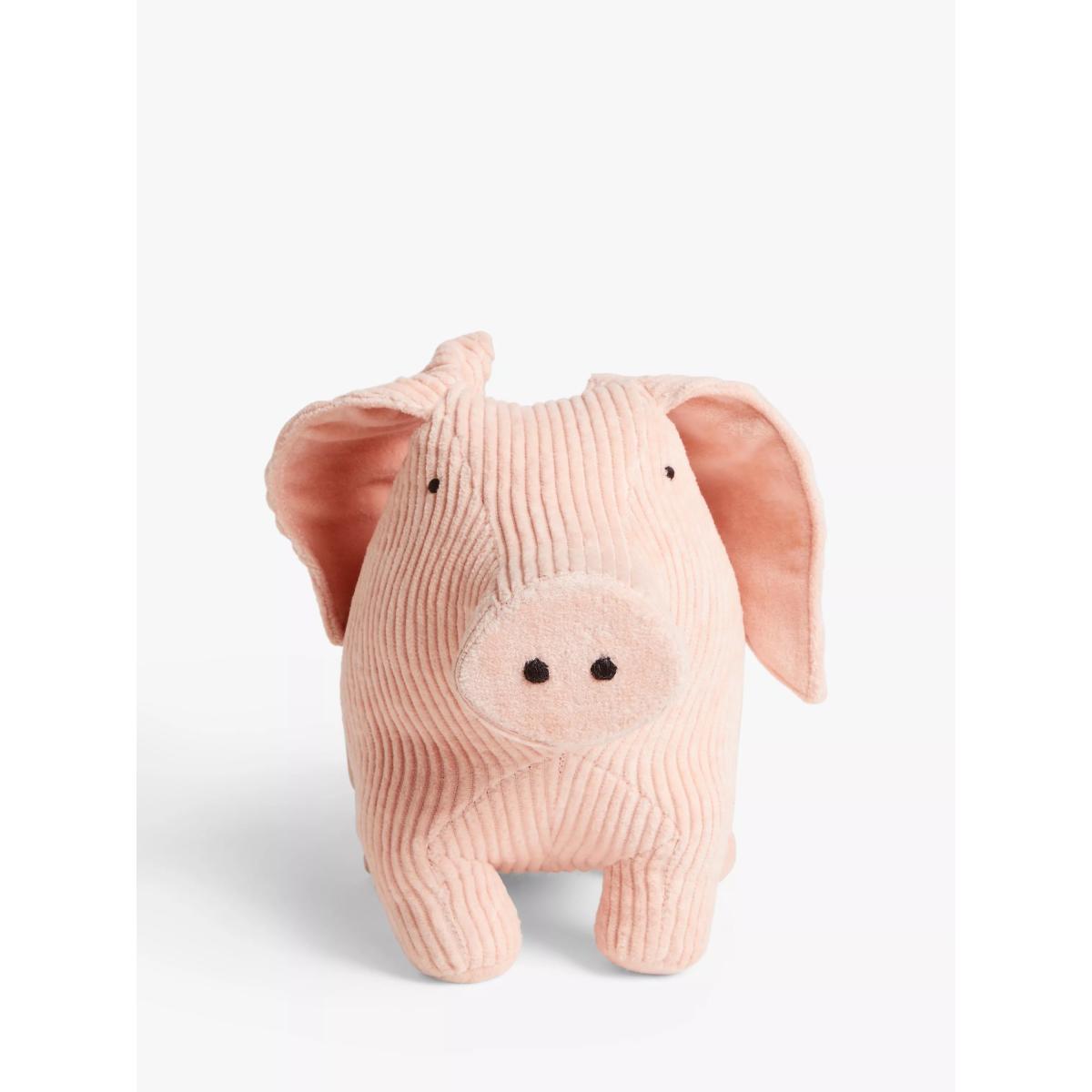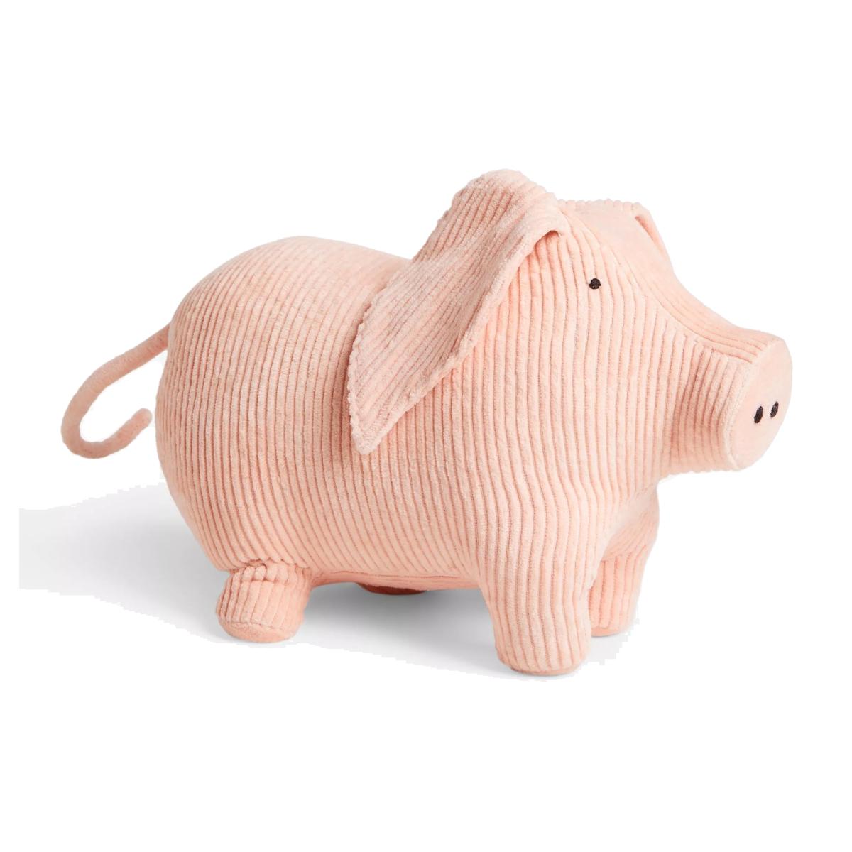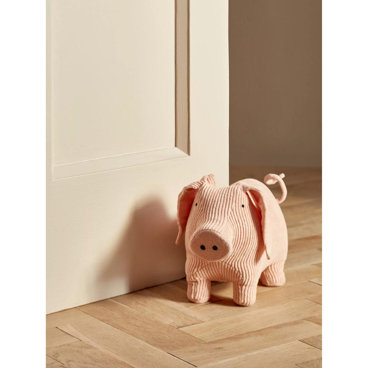 This pink piggy sits patiently, holding open your door. He's covered in soft, corduroy fabric so he won't hurt your toes.
