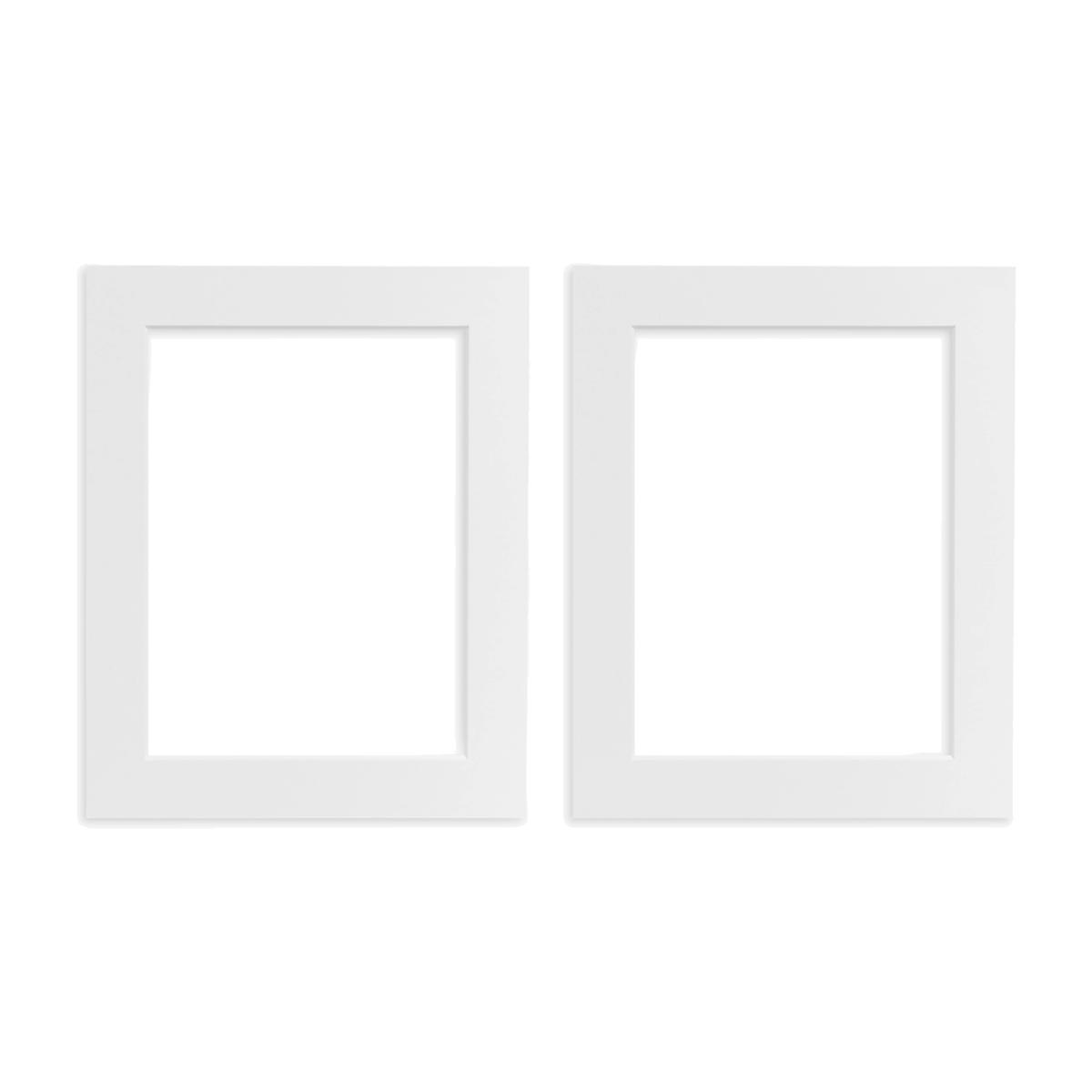 A pack of two plain white mounts to display and surround a photo or image in a frame, made of ageing-resistant, acid-free card. Each window mount is for an image sized 8 x 10" (20 x 25cm). The inch measurements are rounded measurements worked back from standard centimetre sizes.