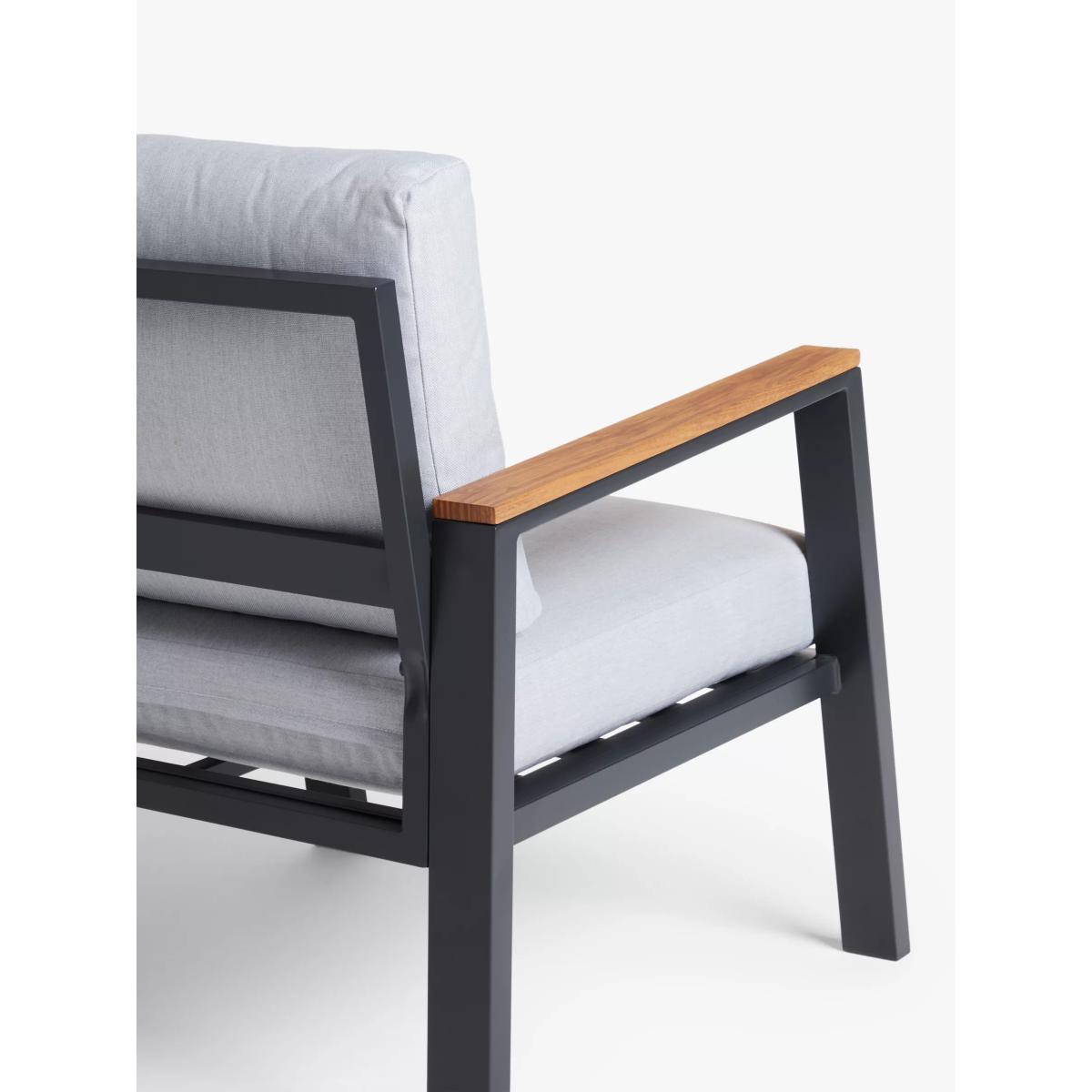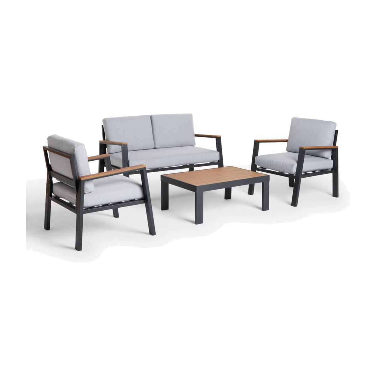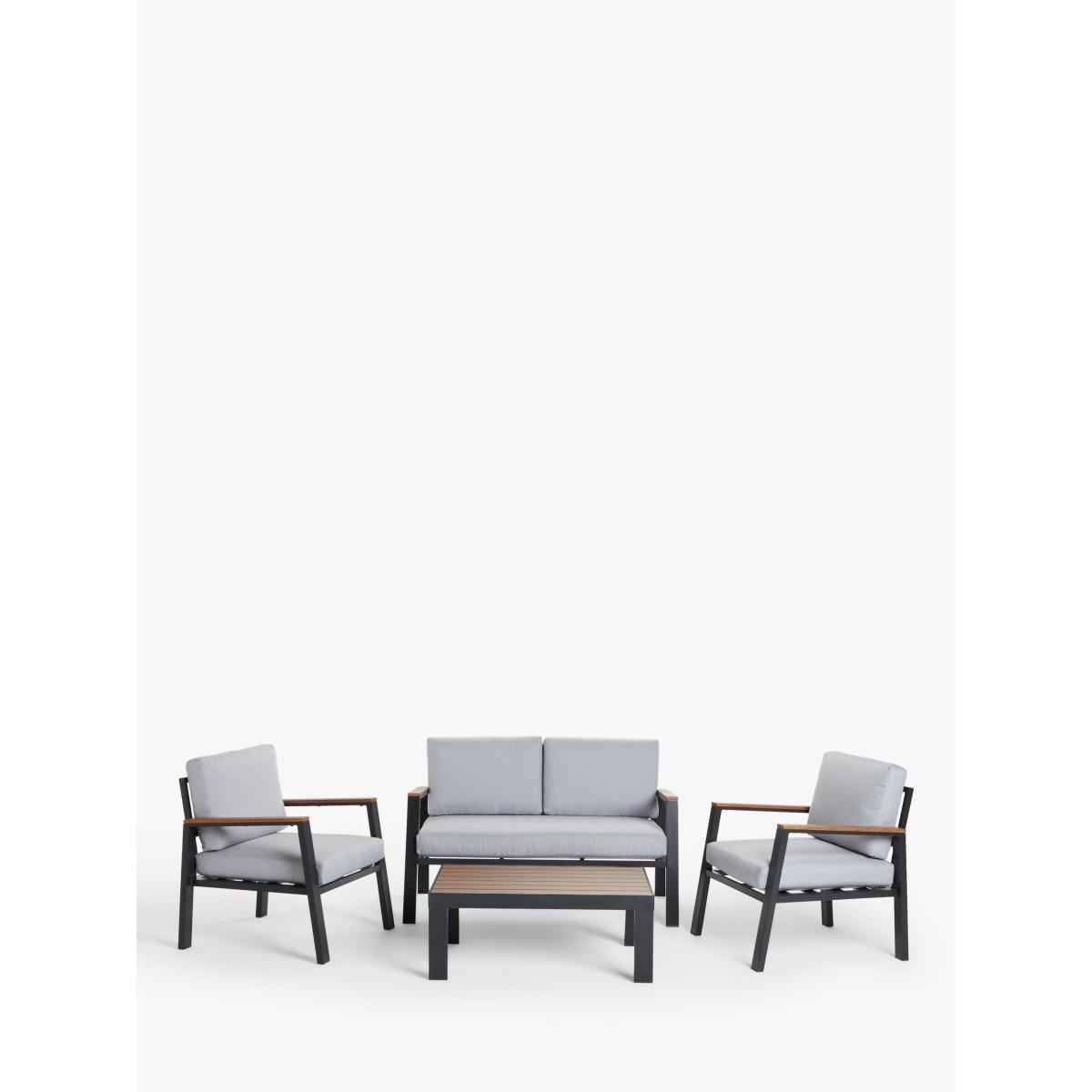 Our Platform four-seater lounging set, for the garden or conservatory, is a modern design with wood-effect details on robust aluminium frames. This lightweight and weather-resistant set includes a rectangular coffee table with a wood-effect top, echoed on the armrests of the two-seater sofa and pair of armchairs. Shower-resistant seat and backrest cushions provide comfortable support on the seating. Key features: 4-seater lounging set comprising two armchairs and a 2-seater sofa Rectangular coffee table with wood-effect top Wood-effect armrests on the seating Robust yet lightweight aluminium frames Soft shower-resistant seat and backrest cushions Seat height: 30cm