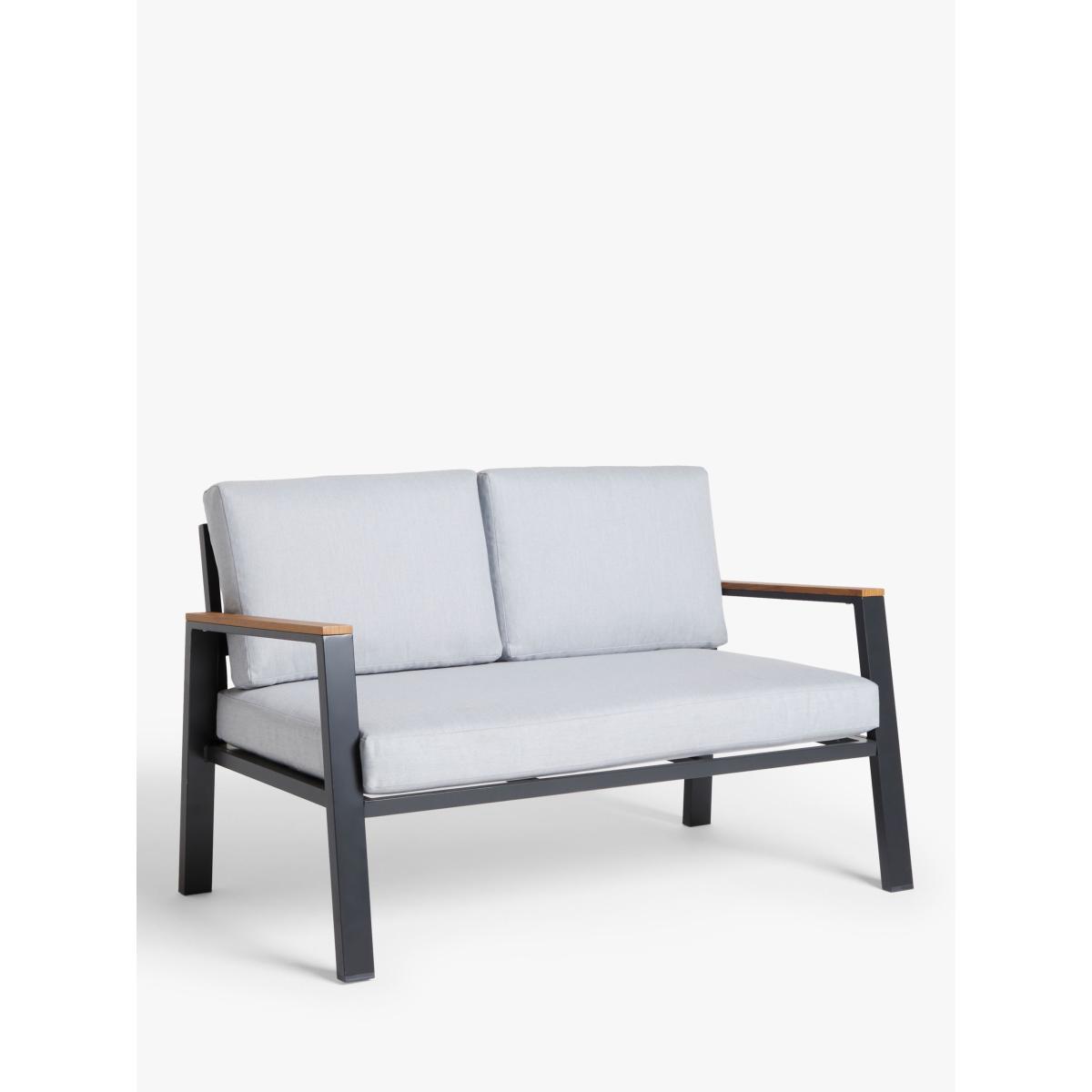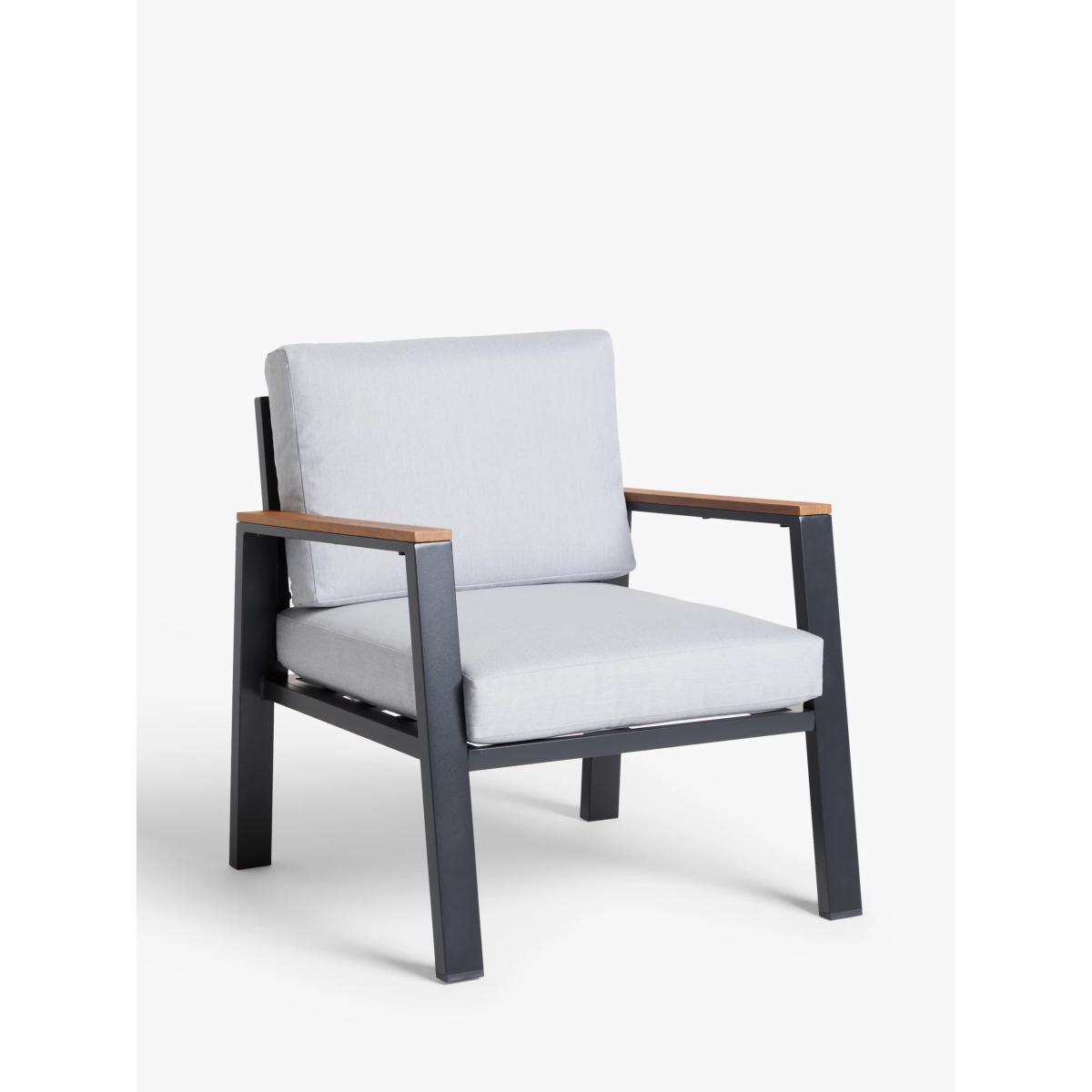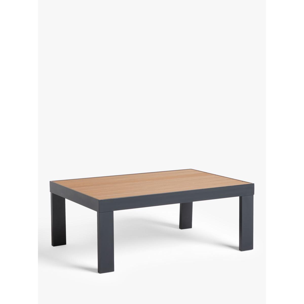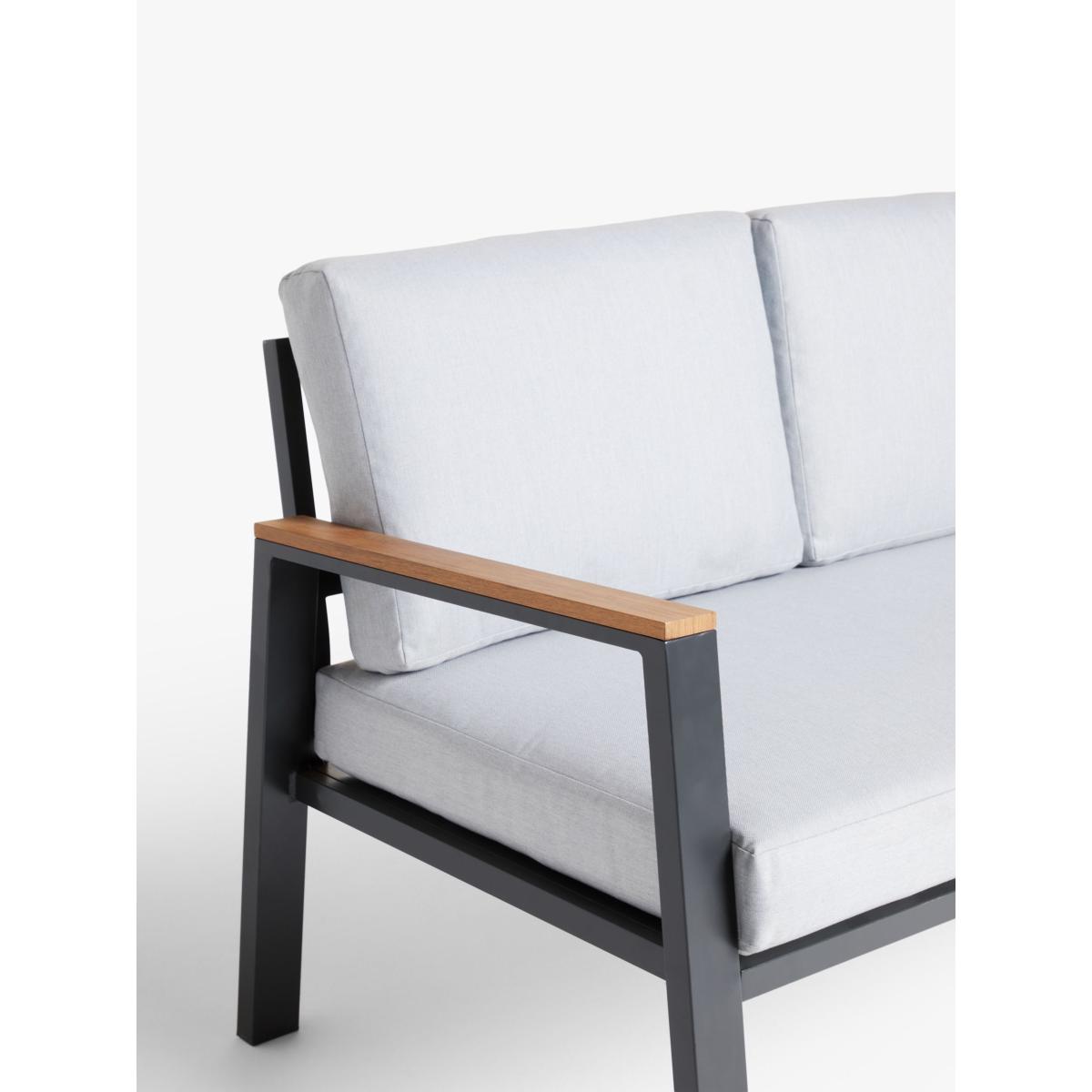 Our Platform four-seater lounging set, for the garden or conservatory, is a modern design with wood-effect details on robust aluminium frames. This lightweight and weather-resistant set includes a rectangular coffee table with a wood-effect top, echoed on the armrests of the two-seater sofa and pair of armchairs. Shower-resistant seat and backrest cushions provide comfortable support on the seating. Key features: 4-seater lounging set comprising two armchairs and a 2-seater sofa Rectangular coffee table with wood-effect top Wood-effect armrests on the seating Robust yet lightweight aluminium frames Soft shower-resistant seat and backrest cushions Seat height: 30cm