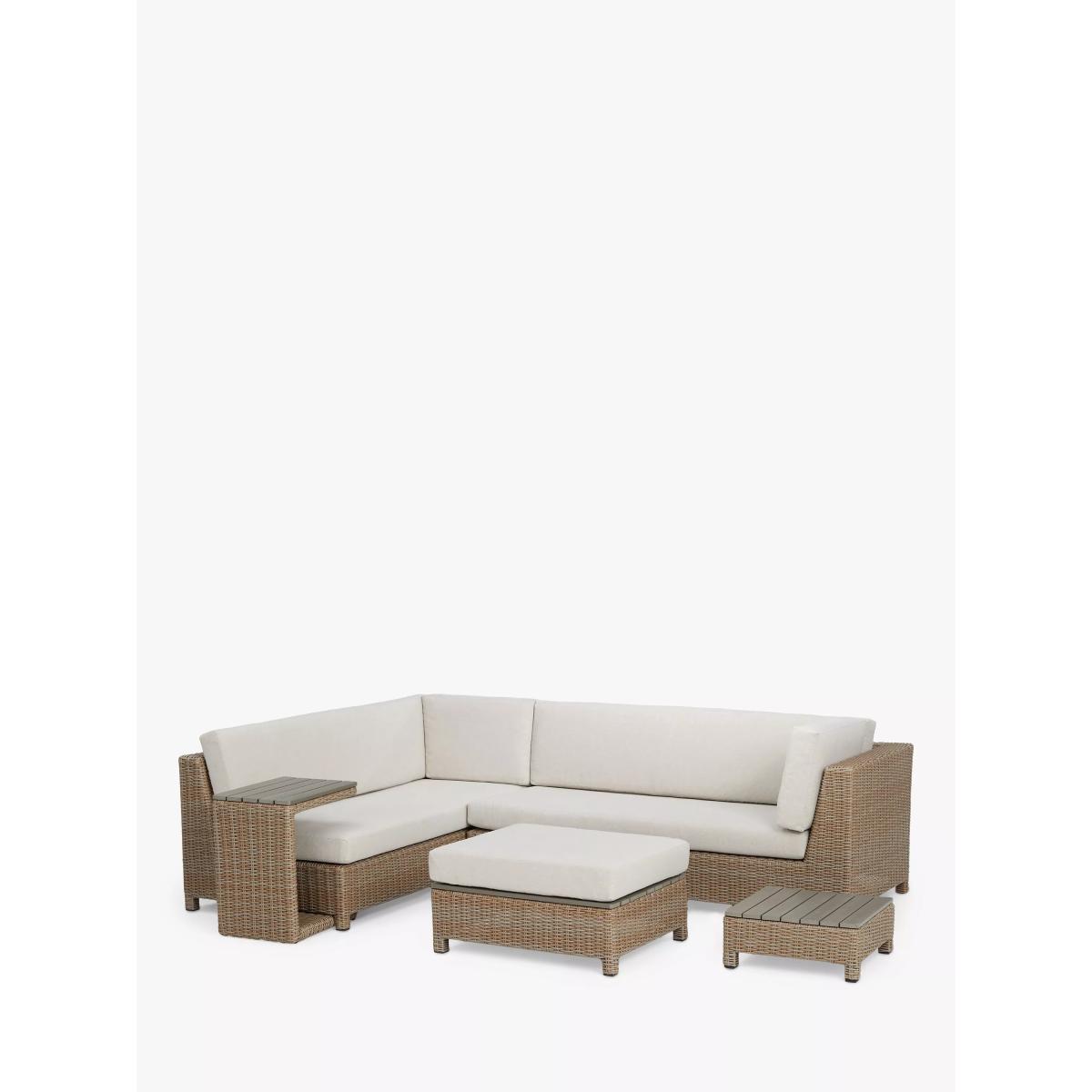 Our Platform Rattan six-seater corner modular lounging set can be arranged to suit your space, whether it's in the garden or conservatory. A mix of the modern and traditional, it boasts a weather-resistant polyrattan weave and wood-effect details on robust yet lightweight aluminium frames for a premium look. This rust-proof and weather-resistant set includes a square coffee table with a wood-effect top, echoed on the side table and pull-out side table on one sofa end. Shower-resistant seat and backrest cushions on the two sofas provide comfortable support on the seating. Add the included square cushion to the coffee table and it doubles as a footstool. Key features: Corner lounging set comprising two 3-seater garden sofas Square coffee table with wood-effect top, doubling as a footstool Side table with wood-effect top and wood-effect pull-out table Robust yet lightweight aluminium frames Soft shower-resistant seat and backrest cushions Garden furniture care: To keep your outdoor furniture in the best condition, store it in a cool, dry, well-ventilated spot indoors over the winter. If it’s staying outside, use an outdoor furniture cover whenever the weather is wet or unseasonal. Make sure furniture is clean and dry before storing it away, and keep cushions in a clean and dry place when not in use.