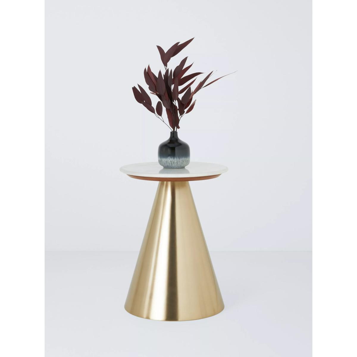 I’m a fan of the Plaza marble-top side table for its clean lines and smart mix of materials - the thin white marble slab paired with a brushed brass cone base feels both sturdy and refined. It works equally well beside a neutral linen sofa in a Scandinavian scheme or as a bedside table in a more glamorous, art-deco inspired bedroom. To style it, keep the surface uncluttered: one sculptural vase or a small tray for your essentials is more than enough. The warm brass tone also picks up amber glassware or candleholders nicely, so consider echoing that metal elsewhere in the room for cohesion.