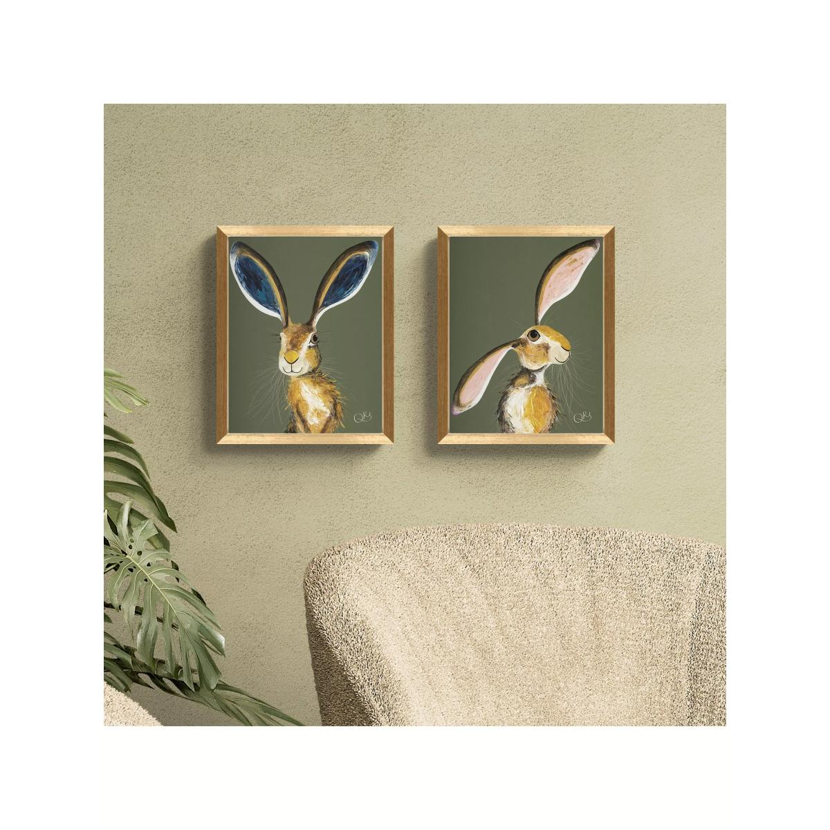 'Marley & Maisie' by artist Quinn Russell. Made in the UK, these two unglazed prints are presented in an antique gold finish frame, ready to hang on your wall. Quinn Russell lives and works in Holywood, a small town close to Belfast in Northern Ireland. Self-taught, she enjoys working in strong colours of thick and textured acrylic paint. Quinn creates unique and quirky paintings that are owned by collectors around the world. With a passion for interiors, she loves to create bespoke pieces of work for peoples' homes. The emotional response to Quinn's work is widely agreed to be 'happiness'. Have you thought about wall hooks and fittings?
