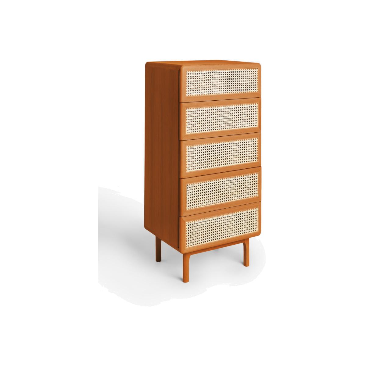 The Rattan tallboy chest is made from a combination of cherry wood and rattan. With its narrow, yet tall design which includes five spacious drawers, storage won't be a problem. It makes for a practical and effortlessly stylish addition to your room. Want to see it first? You may want to see and get a feel for the furniture in one of our shops before ordering. We'll be able to tell you where the range you'd like to view is on display.