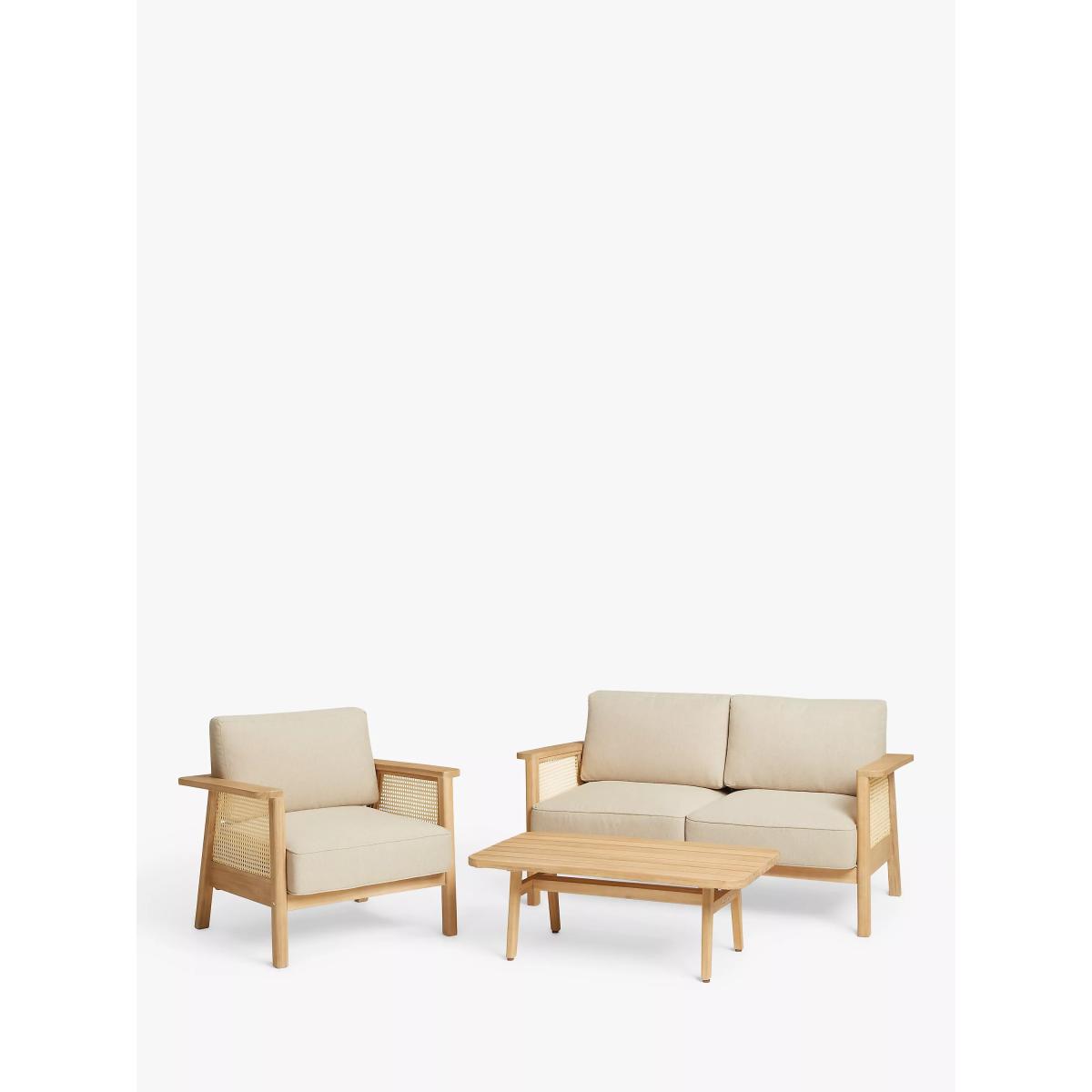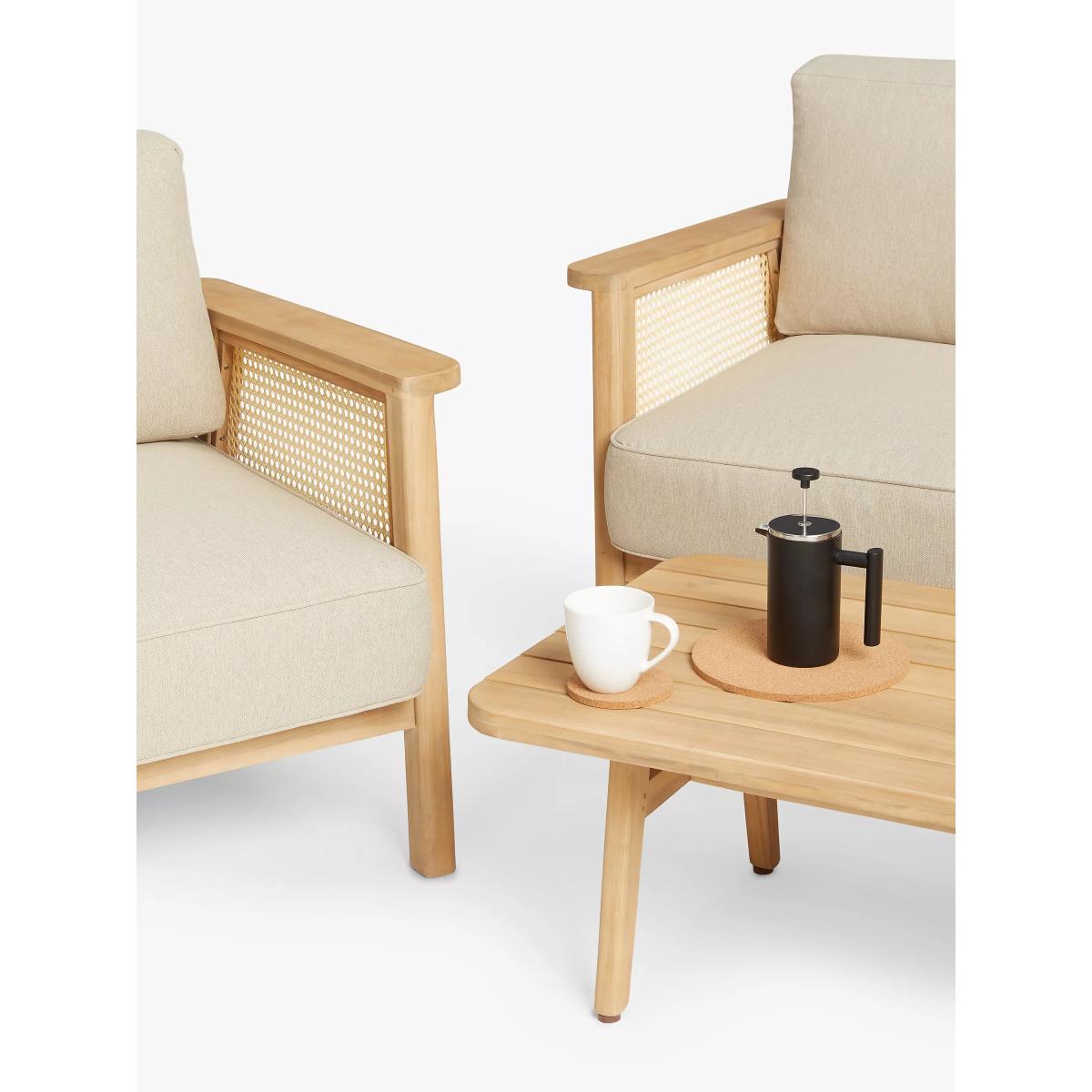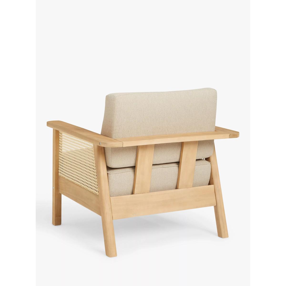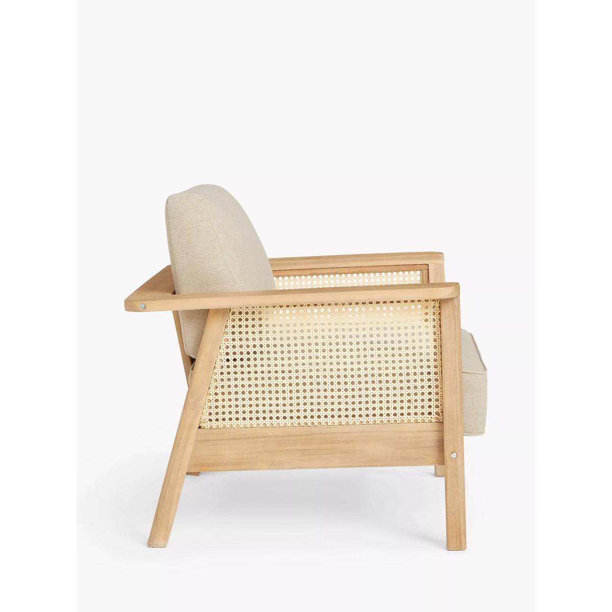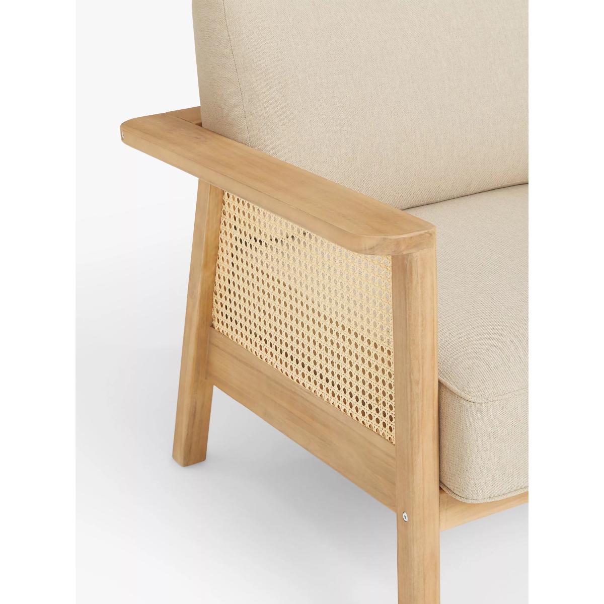 Suitable for the garden or conservatory, our Rattan garden furniture is made of naturally weather-resistant FSC-certified acacia wood with rounded corners and generous armrests. Traditional rattan-style panels add a tactile touch with an airy, light design and durable finish for outdoor use. Removable shower-resistant seat and backrest cushions in a neutral tone are included, providing sumptuous comfort. "We love the natural look and feel of rattan. We've added basket weave side panels on the seating here, with generous arms and upholstery." — designer Ryan Jewell-Sorrell, John Lewis Design Studio. Key features: Garden lounge chair Naturally weather-resistant acacia wood frame and legs Synthetic rattan panels Sumptuous shower-resistant seat and backrest cushions included Suitable for indoor and outdoor use Designed by Partners in our John Lewis Design Studio Matches outdoor furniture in our Rattan range Garden furniture care: To keep your outdoor furniture in the best condition, store it in a cool, dry, well-ventilated spot indoors over the winter. If it’s staying outside, use an outdoor furniture cover whenever the weather is wet or unseasonal. Make sure furniture is clean and dry before storing it away, and keep cushions in a clean and dry place when not in use. By choosing this product you are supporting responsible management of the world's forests. The Forest Stewardship Council® (FSC®) is a global, not-for-profit organisation that helps take care of forests and the people and wildlife that call them home. To learn more, visit fsc.org. Choose the perfect outdoor furniture We have a selection of wooden furniture for you to choose from which will suit the home or garden. Below are a few options to consider when choosing your perfect outdoor furniture. Teak (Best)A premium and popular wood with an attractive appearance which ages beautifully. Strong, durable and resistant to rot and decay, this furniture requires little maintenanceEucalyptus (Better)Distinctive scent and appearance which darkens as it ages. Provides similar natural benefits to teak including moisture resistance, hardness and durability. It's plentiful in supply which makes the furniture an inexpensive choice Acacia (Good)Naturally durable, this wood is incredibly hard and is unlikely to suffer damage during everyday use. It provides similar natural benefits to teak, yet unlike many other hardwoods, acacia is also relatively fast growing which minimises the environmental impact.