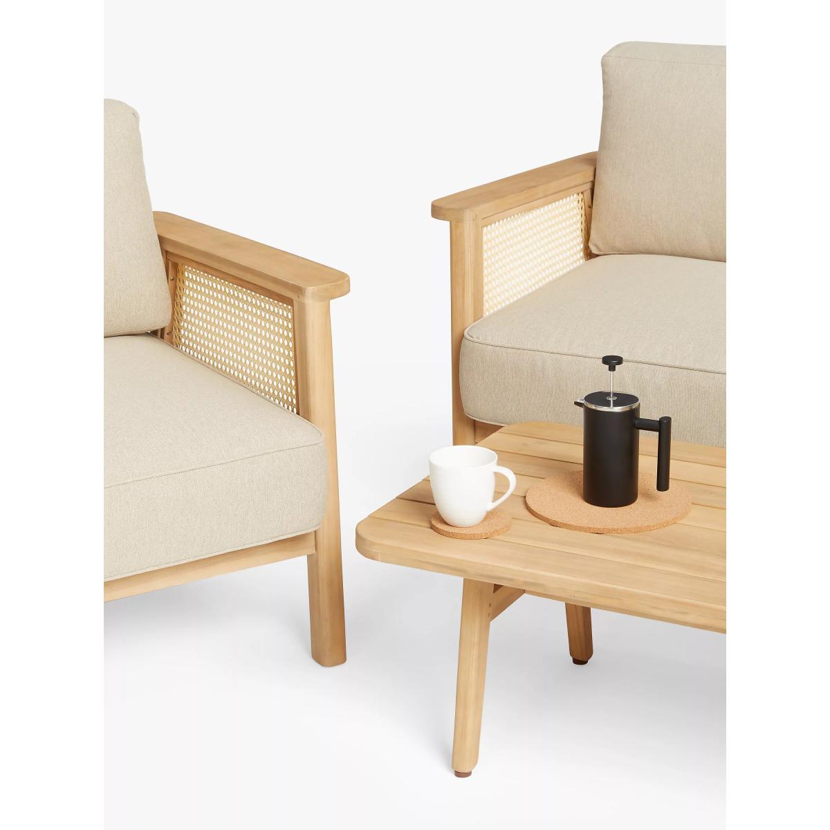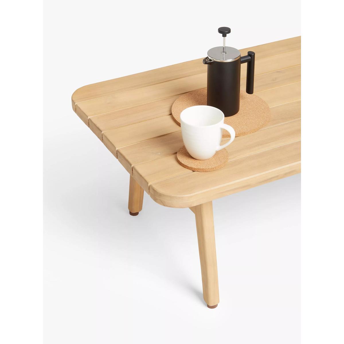 Suitable for the garden or conservatory, our Rattan garden furniture is made of naturally weather-resistant FSC-certified acacia wood with rounded corners. Key features: Rectangular garden coffee table Naturally weather-resistant acacia wood Protective furniture leg caps Suitable for indoor and outdoor use Designed by Partners in our John Lewis Design Studio Matches outdoor furniture in our Rattan range Garden furniture care: To keep your outdoor furniture in the best condition, store it in a cool, dry, well-ventilated spot indoors over the winter. If it’s staying outside, use an outdoor furniture cover whenever the weather is wet or unseasonal. Make sure furniture is clean and dry before storing it away. By choosing this product you are supporting responsible management of the world's forests. The Forest Stewardship Council® (FSC®) is a global, not-for-profit organisation that helps take care of forests and the people and wildlife that call them home. To learn more, visit fsc.org. Choose the perfect outdoor furniture We have a selection of wooden furniture for you to choose from which will suit the home or garden. Below are a few options to consider when choosing your perfect outdoor furniture. TeakA premium and popular wood with an attractive appearance which ages beautifully. Strong, durable and resistant to rot and decay, this furniture requires little maintenanceEucalyptusDistinctive scent and appearance which darkens as it ages. Provides similar natural benefits to teak including moisture resistance, hardness and durability. It's plentiful in supply which makes the furniture an inexpensive choice. AcaciaNaturally durable, this wood is incredibly hard and is unlikely to suffer damage during everyday use. It provides similar natural benefits to teak, yet unlike many other hardwoods, acacia is also relatively fast growing which minimises the environmental impact.