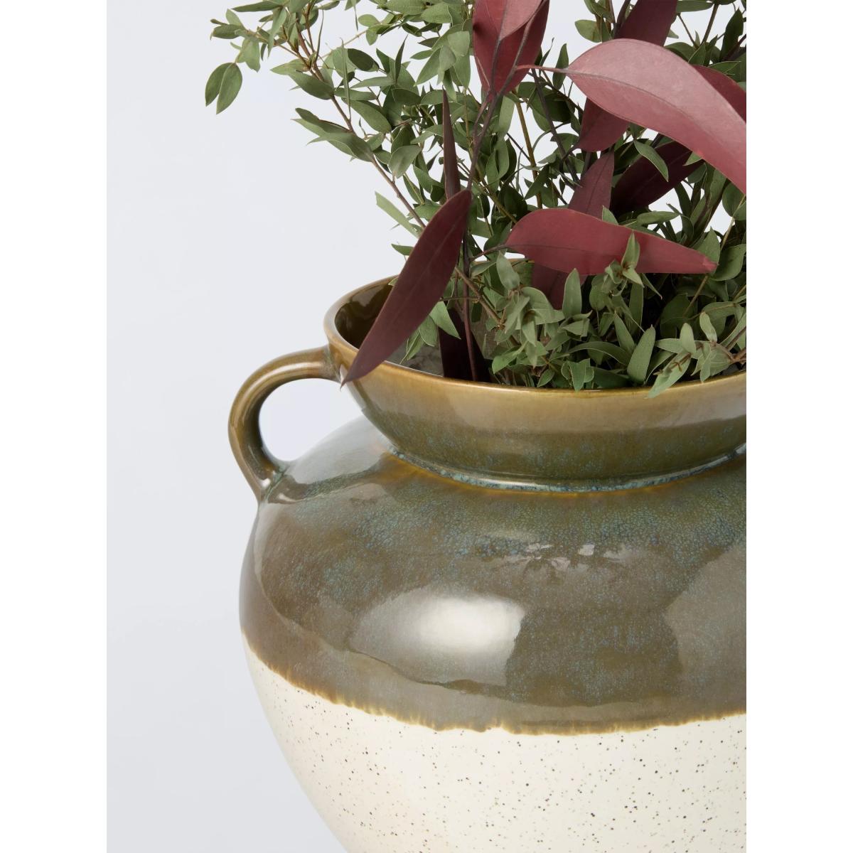Earthenware vase with small handles to make it a traditional urn shape. The two-tone glaze adds a modern twist. The reactive glaze creates slight variations from item to item, making each piece unique. Great for medium-sized floral or foliage displays or as a standalone ornament.