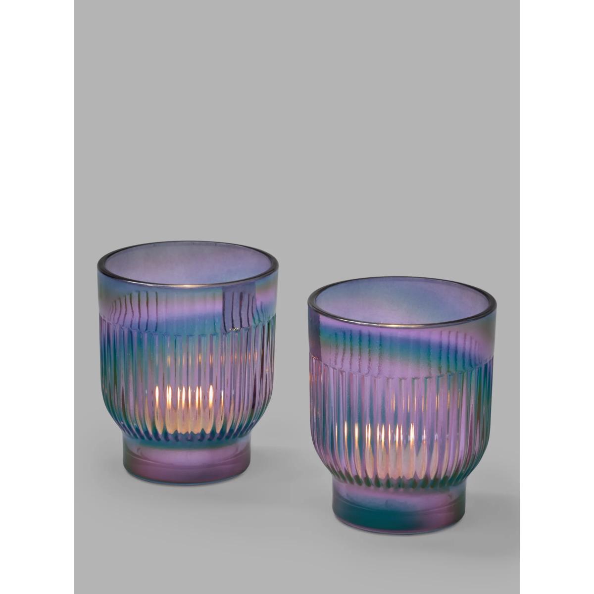 Pair of iridescent ribbed glass candle holders that catch the light. Add two tealight candles for a festive feel.