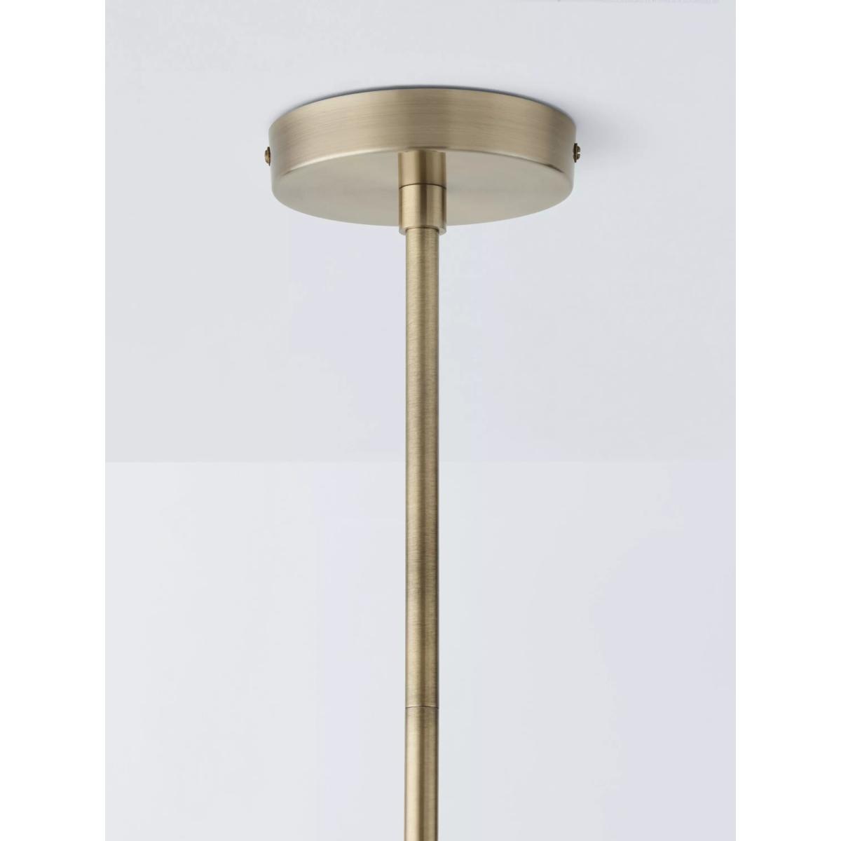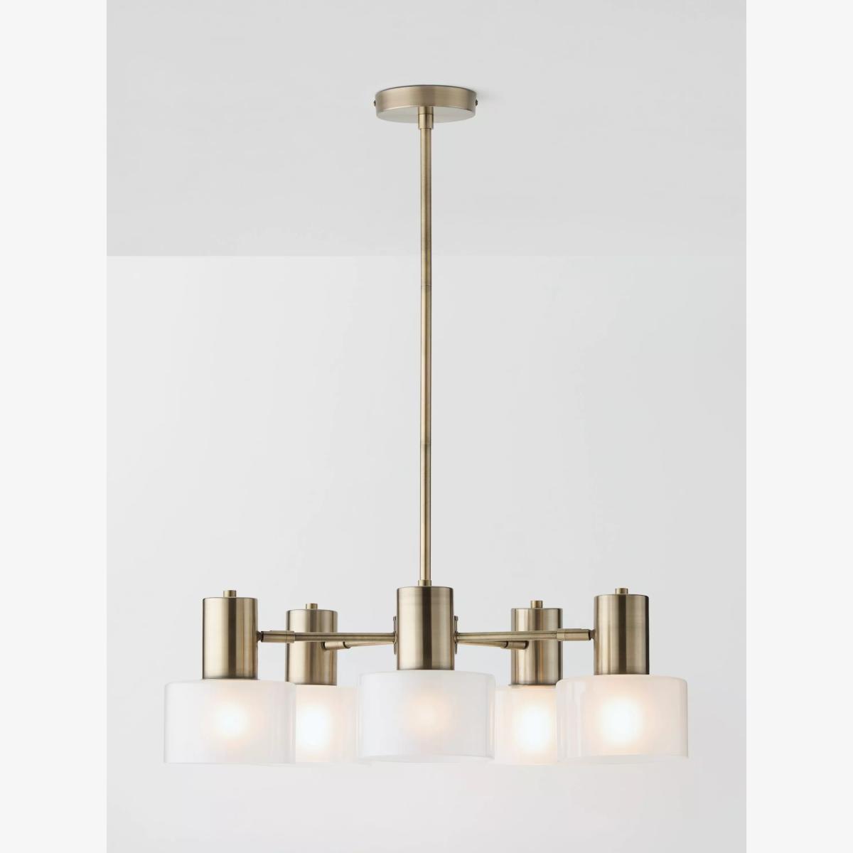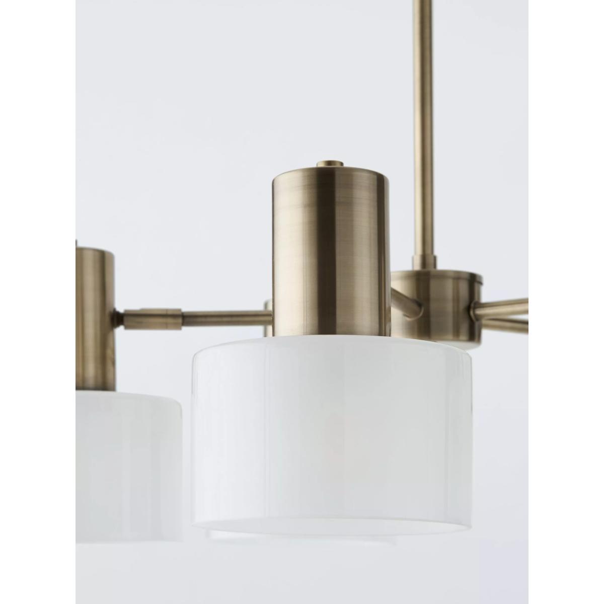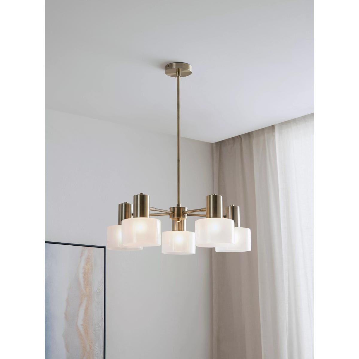 The Rodos 5-Arm Chandelier is a masterful blend of elegance and versatility with its timeless look and adjustable design. This chandelier showcases an Antique Brass finish that creates a feel of vintage charm and sophistication. Its five glass shades create a captivating contrast, with glossy white exteriors exuding contemporary flair. The frosted interiors diffuse a soft and inviting glow. Each of the five shades can be positioned independently, allowing you to craft a tailored lighting arrangement. Included are two extra 8-inch (20cm) poles, enabling you to adapt the lamp's height to match your ceiling height perfectly. With its timeless design and understated elegance, the Rodos Chandelier enhances the ambience of your space, illuminating it with sophistication and adaptability.