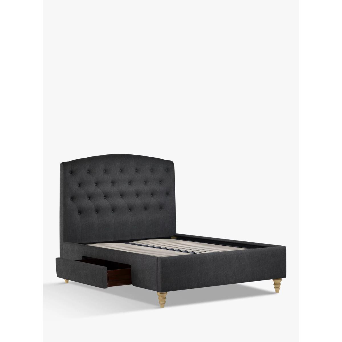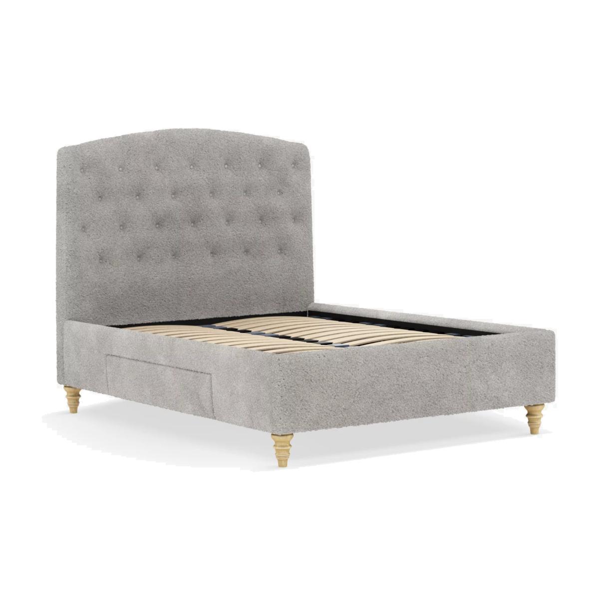Our Rouen storage bed frame has a classic design that's enhanced with button detailing across the headboard. There's a soft-close drawer on either side of the frame that's brilliant for storing spare linens. Sprung slats provide additional support for you and your mattress. Built with Smart Slats This bed frame is designed with wider slats at the shoulders, lumbar and feet. They provide maximum support for you and your mattress so that you experience perfect spinal alignment while you sleep. The standard slat caps are black so we have added grey slat caps to ensure that you know where to place the wider slats. Choose from one of our fabrics: Our Band A fabric, Cotton Effect has a laid-back and fine-textured look that looks like cotton, but it's made from durable polyester fibres Our Band A fabric, Brushed Tweed is made with a brushed herringbone weave that has a cosy wool look and soft 'peach skin' feel. It's really hard-wearing and a brilliant all-rounder Our Band A fabric, Soft Weave has a casual cotton look with a brushed finish that's soft-to-touch and a suble texture that's created by slight variations in the tones of the woven fibres Our Band B fabric, Deep Velvet will bring warmth and luxury to your bedroom. It's a short pile velvet with a soft, plush feel Our Band B fabric, Soft Touch Chenille is made from a blend of fibres that give it a super-soft feel and added durability Our Band B fabric, Boucle is luxe and oh-so cosy. This plush knitted fabric is super-soft and durable with a thick texture that calls for comfort Our Band B fabric, Deep Velvet will bring warmth and luxury to your bedroom. It's a short pile velvet with a soft, plush feel Our Band B fabric, Mole is a soft and cosy woven wool-blend. Piling and bobbling may occur naturally over time Our Band B fabric, Cord is rich in texture and available in neutral shades that will suit every space. Our Band B fabric, Relaxed Linen gives you the fine texture of cotton, the durability of synthetic fibres and the laid-back look of linen Our Band C fabric, Marylamb is woven from both man-made and natural fibres, creating a tactile and soft-touch feel. Our Band C fabric, Aquaclean Velvet will liven up your bedroom. It's plush, available in a range of bold colours and treated with Aquaclean so that it can be wiped clean with just water. A smart choice for families and those with pets Want to see it first? You may want to see and get a feel for the furniture before ordering. Pop into one of our shops to see the full range of colours and fabrics on offer. We'll be able to tell you where the range you'd like to view is on display.