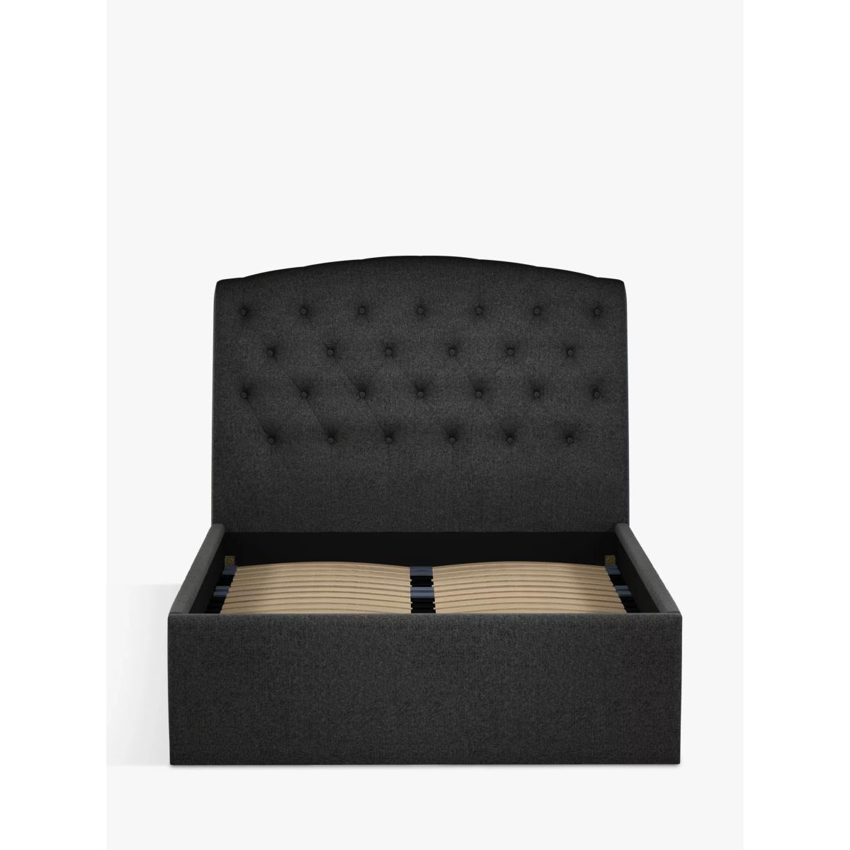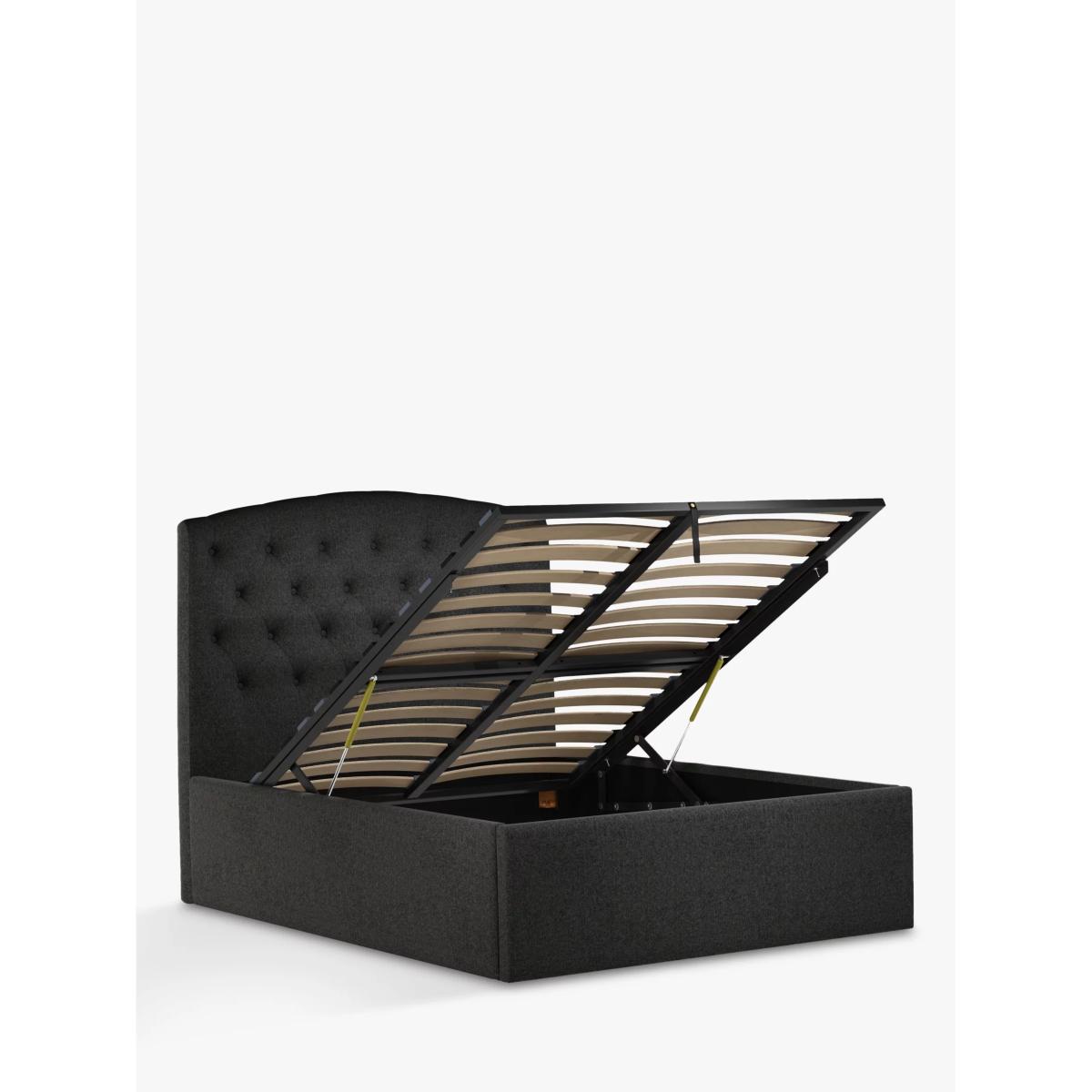 Our Rouen ottoman storage bed frame has a classic design that's enhanced with button detailing across the headboard. A handle and hydraulic arms facilitate an easy manual lift-up, revealing a functional and spacious storage space for spare linens. Sprung slats provide additional support for you and your mattress. Built with Smart Slats This bed frame is designed with wider slats at the shoulders, lumbar and feet. They provide maximum support for you and your mattress so that you experience perfect spinal alignment while you sleep. The standard slat caps are black so we have added grey slat caps to ensure that you know where to place the wider slats. Choose from one of our fabrics: Our Band A fabric, Cotton Effect has a laid-back and fine-textured look that looks like cotton, but it's made from durable polyester fibres Our Band A fabric, Brushed Tweed is made with a brushed herringbone weave that has a cosy wool look and soft 'peach skin' feel. It's really hard-wearing and a brilliant all-rounder Our Band A fabric, Soft Weave has a casual cotton look with a brushed finish that's soft-to-touch and a suble texture that's created by slight variations in the tones of the woven fibres Our Band B fabric, Soft Touch Chenille is made from a blend of fibres that give it a super-soft feel and added durability Our Band B fabric, Boucle is luxe and oh-so cosy. This plush knitted fabric is super-soft and durable with a thick texture that calls for comfort Our Band B fabric, Deep Velvet will bring warmth and luxury to your bedroom. It's a short pile velvet with a soft, plush feel Our Band B fabric, Mole is a soft and cosy woven wool-blend. Piling and bobbling may occur naturally over time Our Band B fabric, Cord is rich in texture and available in neutral shades that will suit every space. Our Band B fabric, Relaxed Linen gives you the fine texture of cotton, the durability of synthetic fibres and the laid-back look of linen Our Band C fabric, Marylamb is woven from both man-made and natural fibres, creating a tactile and soft-touch feel. Our Band C fabric, Aquaclean Velvet will liven up your bedroom. It's plush, available in a range of bold colours and treated with Aquaclean so that it can be wiped clean with just water. A smart choice for families and those with pets Want to see it first? You may want to see and get a feel for the furniture before ordering. Pop into one of our shops to see the full range of colours and fabrics on offer. We'll be able to tell you where the range you'd like to view is on display.