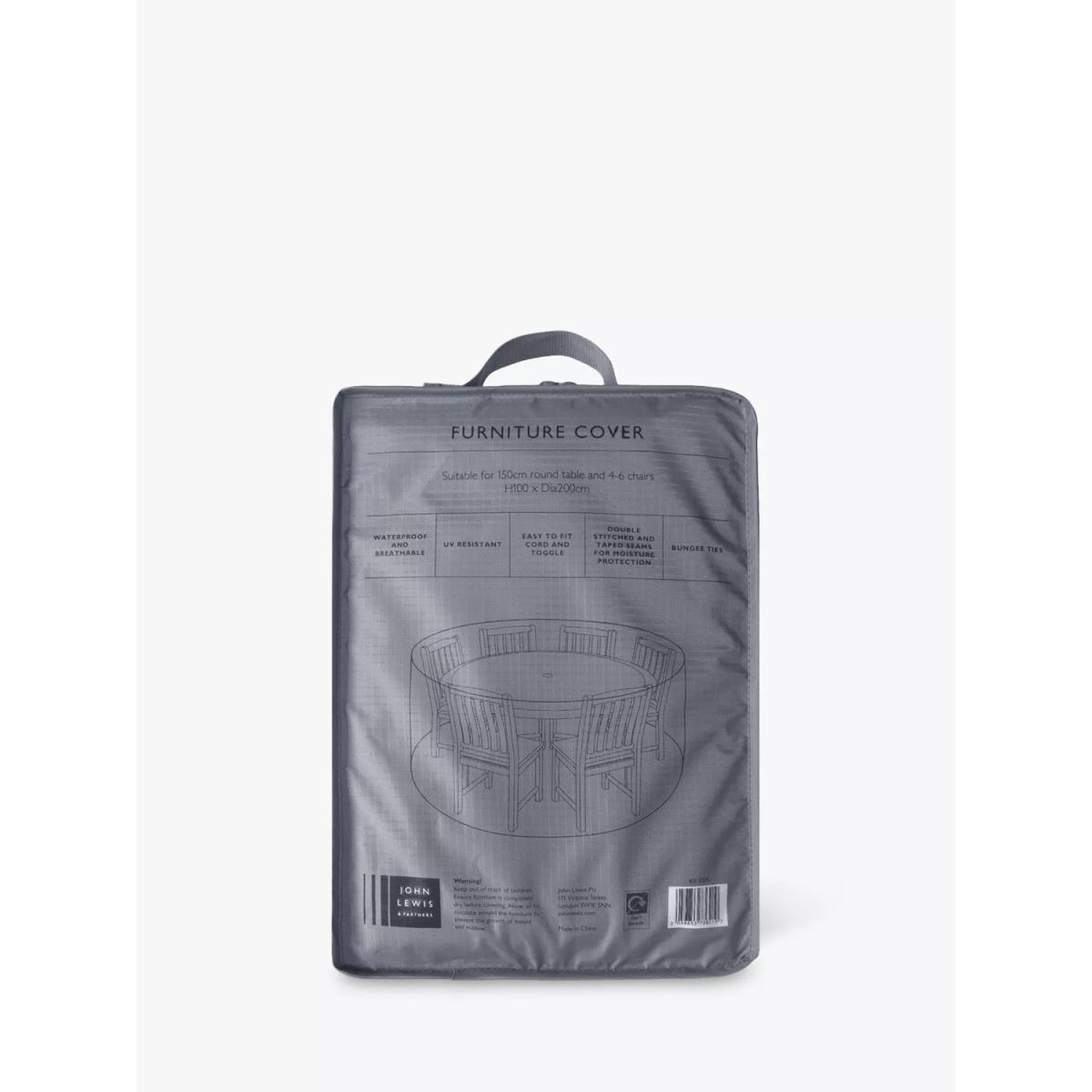 A protective cover for the John Lewis 150cm round garden table and four to six chairs set. It's waterproof with taped seams for better protection yet breathable with built-in ventilation to prevent mildew. The cover comes with a cord toggle and bungee ties for an easy, secure fit. Made from strong 420. D polyester with UV30+ sun protection for all-year-round use.