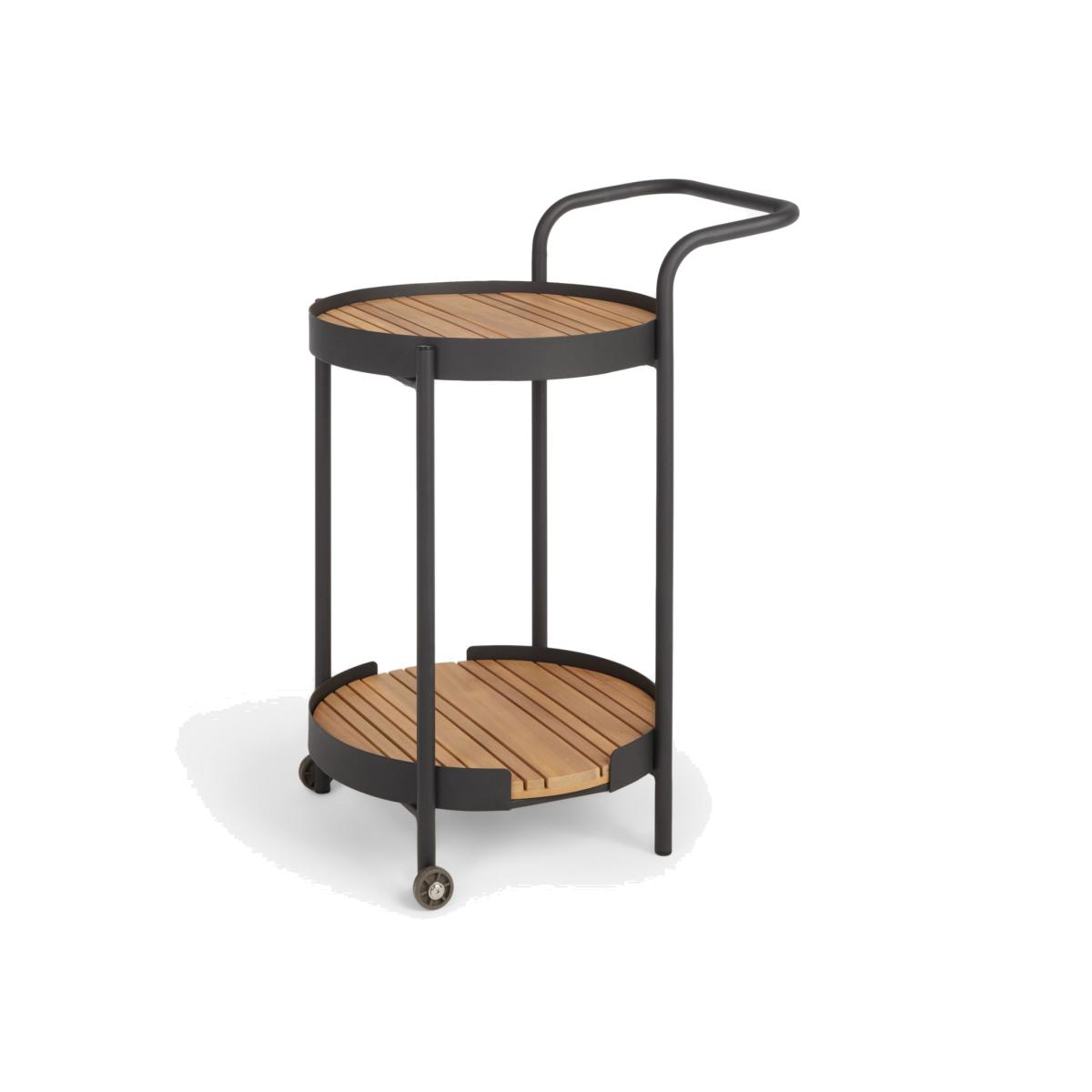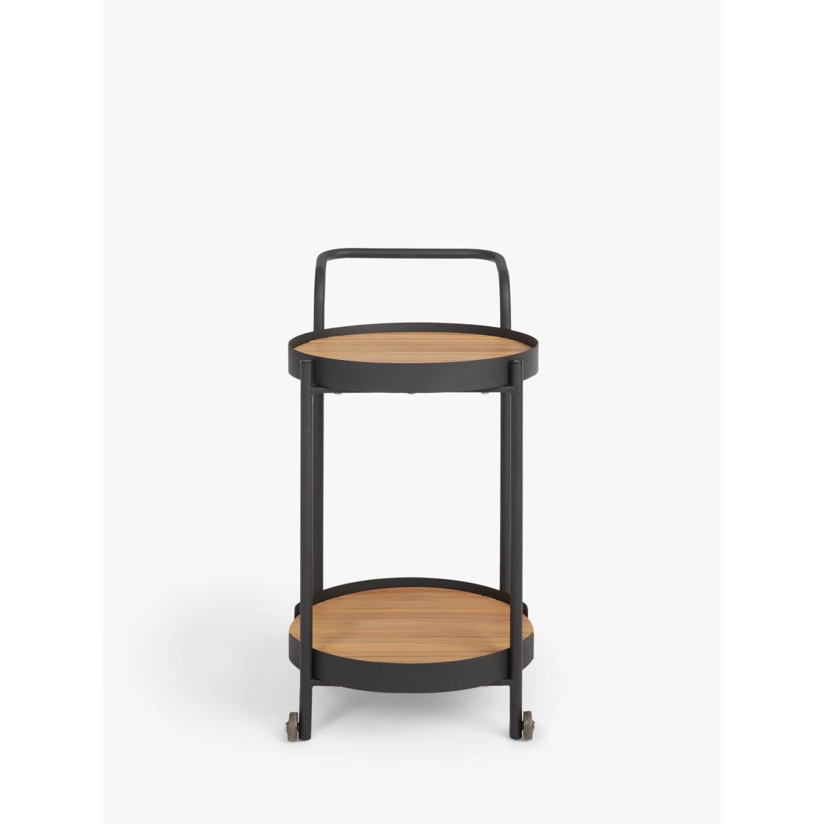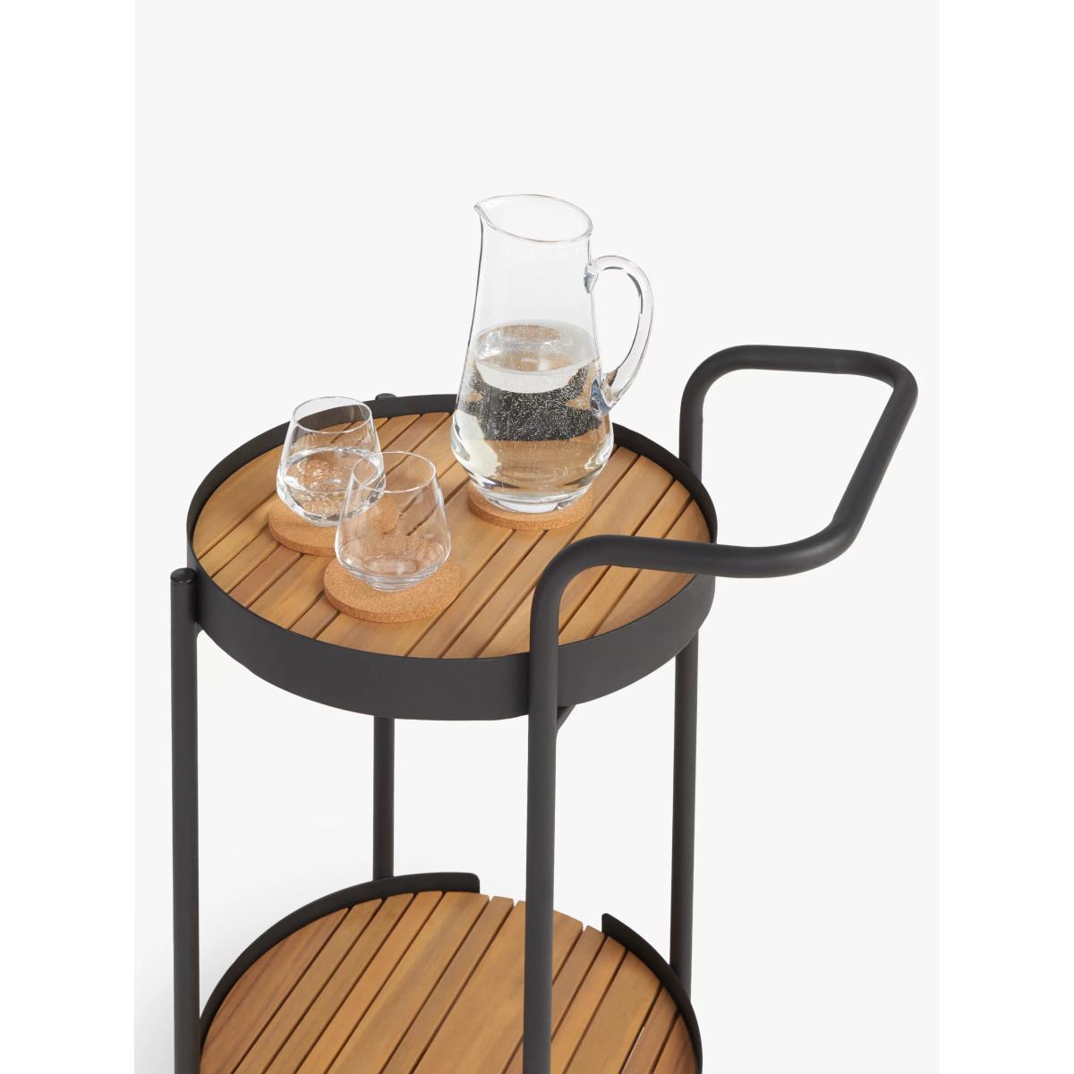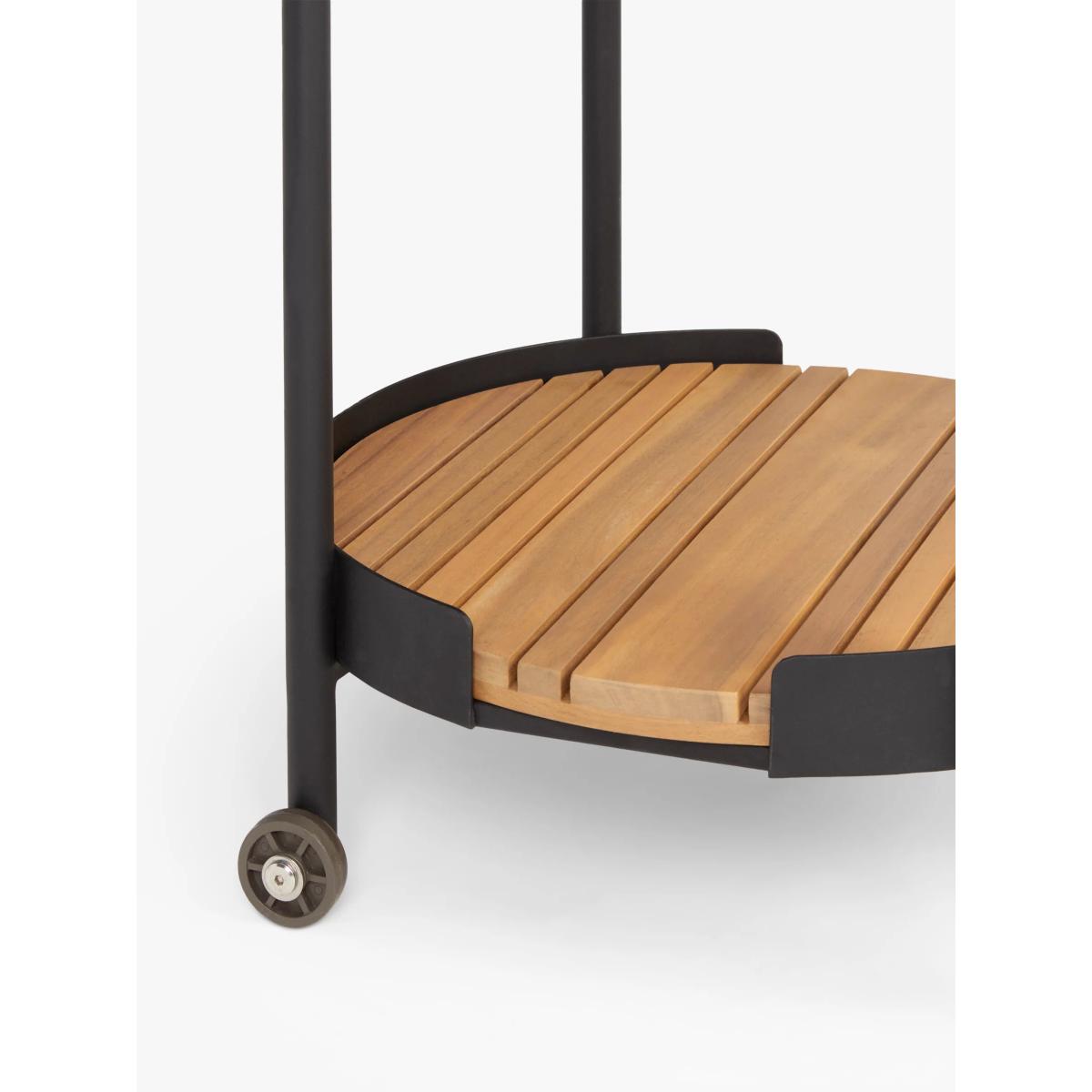 Perfect for parties outdoors, this bar cart has a robust and weather-resistant powder-coated steel frame. The round top and lower shelves are made of naturally weather-resistant FSC-certified acacia wood. This contemporary and sturdy design features two transporter wheels so it's easy to pull up to the garden table, ready for happy hour and sundowners. Key features: Garden bar trolley with two levels Robust powder-coated steel frame Naturally weather-resistant FSC-certified acacia wood Two transporter wheels Garden furniture care: To keep your outdoor furniture in the best condition, store it in a cool, dry, well-ventilated spot indoors over the winter. If it's staying outside, use an outdoor furniture cover whenever the weather is wet or unseasonal. Make sure furniture is clean and dry before storing it away. By choosing this product you are supporting responsible management of the world's forests. The Forest Stewardship Council® (FSC®) is a global, not-for-profit organisation that helps take care of forests and the people and wildlife that call them home. To learn more, visit fsc.org. Choose the perfect outdoor furniture We have a selection of wooden furniture for you to choose from which will suit the home or garden. Below are a few options to consider when choosing your perfect outdoor furniture. TeakA premium and popular wood with an attractive appearance which ages beautifully. Strong, durable and resistant to rot and decay, this furniture requires little maintenanceEucalyptusDistinctive scent and appearance which darkens as it ages. Provides similar natural benefits to teak including moisture resistance, hardness and durability. It's plentiful in supply which makes the furniture an inexpensive choice. AcaciaNaturally durable, this wood is incredibly hard and is unlikely to suffer damage during everyday use. It provides similar natural benefits to teak, yet unlike many other hardwoods, acacia is also relatively fast growing which minimises the environmental impact.