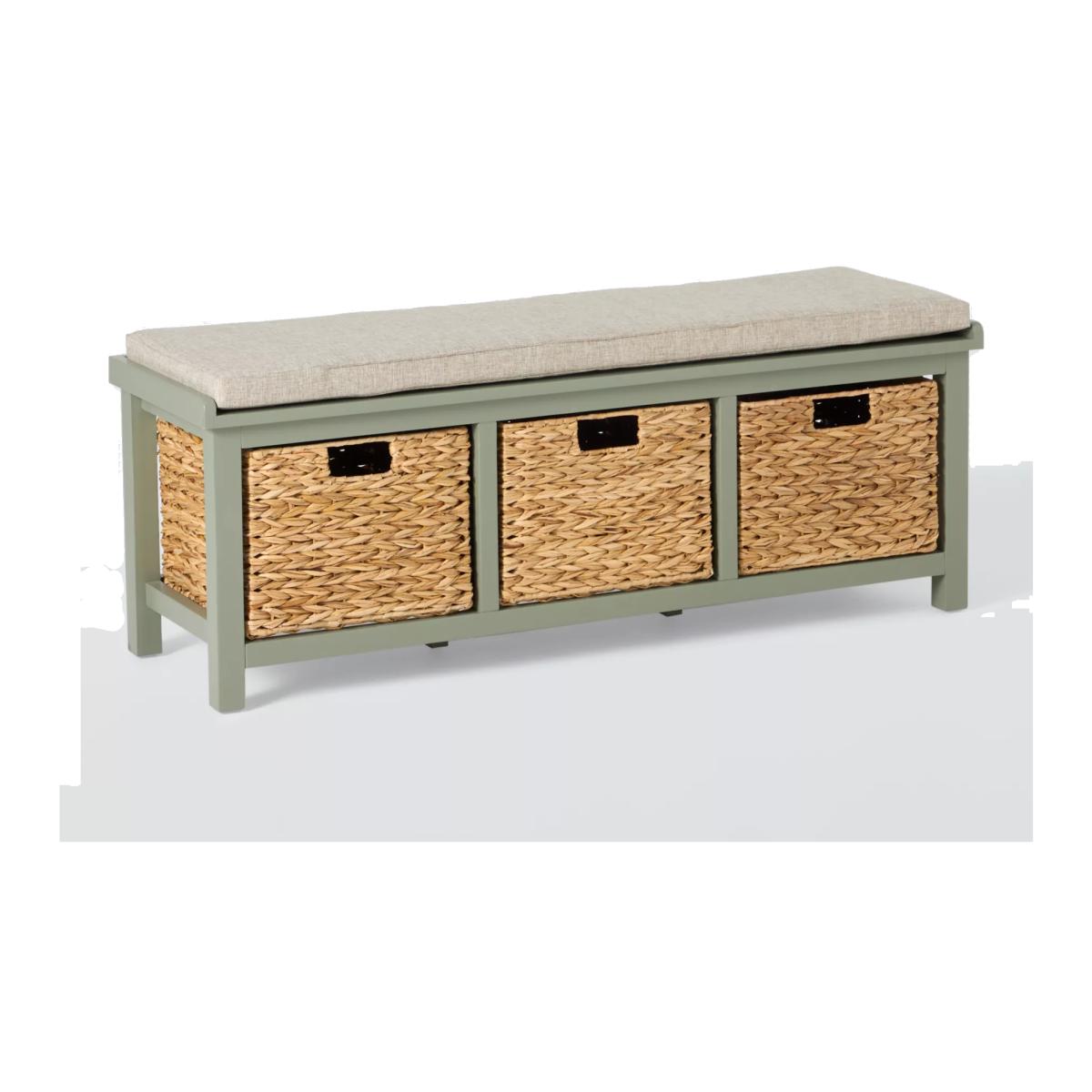 This sturdy rubberwood bench features 3 deep, woven seagreass baskets for storing shoes and other accessories neatly out of sight and there's a comfy seat pad on the top. Fast-growing seagrass is hand-woven by highly skilled artisans. Its durability and strength make it ideal for basket-weaving.