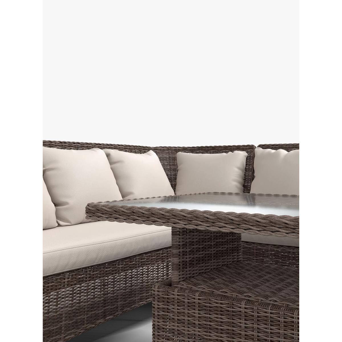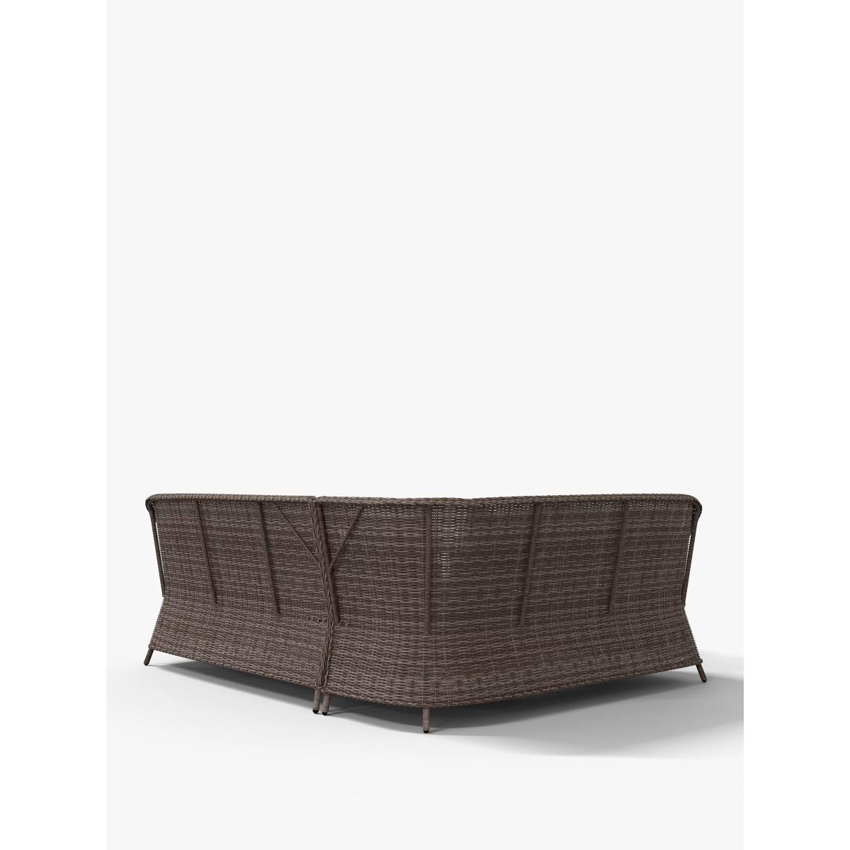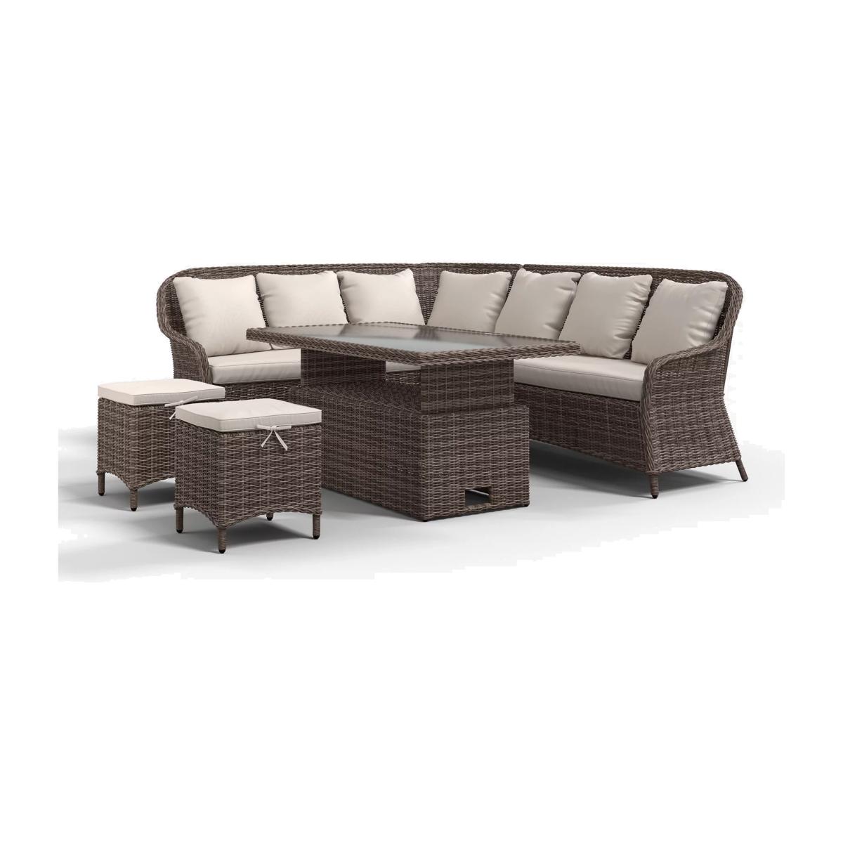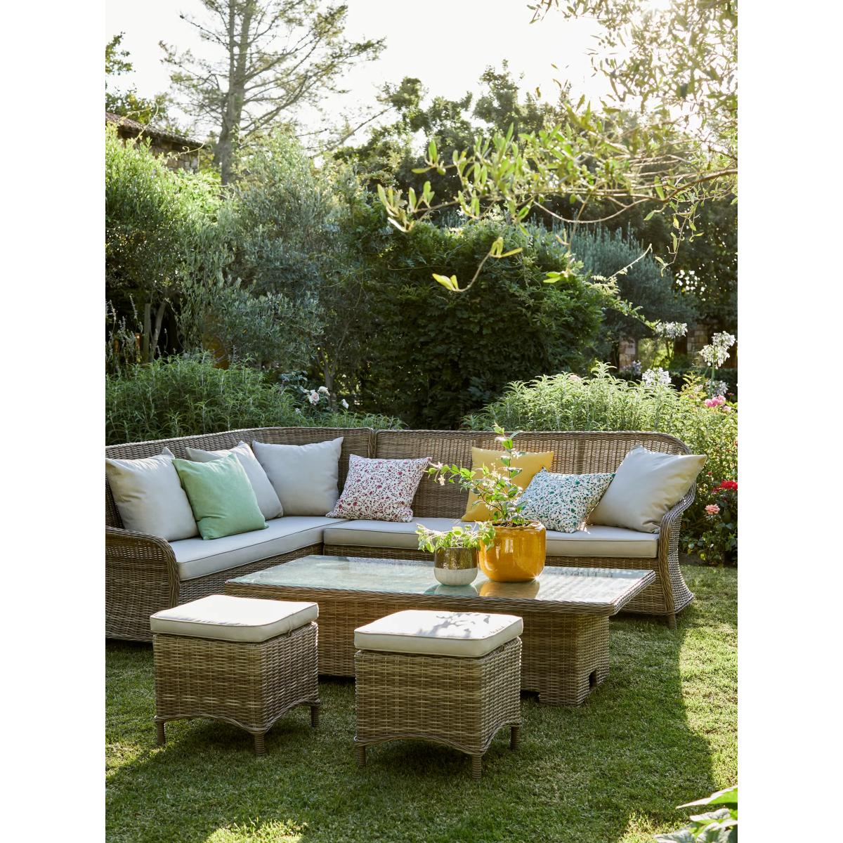 The attractive curved design of our Rye range is made using synthetic wicker, which has the look and feel of traditional rattan garden furniture but with long-lasting quality. Easy to maintain, the furniture is made with sturdy aluminium frames and resin wicker is applied by hand with a mix of 5mm round weave and 5mm half-round weave in a natural willow-effect. The intricate handwoven design takes several days to produce and the finished results are strongly suited to outdoor spaces and conservatories. Designed for comfort, Rye seating comes with sumptuous shower-resistant cushioning. This set includes a seven-seater corner garden sofa, two ottoman footstools and a coffee table that's height adjustable for dining. Good to know: The range is durable and for outdoor use all year round. As a precaution, we recommend you cover the furniture during adverse weather. Key features: 7-seater corner garden sofa 2 ottoman footstools Table adjusts from lounging to dining height Handwoven, 5mm round synthetic wicker Robust aluminium frames Seat and back cushions included Team it with furniture from our Rye range Choose the perfect outdoor furniture We have a vast selection of furniture for you to choose from which will suit the home or garden. The majority of our furniture ranges have been hand woven using a synthetic wicker. The thinner the weave, the longer it takes for the skilled workers to complete. All weave types are durable so they’ll last throughout the seasons All woven outdoor furniture is UV protected so it will not fade in direct sunlight All woven outdoor furniture is easy to maintain, simply wipe clean using warm water FlatA weave of various widths which offers incredible value for money Half roundMore detailed with a 3D effect, the half round is a round weave in half which displays a wicker appearance on the top and hollowed underside Double half roundA double strand of half round, this is a wider width of weave which achieves an expensive appearanceRound weaveA very tight weave which is available in various widths, from 2mm to 5mm RopeA selection of our ranges have been made using rope. The yarn is made up of 10,000 (approx) woven strands with a double core for extreme strength, does not attract mould even if wet for a long time and is UV resistant.