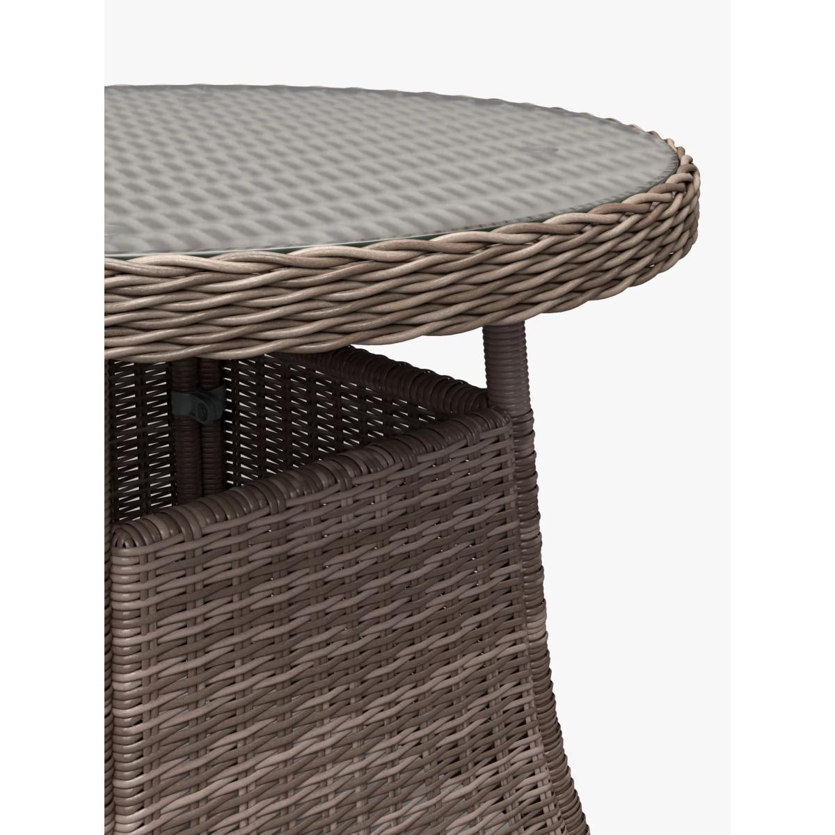 The attractive curved design of our Rye range is made using synthetic wicker, which has the look and feel of traditional rattan garden furniture but with long-lasting quality. Easy to maintain, the furniture is made with sturdy aluminium frames. The resin wicker is applied by hand with a 5mm round weave technique in a natural willow-effect. The intricate handwoven design takes several days to produce and the finished results are strongly suited to outdoor spaces and conservatories. Good to know: The range is durable and for outdoor use all year round. As a precaution, we recommend you cover the furniture during adverse weather. Key features: Round bistro table Handwoven, 5mm round synthetic wicker Robust aluminium frame Glass top tempered for strength Team it with furniture from our Rye range Want to see it first? You may want to see and get a feel for the product in one of our shops before ordering. We'll be able to tell you where the range you'd like to view is on display. Choose the perfect outdoor furniture We have a vast selection of furniture for you to choose from which will suit the home or garden. The majority of our furniture ranges have been hand woven using a synthetic wicker. The thinner the weave, the longer it takes for the skilled workers to complete. All weave types are durable so they’ll last throughout the seasons All woven outdoor furniture is UV protected so it will not fade in direct sunlight All woven outdoor furniture is easy to maintain, simply wipe clean using warm water Flat A weave of various widths which offers incredible value for money Half round More detailed with a 3D effect, the half round is a round weave in half which displays a wicker appearance on the top and hollowed underside Double half round A double strand of half round, this is a wider width of weave which achieves an expensive appearance Round weave A very tight weave which is available in various widths, from 2mm to 5mm Rope A selection of our ranges have been made using rope. The yarn is made up of 10,000 (approx) woven strands with a double core for extreme strength, does not attract mould even if wet for a long time and is UV resistant.