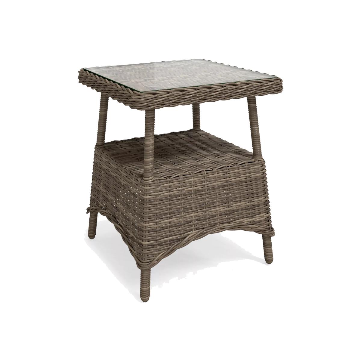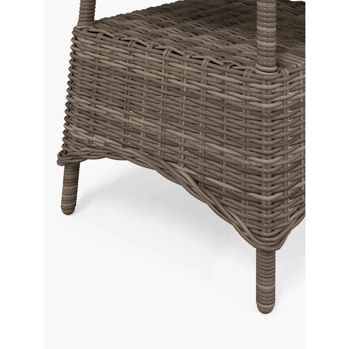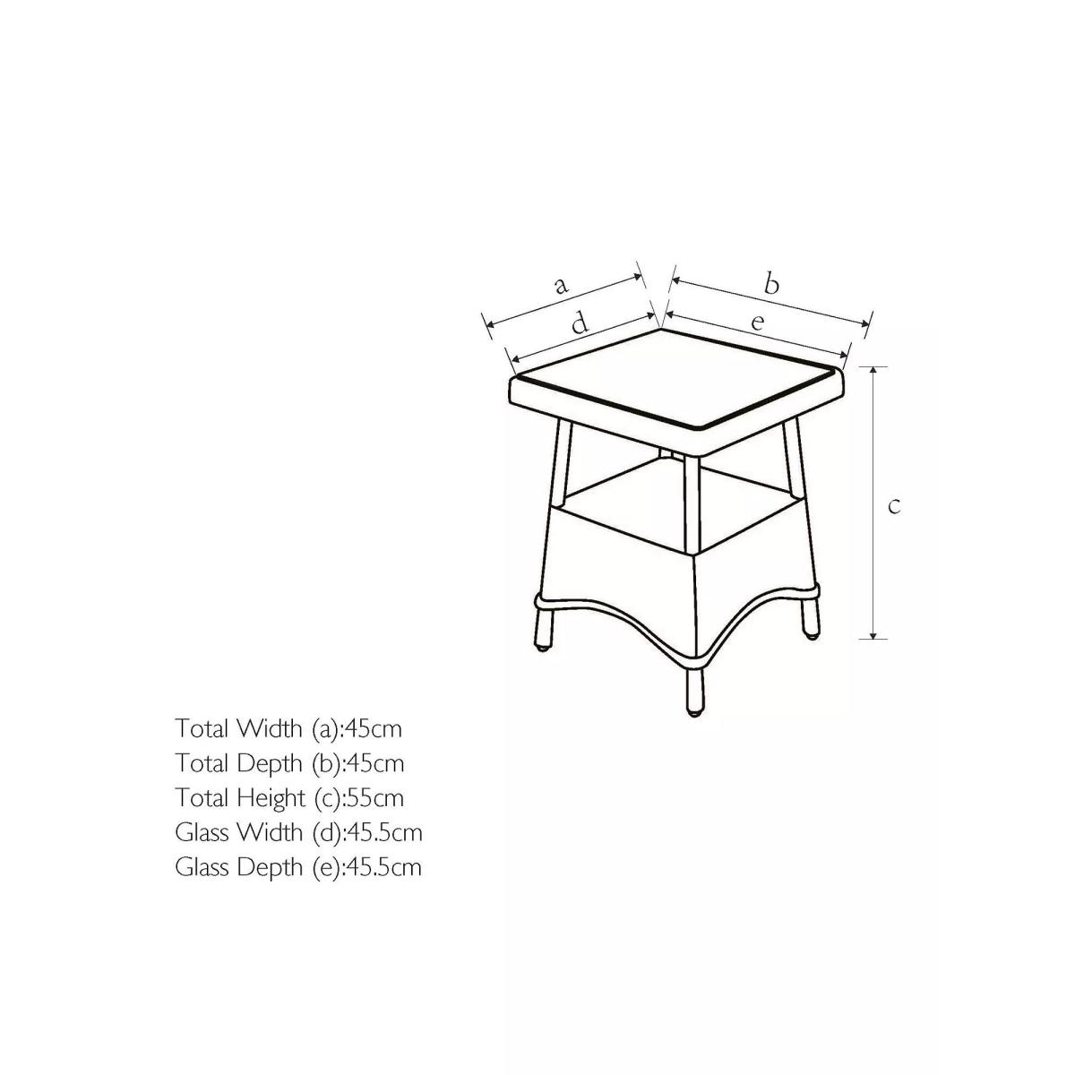 An attractive curved design, our Rye garden furniture has the look and feel of traditional woven garden furniture but with long-lasting quality. The intricate handwoven design takes several days to produce and looks at home in conservatories and outdoor spaces. The 5mm round weave has a natural willow effect. All our handwoven furniture ranges are made from synthetic wicker. This looks like natural wicker but has the advantage of being weatherproof, low maintenance, and resistant to both UV light and tearing. Key features: Square side table with shelf Handwoven, 5mm round synthetic wicker Robust aluminium frame Glass top tempered for strength Matches garden furniture in our Rye range Garden furniture care: To keep your outdoor furniture in the best condition, store it in a cool, dry, well-ventilated spot indoors over the winter. If it's staying outside, use an outdoor furniture cover whenever the weather is wet or unseasonal. Make sure furniture is clean and dry before storing it away, and keep cushions in a clean and dry place when not in use. Choose the perfect outdoor furniture We have a vast selection of furniture for you to choose from which will suit the home or garden. The majority of our furniture ranges have been hand woven using a synthetic wicker. The thinner the weave, the longer it takes for the skilled workers to complete. All weave types are durable so they’ll last throughout the seasons All woven outdoor furniture is UV protected so it will not fade in direct sunlight All woven outdoor furniture is easy to maintain, simply wipe clean using warm water FlatA weave of various widths which offers incredible value for money Half roundMore detailed with a 3D effect, the half round is a round weave in half which displays a wicker appearance on the top and hollowed underside Double half roundA double strand of half round, this is a wider width of weave which achieves an expensive appearanceRound weaveA very tight weave which is available in various widths, from 2mm to 5mm RopeA selection of our ranges have been made using rope. The yarn is made up of 10,000 (approx) woven strands with a double core for extreme strength, does not attract mould even if wet for a long time and is UV resistant.