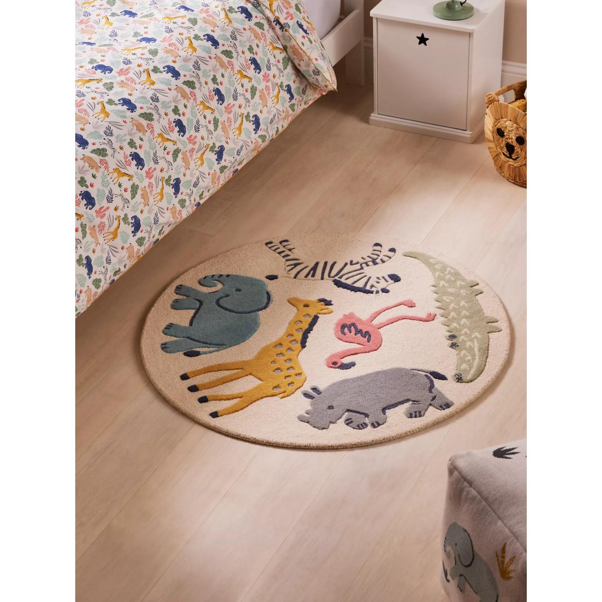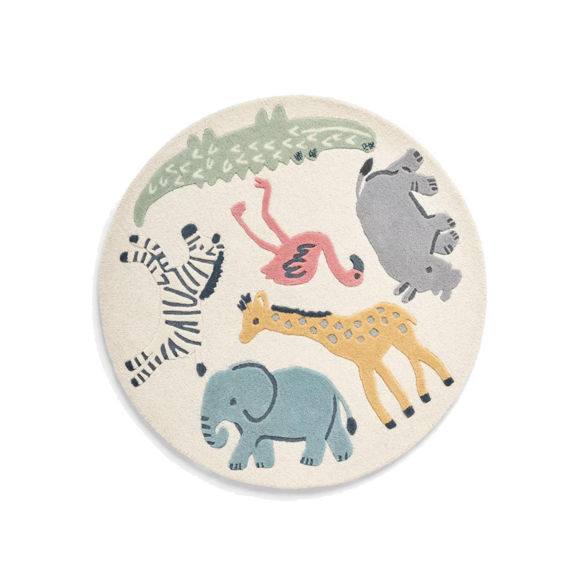 I love the round safari rug for its durable New Zealand wool pile and friendly animal motif. At 1 metre across it’s just right for defining a play corner or reading nook in a nursery or children’s bedroom, and the muted greens, greys and soft pinks work with both pastel and Scandi-style schemes. For practical styling, layer it under a low table or beside a small armchair to create a cosy spot, or position it under toy baskets to keep things contained. Always use a non-slip underlay for safety, and consider a washable play mat on top if you expect lots of spills.