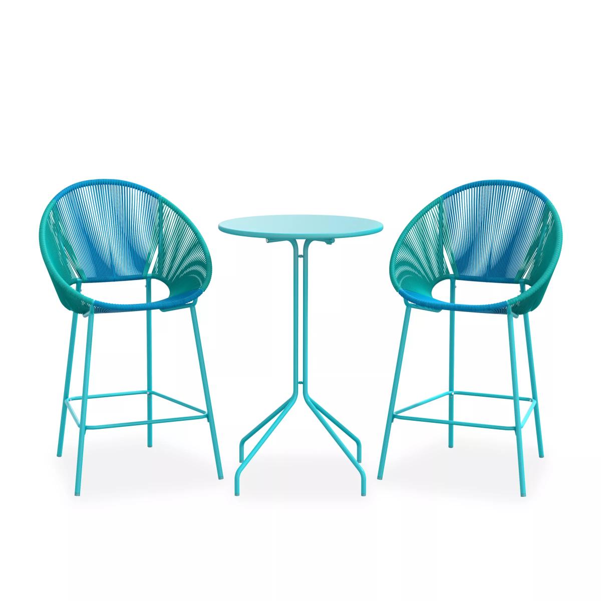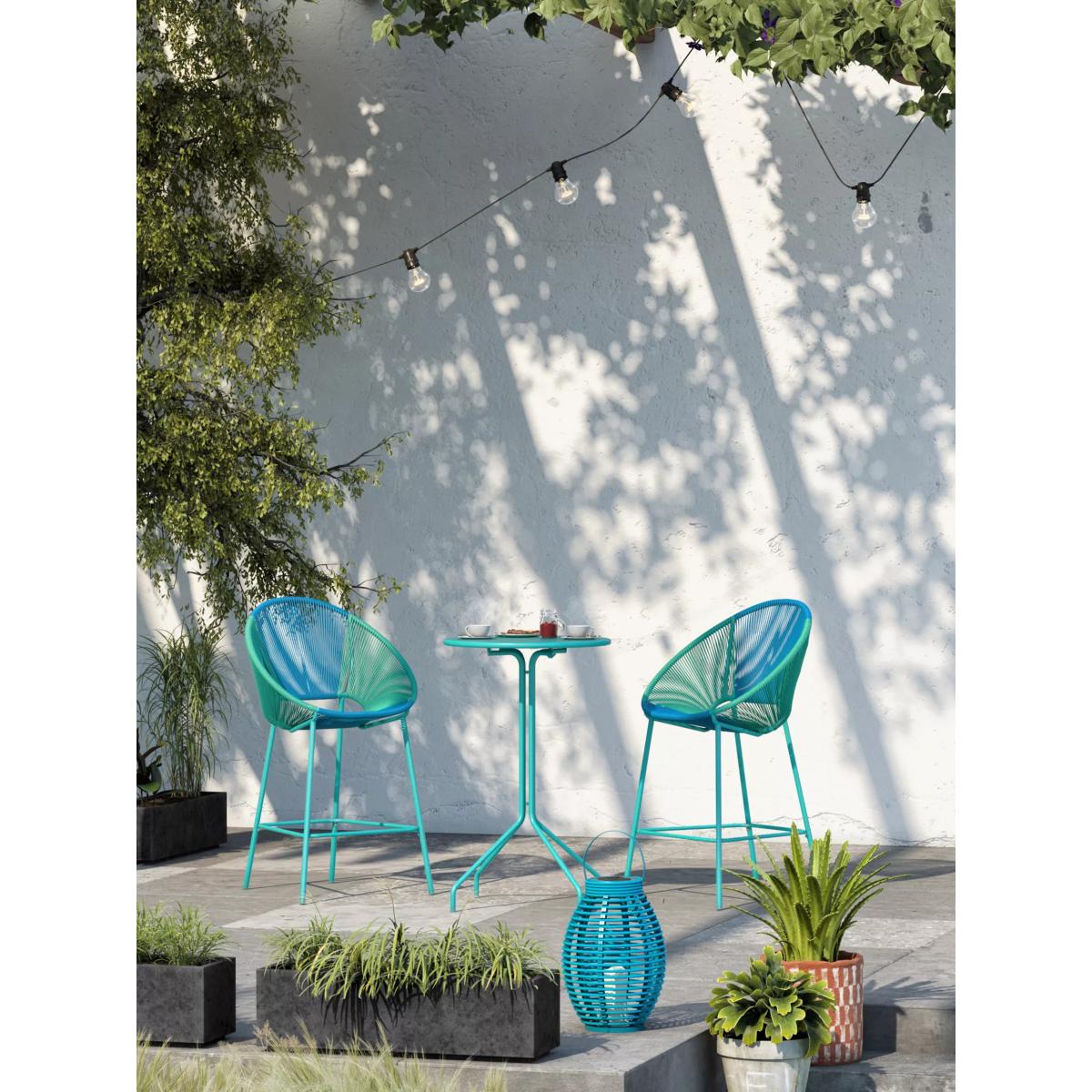 Bringing bold colours to outdoor spaces, our Salsa range of garden furniture features an updated rattan design. This Salsa two-seater bar table and chairs set is available in a choice of trend colours to enliven garden patios or conservatories. Thanks to its steel and polyweave construction, it's both durable and weather-resistant. To extend the product life and appearance, it is recommended to store the furniture in a cool dry, well-ventilated place such as a garage or shed over winter or during periods of unseasonal weather. Ensure that the furniture is clean and completely dry before storing. The steel chair legs and frame are sturdy and tested to withstand a weight of up to 160kg (25 stone) each, exceeding the industry standard. The robust design allows the rattan to form its shape, with a dense weave ensuring comfortable support. Key features: Two tall garden bar chairs Tall round garden bar table Durable and weather-resistant Bold colours in a contemporary design Robust steel frames Dense weave for comfortable support Seat height: 67.5cm