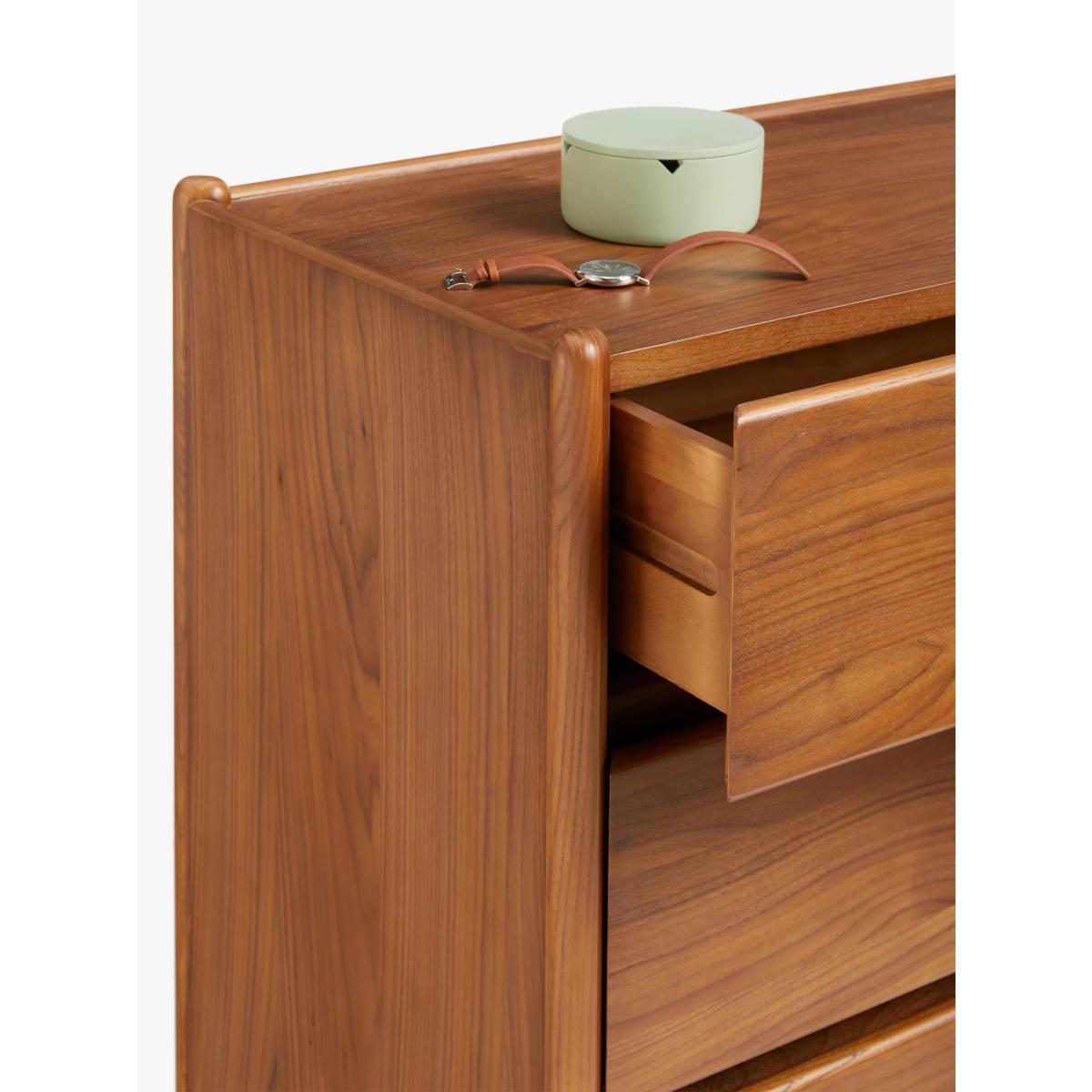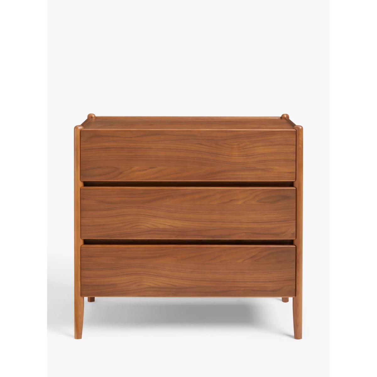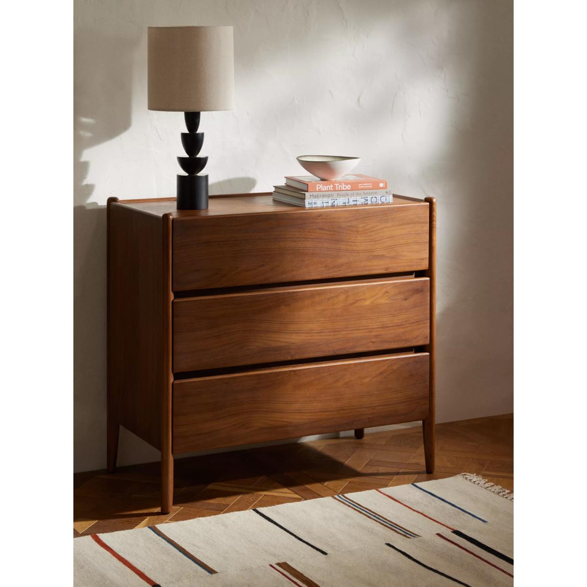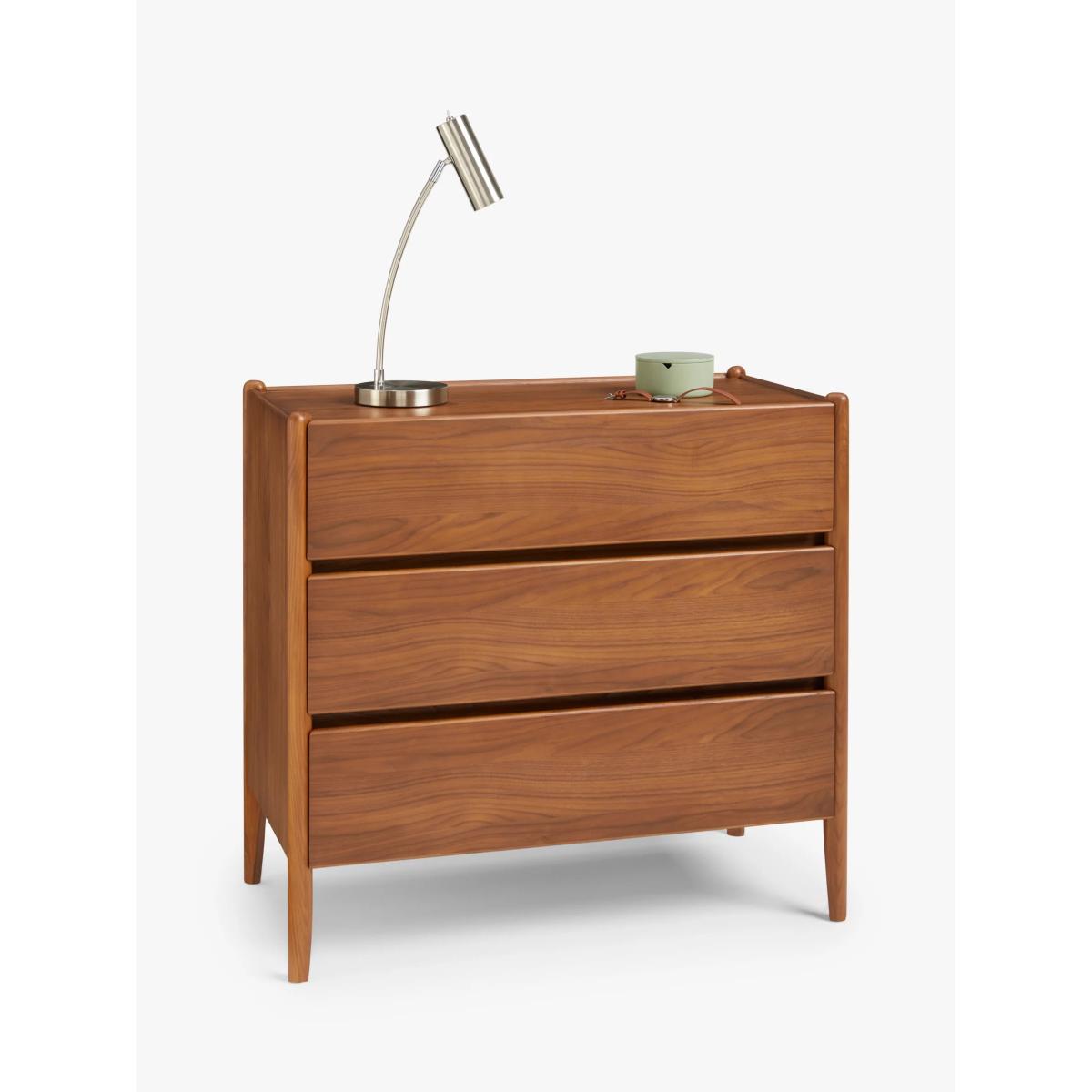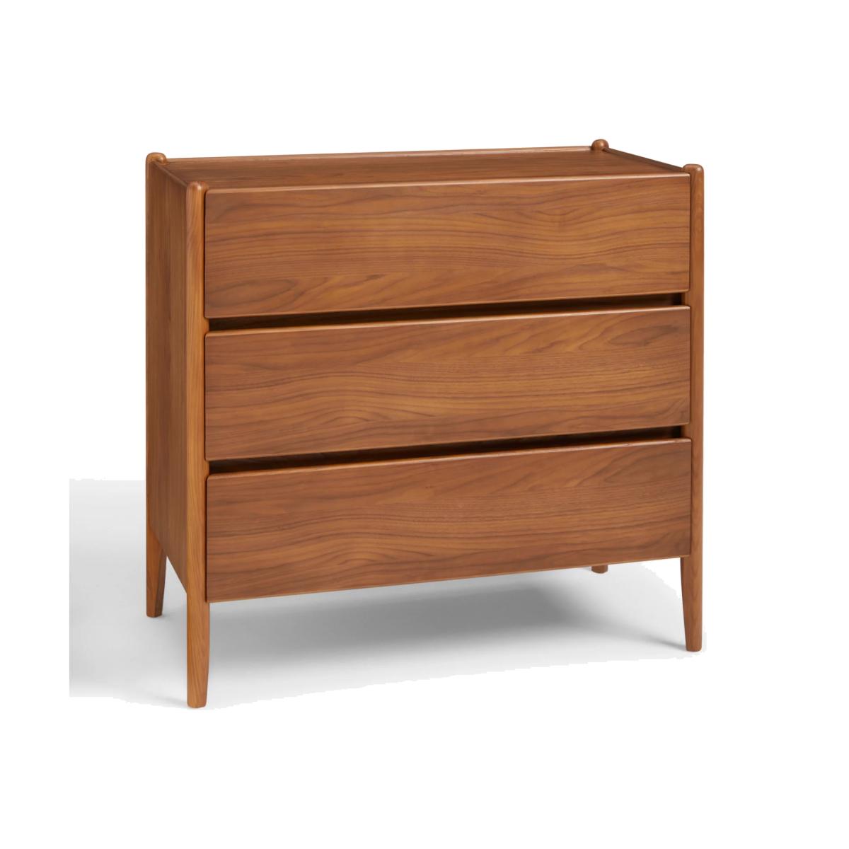Our Scandi Walnut range of bedroom furniture is a celebration of natural and minimalist design, built to last. This bedside table has three storage drawers and the top surface has a slight tray-edge design so your bedside essentials stay secure. Its rounded posts, tapered legs and sleek, handle-less drawers all honour Scandinavian design principles, so it's perfect for keeping your bedroom a calm, uncluttered and simple space. The furniture is made of ash and pine wood. We've added a walnut stain finish, giving a warmer tone to the wood and complementing the mid-Century and Scandinavian-inspired design with its natural woodgrain patterns. Want to see it first? You may want to see and get a feel for the furniture in one of our shops before ordering. We'll be able to tell you where the range you'd like to view is on display.