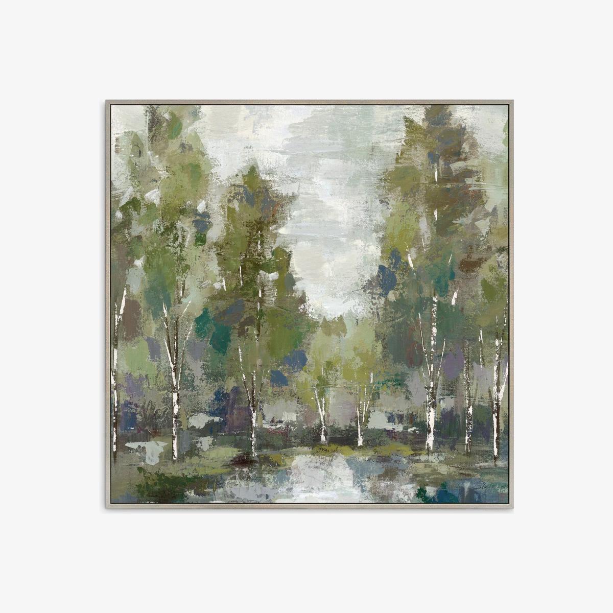 With a simple watercolour palette of greens and blues, Silvia Vassileva captures a serene moment in a flourishing woodland. Framed canvas print. Artist Silvia Vassileva thrives on the freedom of bold contrasts, creating energy through her compositions. Her inspiration is rooted deeply in living in and travelling through three continents. Have you thought about wall hooks and fittings?