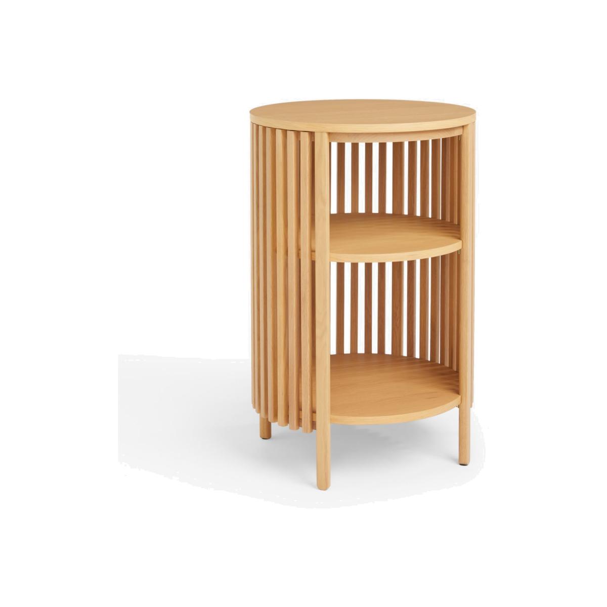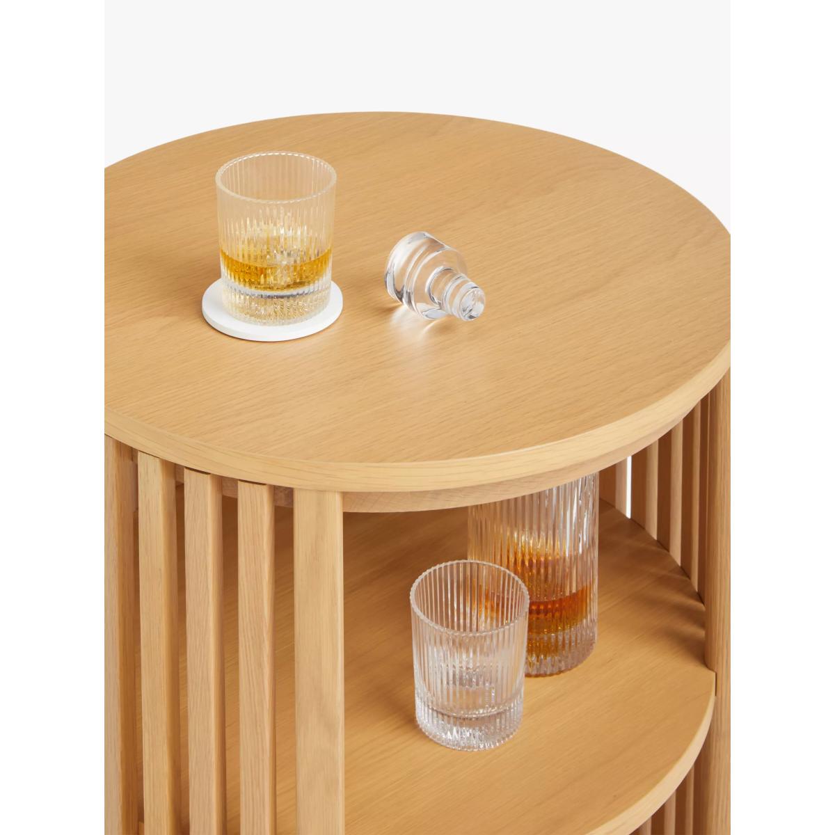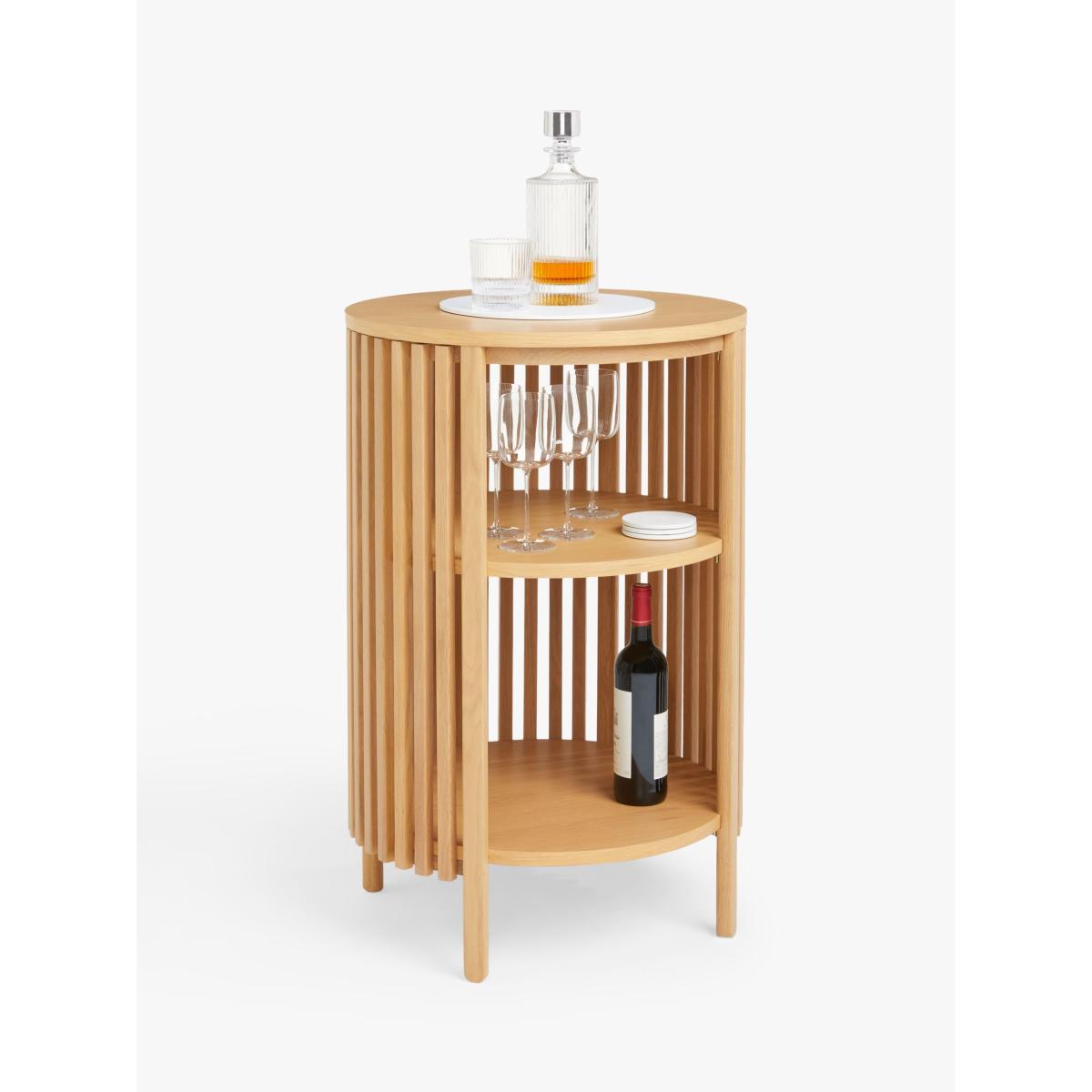 Straight, slatted front. Curved, capsule shape. That's a contrast we can get on board with. Made from a combination of oak veneers, solid oak and MDF, this attractive round unit keeps glasses, decanters and other bar accessories to hand. Made from natural oak wood, the design lends a lightweight look while neatly concealing its contents from the back and sides. Place unobtrusively in the corner of your living room corner or right beside your favourite chair. Want to see it first? You may want to see and get a feel for the furniture in one of our shops before ordering. We'll be able to tell you where the range you'd like to view is on display.