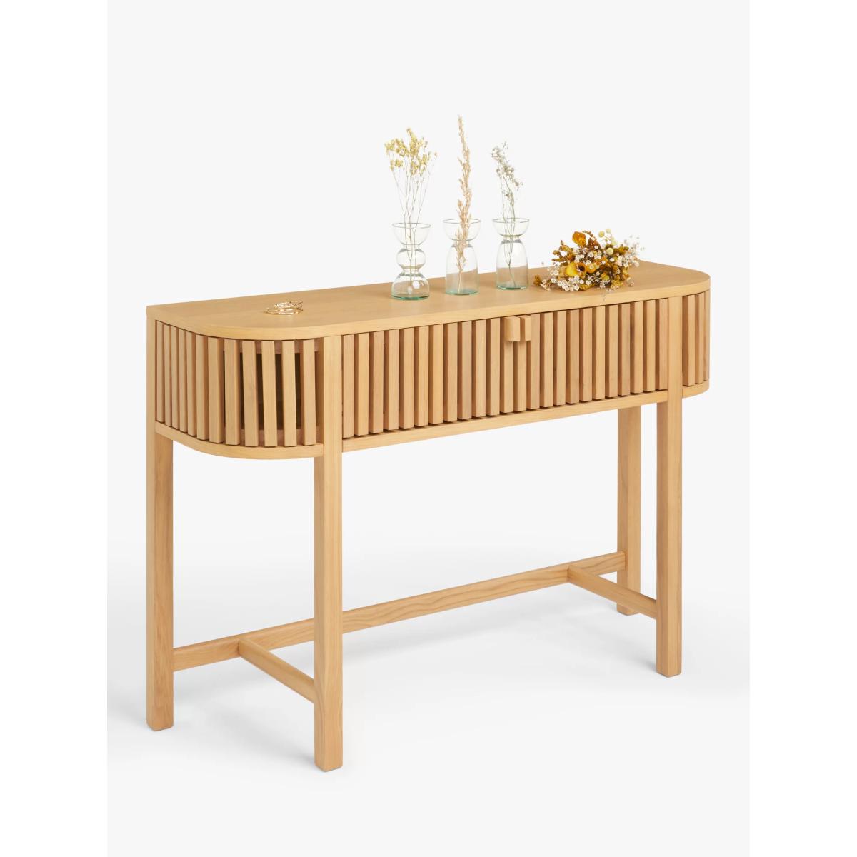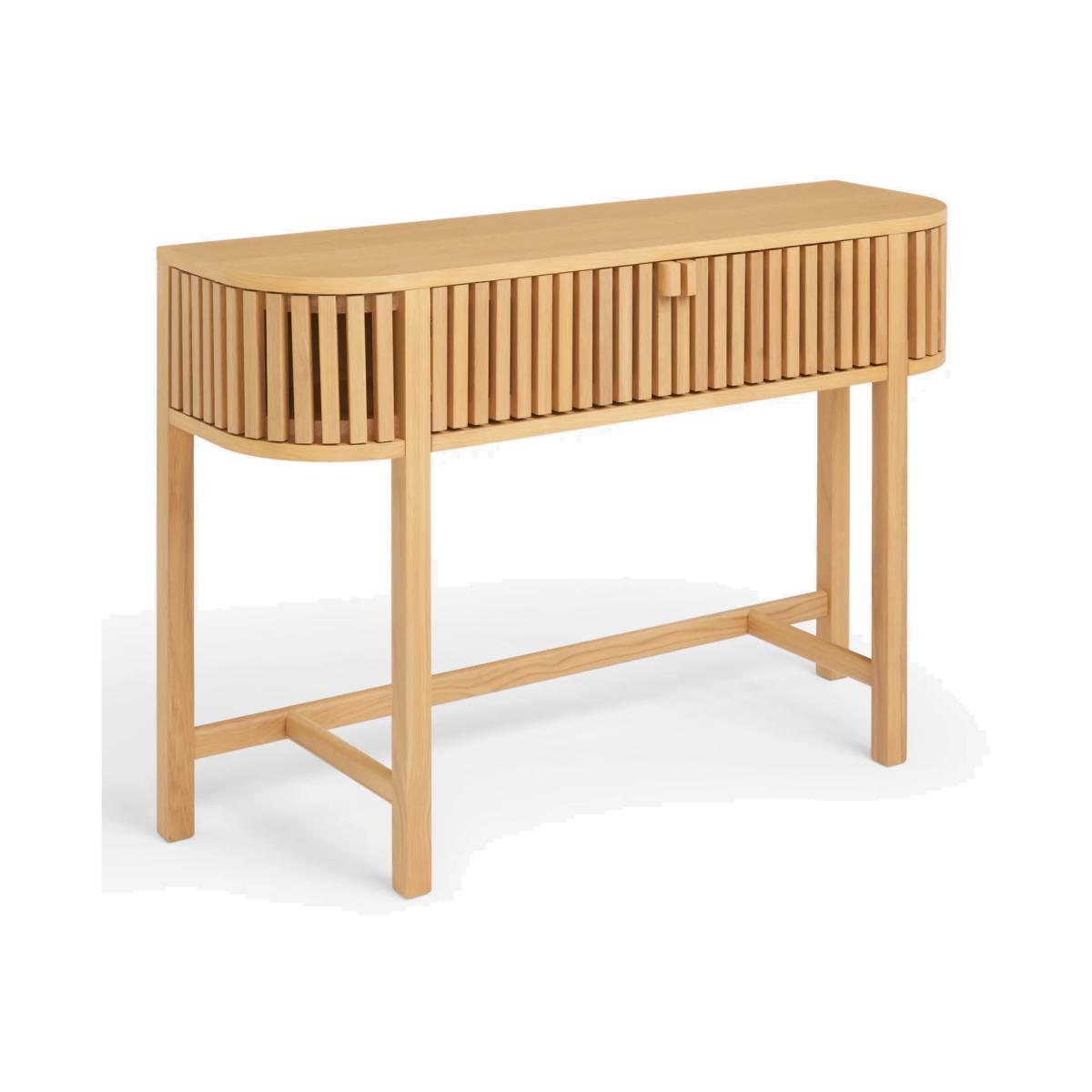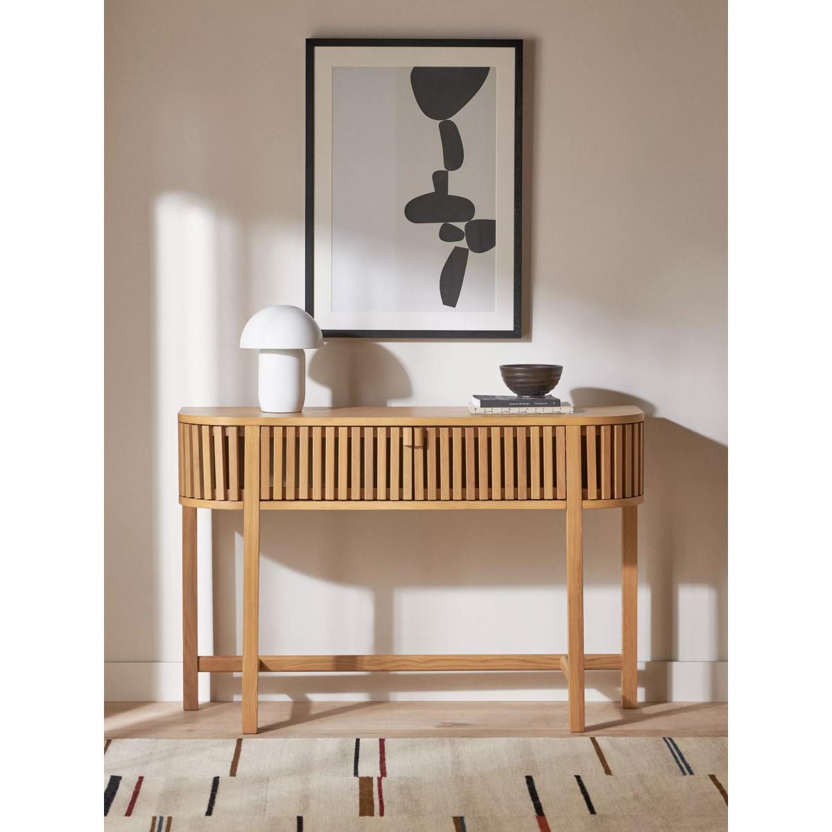 Straight, slatted front. Curved, capsule shape. That's a contrast we can get on board with. Made from a combination of oak veneers, solid oak and MDF, this curvy console table has doors rather than drawers making it extra roomy inside. It also has front legs that sit at narrower width than the back ones for an unusual and attractive feature. The design lends a lightweight look while neatly concealing the contents. Want to see it first? You may want to see and get a feel for the furniture in one of our shops before ordering. We'll be able to tell you where the range you'd like to view is on display.