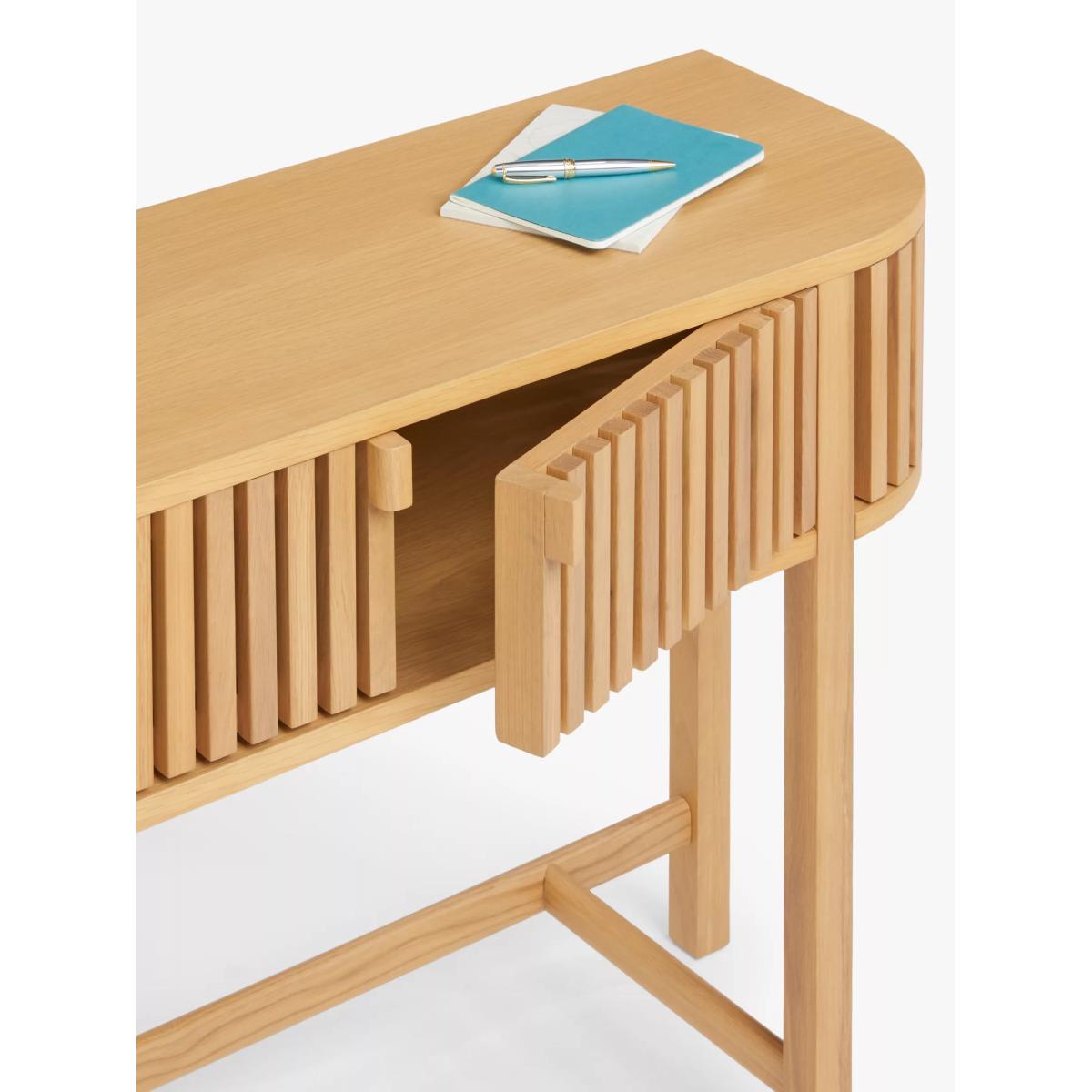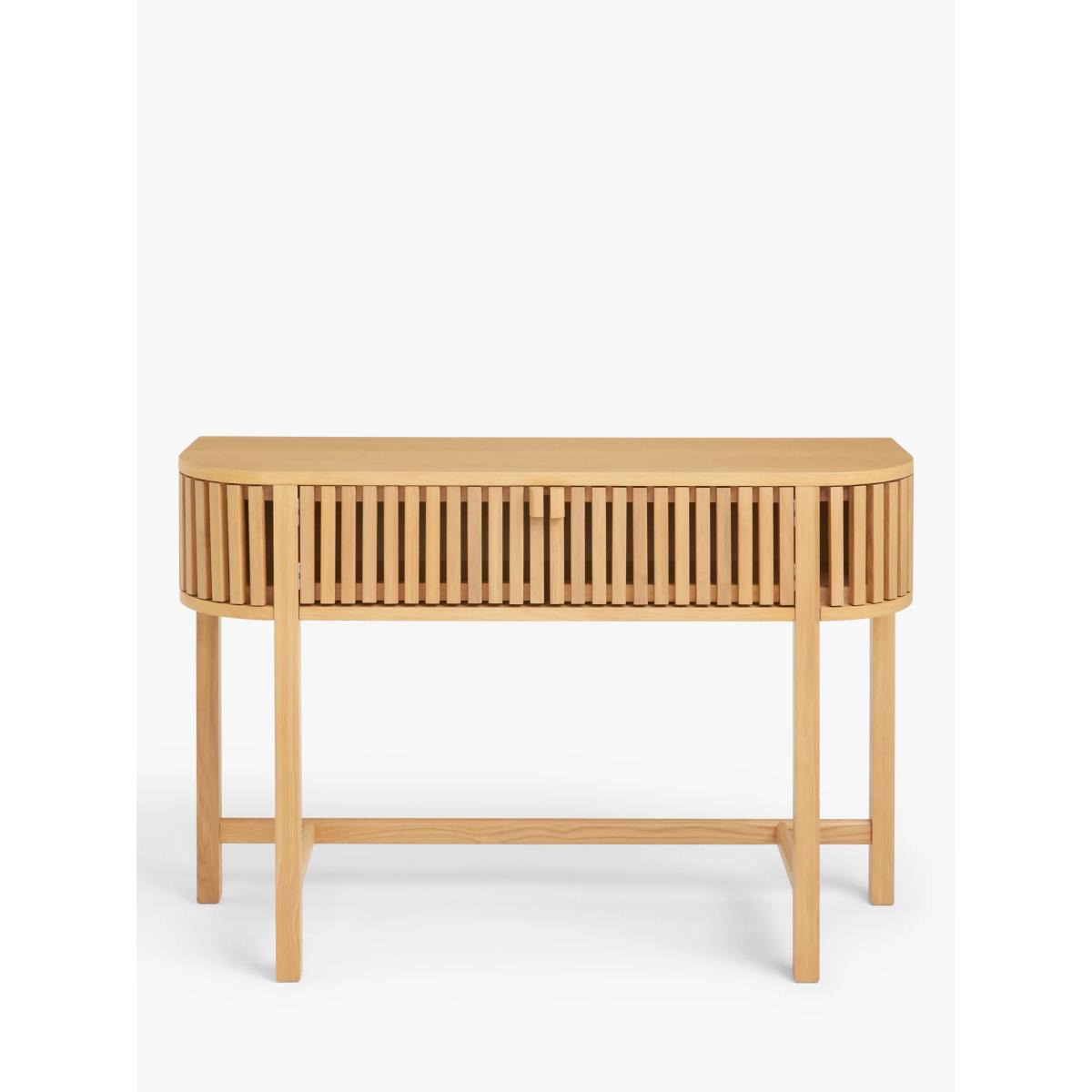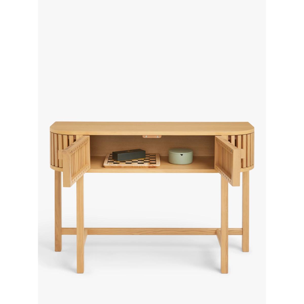 Straight, slatted front. Curved, capsule shape. That's a contrast we can get on board with. Made from a combination of oak veneers, solid oak and MDF, this curvy console table has doors rather than drawers making it extra roomy inside. It also has front legs that sit at narrower width than the back ones for an unusual and attractive feature. The design lends a lightweight look while neatly concealing the contents. Want to see it first? You may want to see and get a feel for the furniture in one of our shops before ordering. We'll be able to tell you where the range you'd like to view is on display.