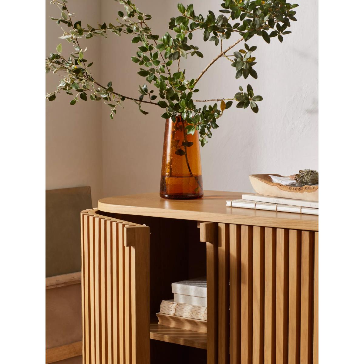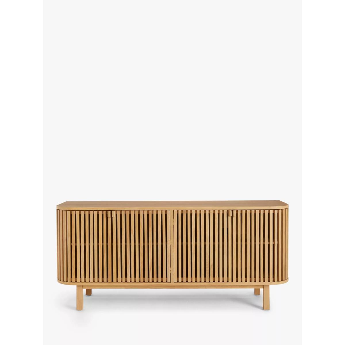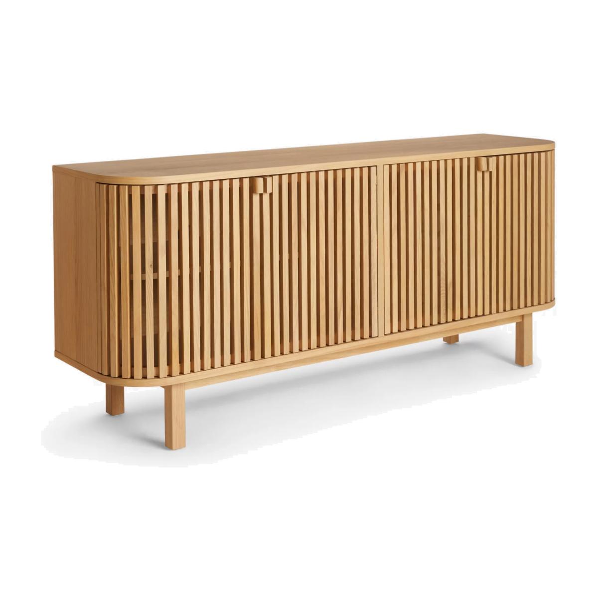 Straight, slatted front. Curved, capsule shape. That's a contrast we can get on board with. Made from a combination of oak veneers, solid oak and MDF, this sideboard provides plenty of storage space in both of its cupboard sections which each have an adjustable shelf. The slatted feature on the doors gives the design a visual lightness, a touch of texture and a distinctive finish that will stand out in your space. Discreet wooden handles blend into the design, keeping the frame minimalist and streamlined. And versatile furniture is always a bonus, so we've added holes to the back of the frame which can be used to feed through media cables if you use this sideboard as a TV stand. Want to see it first? You may want to see and get a feel for the furniture in one of our shops before ordering. We'll be able to tell you where the range you'd like to view is on display.