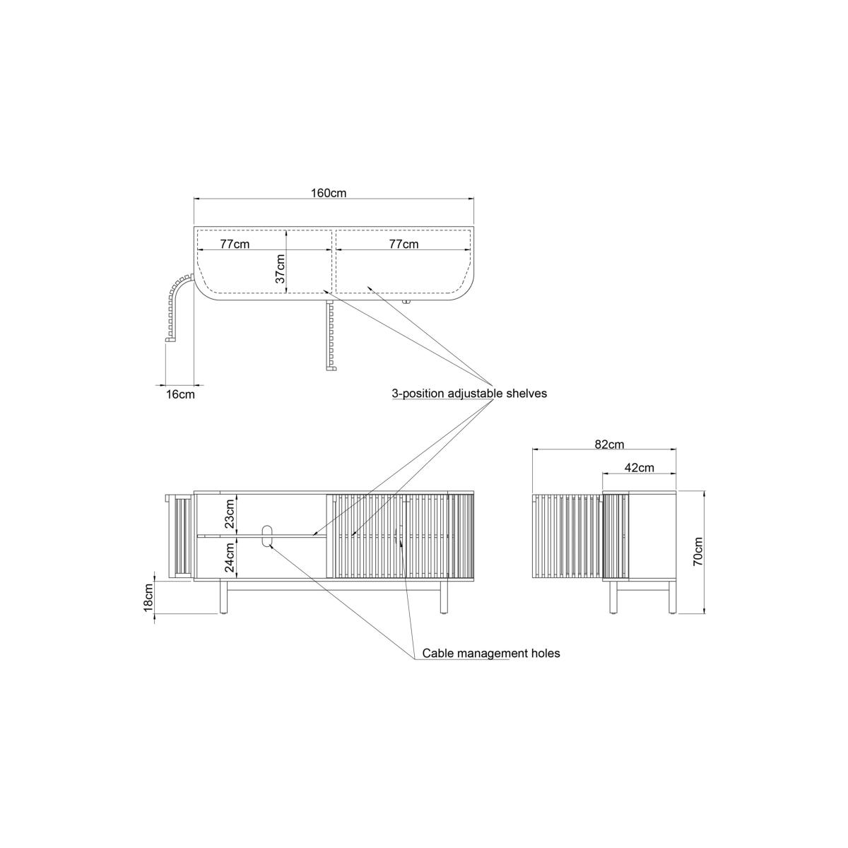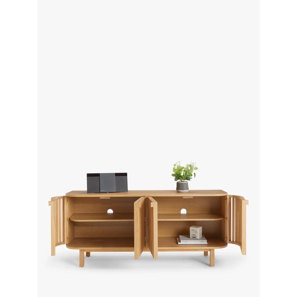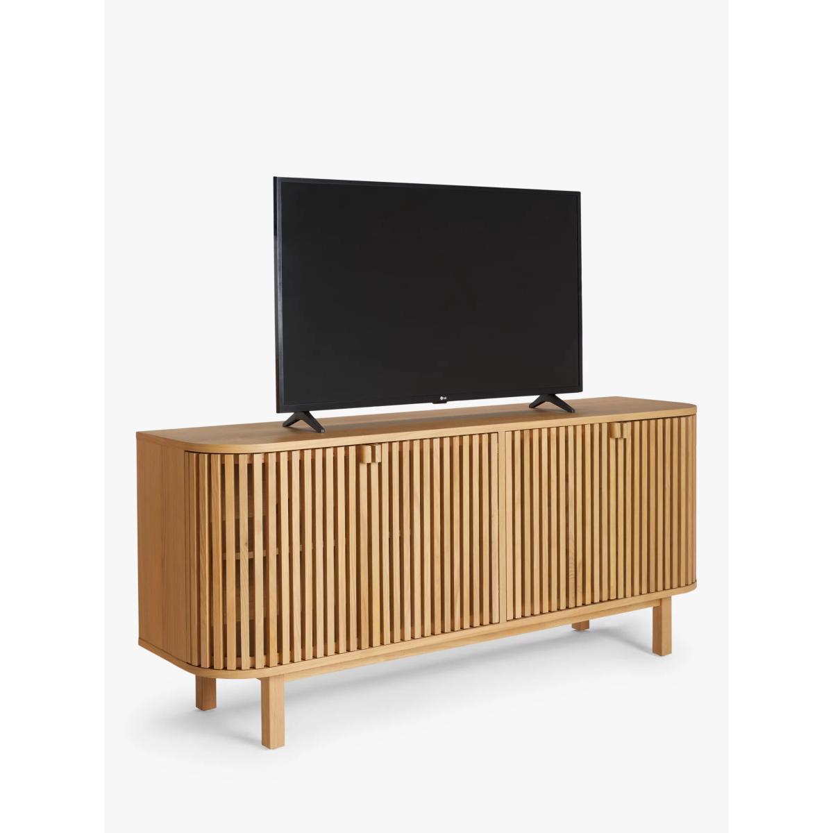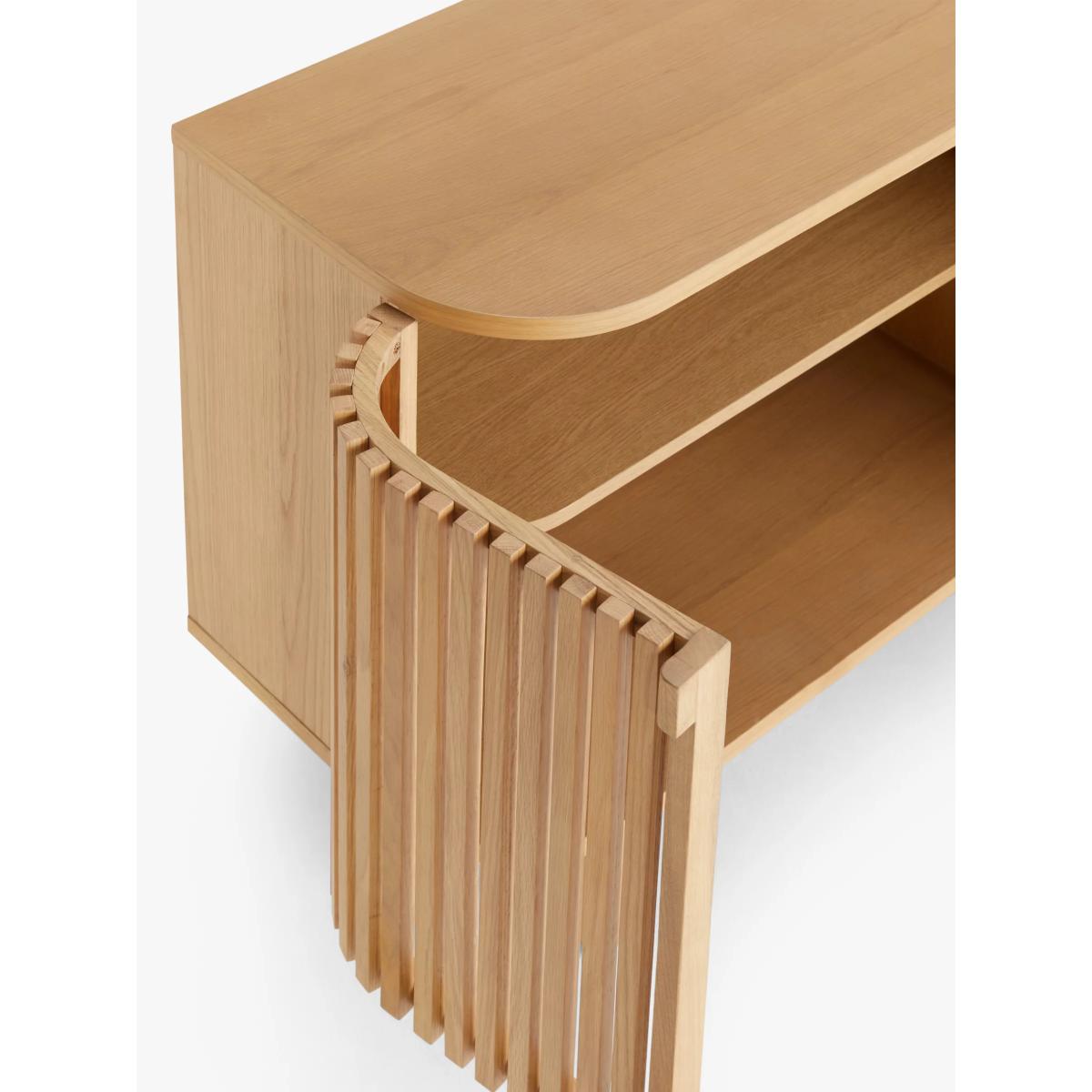Straight, slatted front. Curved, capsule shape. That's a contrast we can get on board with. Made from a combination of oak veneers, solid oak and MDF, this sideboard provides plenty of storage space in both of its cupboard sections which each have an adjustable shelf. The slatted feature on the doors gives the design a visual lightness, a touch of texture and a distinctive finish that will stand out in your space. Discreet wooden handles blend into the design, keeping the frame minimalist and streamlined. And versatile furniture is always a bonus, so we've added holes to the back of the frame which can be used to feed through media cables if you use this sideboard as a TV stand. Want to see it first? You may want to see and get a feel for the furniture in one of our shops before ordering. We'll be able to tell you where the range you'd like to view is on display.