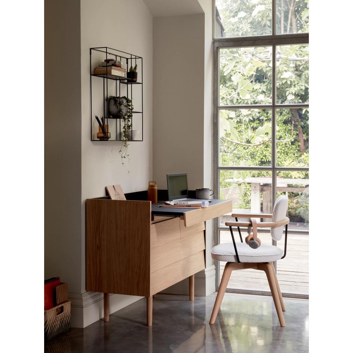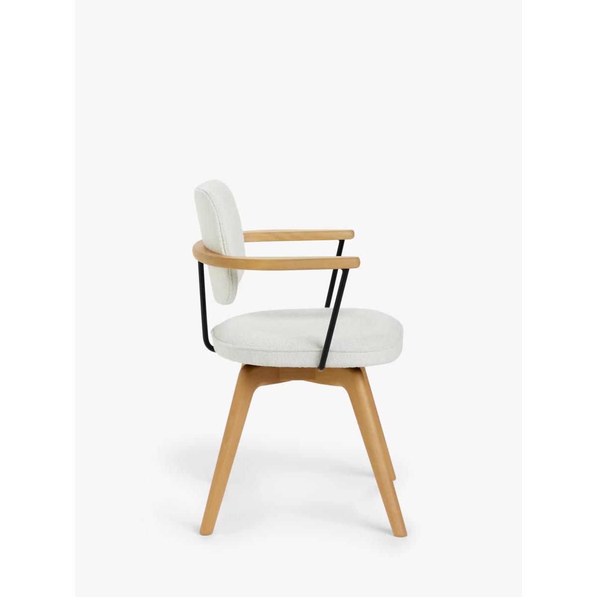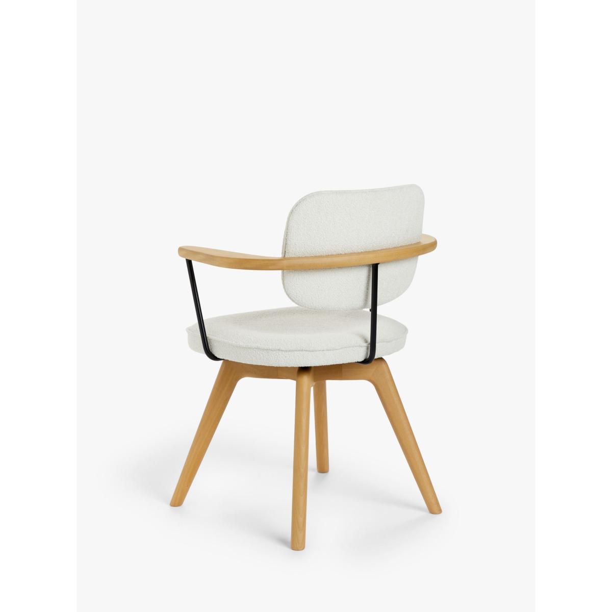 Suitable for short periods at your desk, our Soren chair has a smart, Scandi-inspired shape and we've made the frame from a combination of high-quality timbers. The splayed legs look distinctive and provide stability, while the fixed, integrated armrests encourage a good posture. Plus, the upholstered seat is foam-filled for extra comfort. Available in a soft, or textured bouclé fabric. Smart swivel function The seat is designed to swivel and then return to its original position. When you swivel round to leave your desk, the chair will automatically return to its forward-facing position. Protect your floor For added protection to your floor and furniture, we recommend using floor pads or mats where possible. Want to see it first? You may want to see and get a feel for the furniture in one of our shops before ordering. We'll be able to tell you where the range you'd like to view is on display.