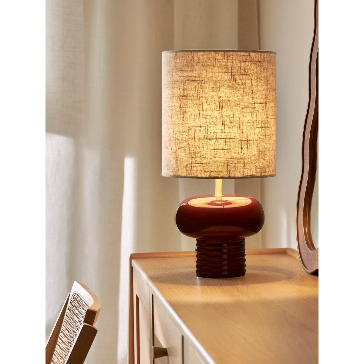 I love this lamp because of its chunky ribbed base and the rich damson hue, which adds a warm, fashionable touch to any space. It works particularly well in contemporary and eclectic interiors, where its bold colour can be a statement piece, but it’s also versatile enough for classic or minimalist schemes, adding a bit of colour without overwhelming. Practical styling tips include placing it on a side table or console in a living room or bedroom, paired with complementary accessories like textured ceramics or soft textiles. Keep the lampshade simple and neutral to let the base pop, and it’s perfect for creating a cosy, inviting atmosphere or as a colourful focal point in a more pared-back setting.