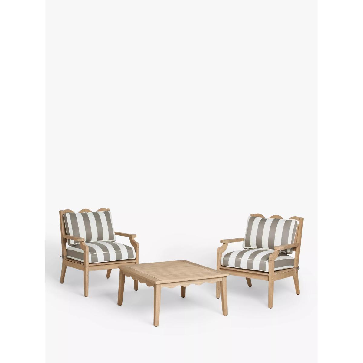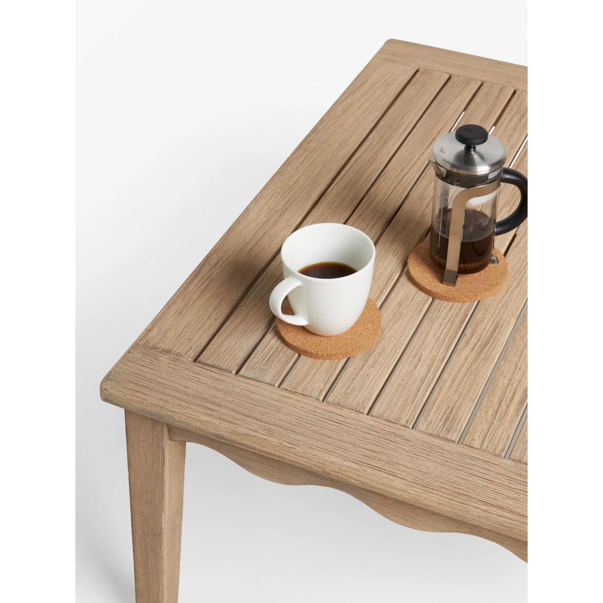 Our Squiggle garden furniture is made of FSC-certified acacia wood with wavy decorative details. The wood is naturally weather-resistant with a weathered finish, making it suitable for outdoor use. The furniture is equally at home in a conservatory. ' This garden furniture range is a play on a classic detail with its squiggle design, which picks up an indoor decorative trend and brings it outside.' — designer Matthew Steels, John Lewis Design Studio. Key features: Square garden coffee table Naturally weather-resistant FSC-certified acacia wood Protective furniture leg caps Suitable for indoor and outdoor use Designed by Partners in our John Lewis Design Studio Matches outdoor furniture in our Squiggle range Garden furniture care: To keep your outdoor furniture in the best condition, store it in a cool, dry, well-ventilated spot indoors over the winter. If it’s staying outside, use an outdoor furniture cover whenever the weather is wet or unseasonal. Make sure furniture is clean and dry before storing it away. By choosing this product you are supporting responsible management of the world's forests. The Forest Stewardship Council® (FSC®) is a global, not-for-profit organisation that helps take care of forests and the people and wildlife that call them home. To learn more, visit fsc.org. Choose the perfect outdoor furniture We have a selection of wooden furniture for you to choose from which will suit the home or garden. Below are a few options to consider when choosing your perfect outdoor furniture. TeakA premium and popular wood with an attractive appearance which ages beautifully. Strong, durable and resistant to rot and decay, this furniture requires little maintenanceEucalyptusDistinctive scent and appearance which darkens as it ages. Provides similar natural benefits to teak including moisture resistance, hardness and durability. It's plentiful in supply which makes the furniture an inexpensive choice. AcaciaNaturally durable, this wood is incredibly hard and is unlikely to suffer damage during everyday use. It provides similar natural benefits to teak, yet unlike many other hardwoods, acacia is also relatively fast growing which minimises the environmental impact.