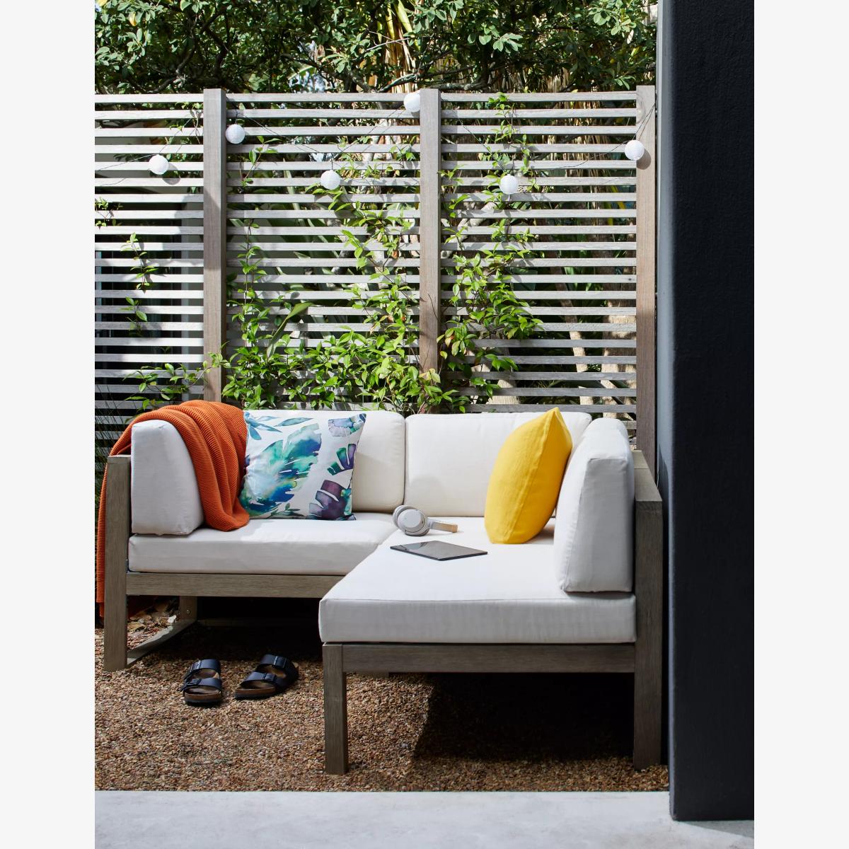 This distinctive corner armchair is part of our St Ives range of modular furniture which you can customise to suit your own space. It's equally suitable for indoor or outdoor use and comes with sumptuous shower-resistant cushioning. Made from high-quality FSC-certified eucalyptus wood, our St Ives range is inspired by the quaint seaside town in Cornwall. The range combines the best of traditional English and contemporary Scandinavian design. Robust seating frames in this range have been tested to withstand 20 stone (127kg), exceeding the industry standard. Features: Corner armchair with shower-resistant cushions FSC-certified eucalyptus wood Suitable for indoor and outdoor use Part of the St Ives range of garden furniture Good to know: This is one section of the St Ives Garden set. To complete the set, add a St Ives Single Modular Garden Lounge Chair Section. Want to see it first? You may want to see and get a feel for the product in one of our shops before ordering. We'll be able to tell you where the range you'd like to view is on display. By choosing this product you are supporting responsible management of the world's forests. The Forest Stewardship Council® (FSC®) is a global, not-for-profit organisation that helps take care of forests and the people and wildlife that call them home. To learn more, visit www.fsc.org. Choose the perfect outdoor furniture We have a selection of wooden furniture for you to choose from which will suit the home or garden. Below are a few options to consider when choosing your perfect outdoor furniture. Teak A premium and popular wood with an attractive appearance which ages beautifully. Strong, durable and resistant to rot and decay, this furniture requires little maintenanceEucalyptus Distinctive scent and appearance which darkens as it ages. Provides similar natural benefits to teak including moisture resistance, hardness and durability. It's plentiful in supply which makes the furniture an inexpensive choice. Acacia. Naturally durable, this wood is incredibly hard and is unlikely to suffer damage during everyday use. It provides similar natural benefits to teak, yet unlike many other hardwoods, acacia is also relatively fast growing which minimises the environmental impact.