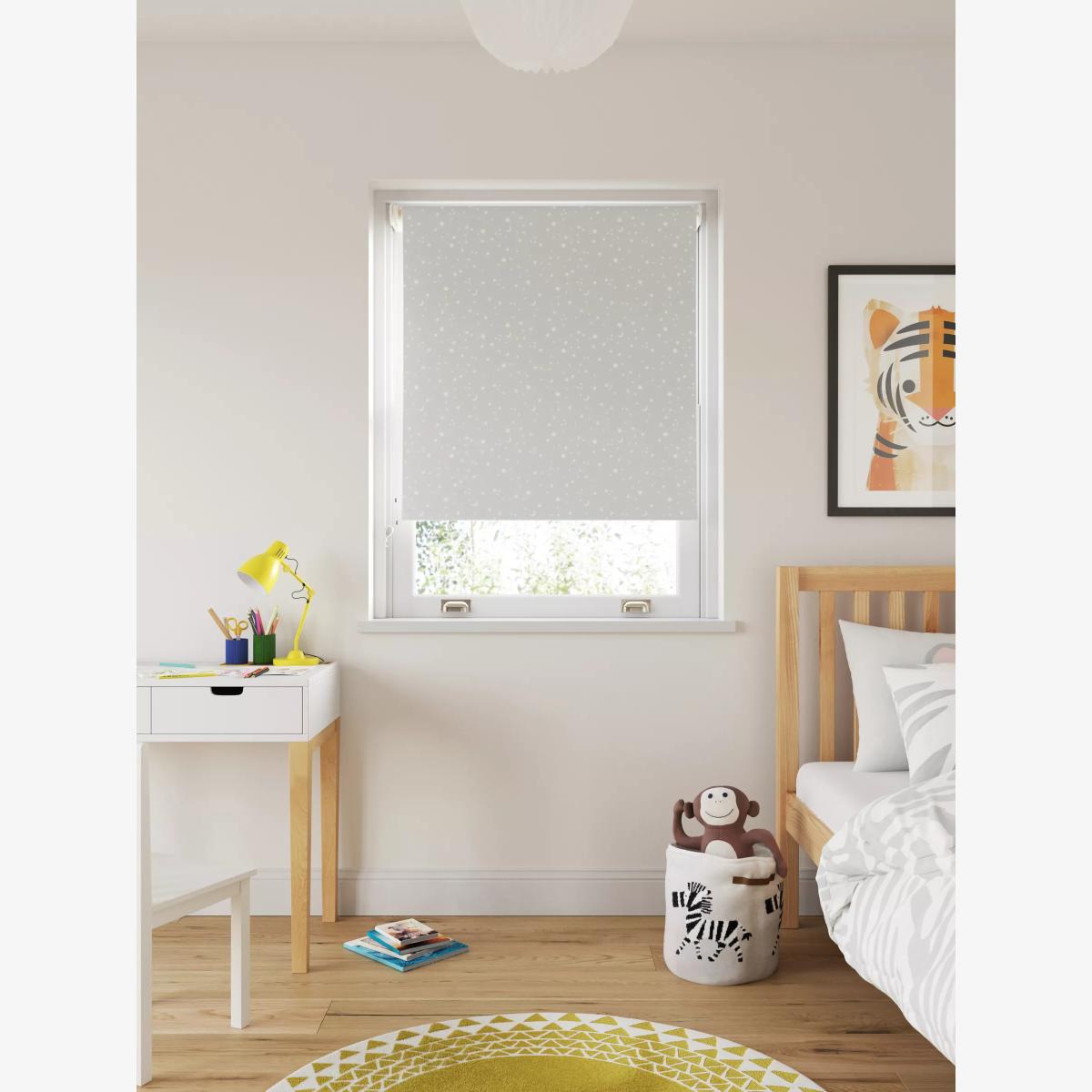 Our roller blind showcases a vision of a night sky. It has a blackout coating to block out the light, helping you sleep for longer. Worth knowing... The width stated in our product specifications is the total width of the blind including mechanisms and brackets. The width of the fabric alone will be a few centimetres less than this. Safety warning Young children can be strangled by loops in pull cords, chains, tapes and inner cords that operate the product. To avoid strangulation and entanglement, keep cords out of the reach of young children - cords may become wrapped around a child's neck Move beds, cots and furniture away from window covering cords Do not tie cords together. Make sure cords do not twist and create a loop More information on child safety can be found on our Child Safety Hub