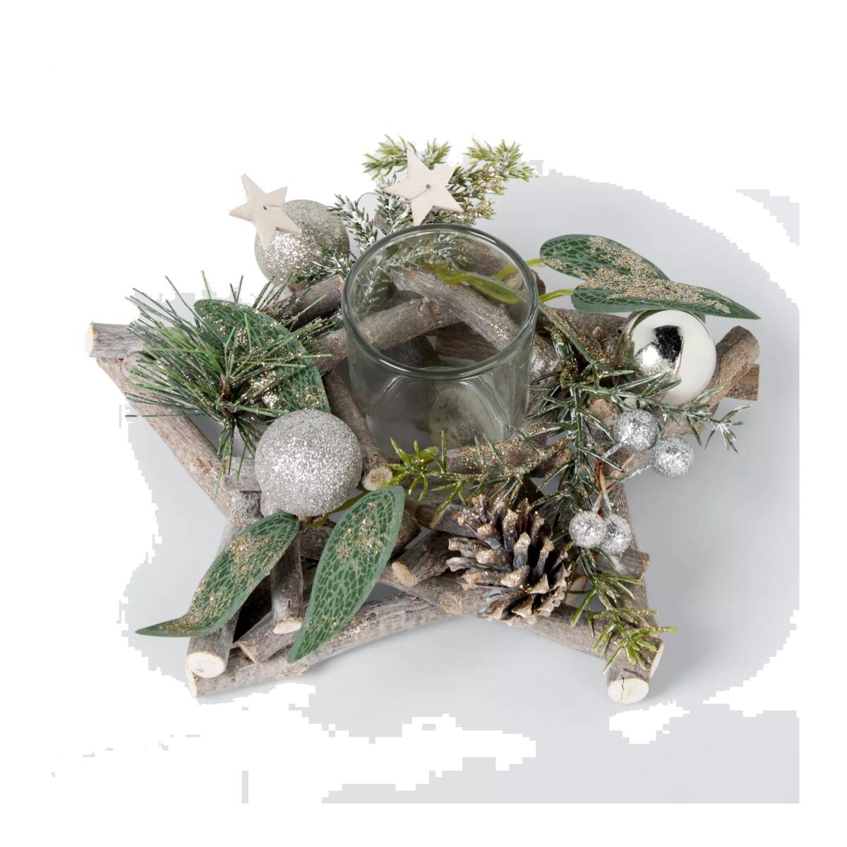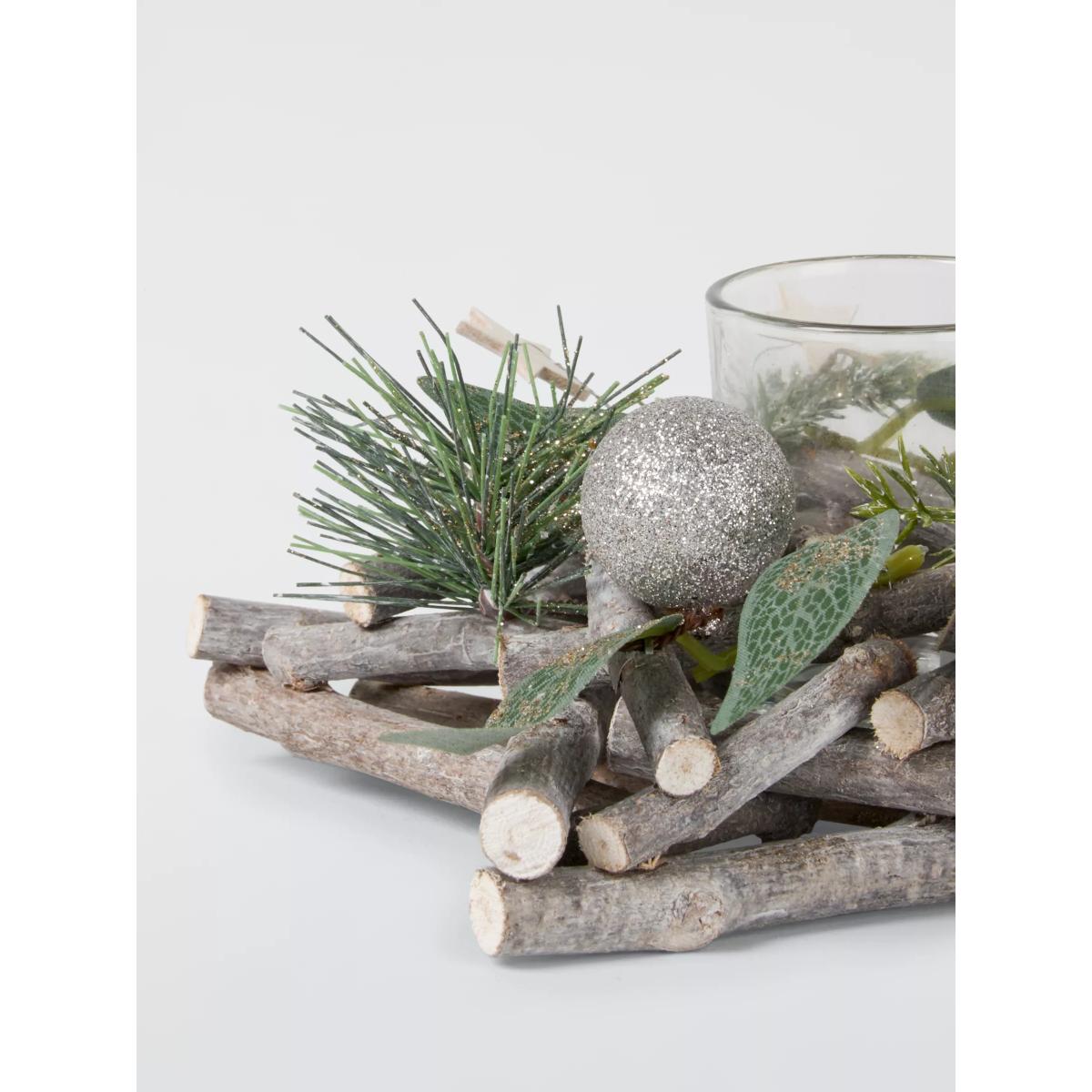 This attractive table decoration has a frame of twigs trimmed with frosted pine sprigs and leaves, silver baubles and berries along with glitter pine cones and wooden stars.
