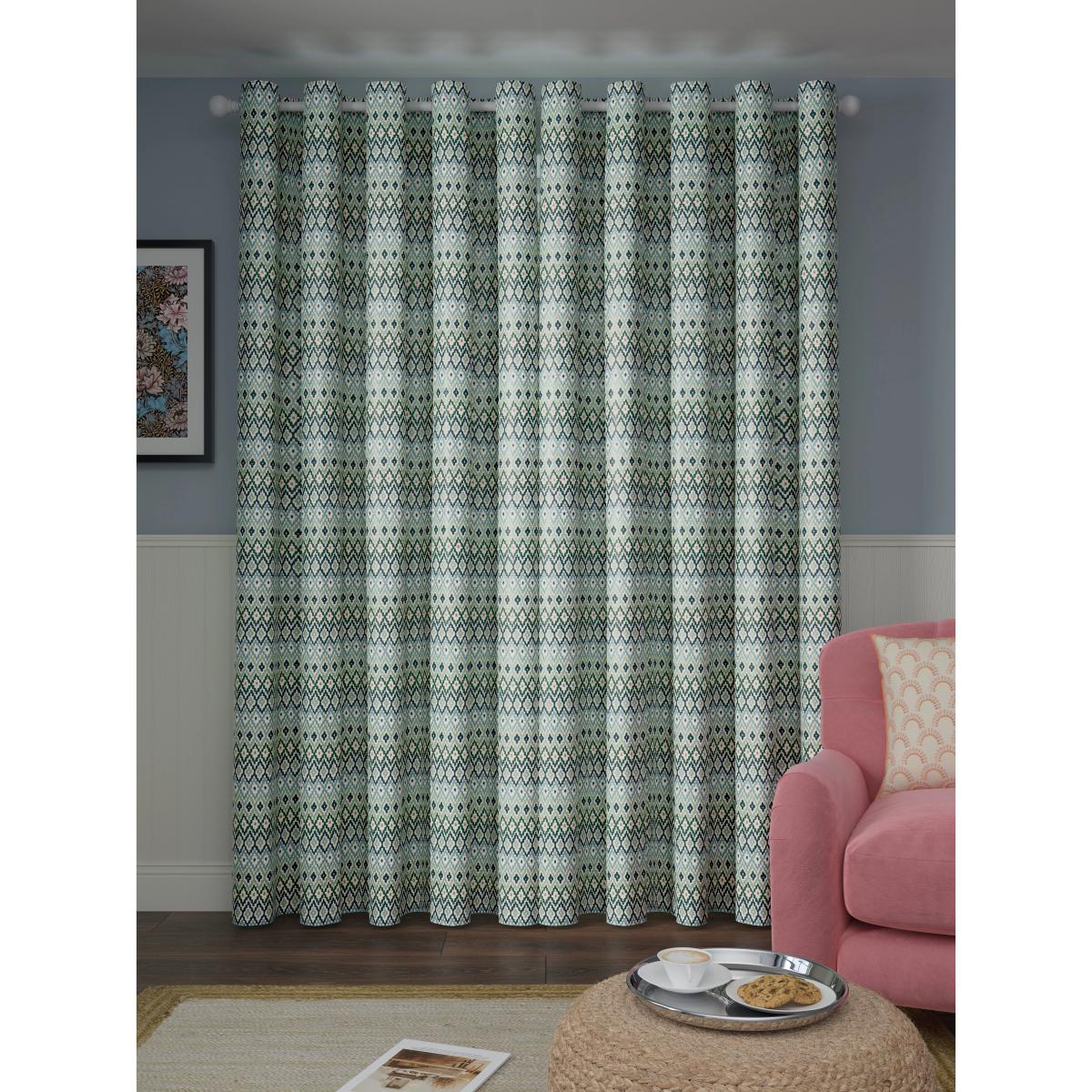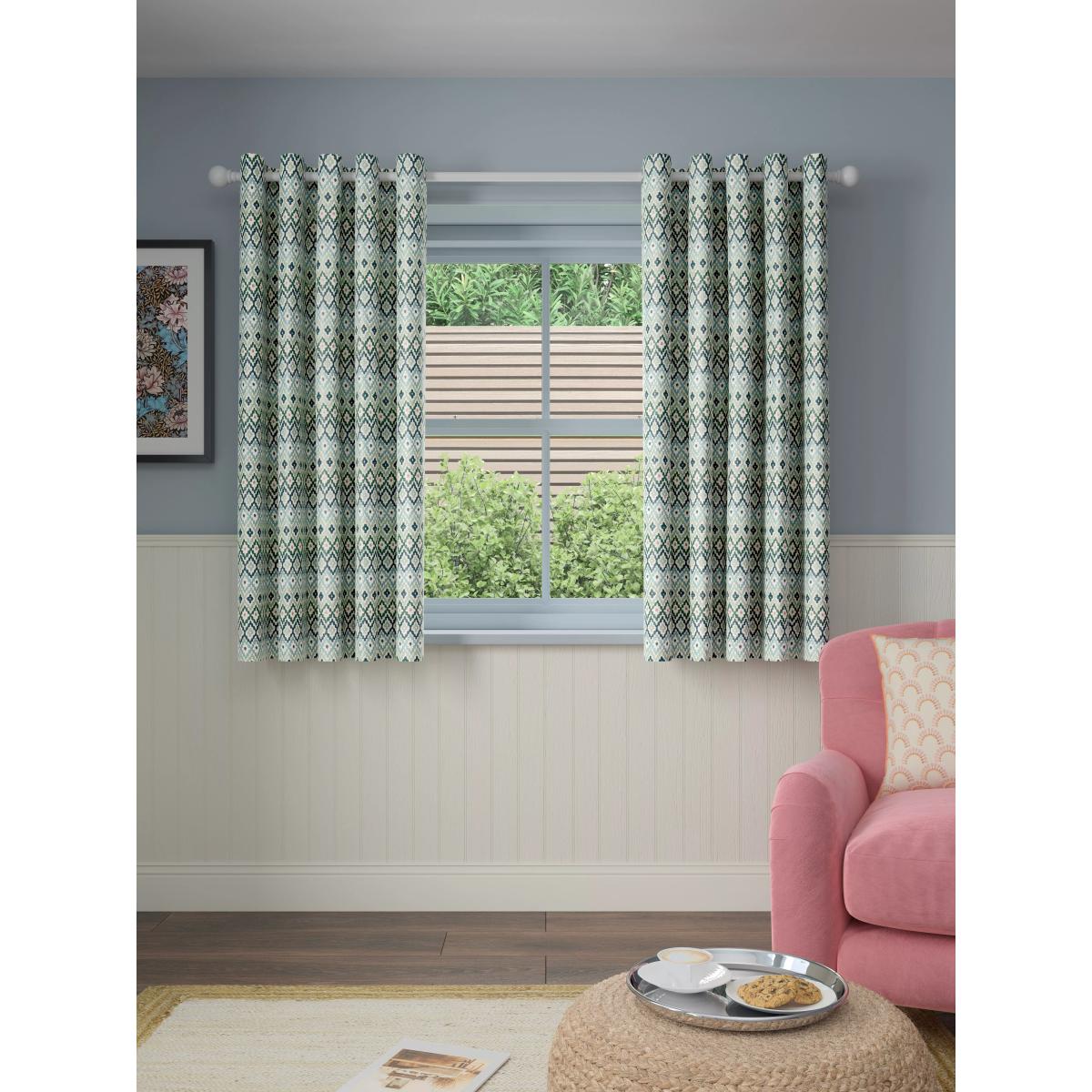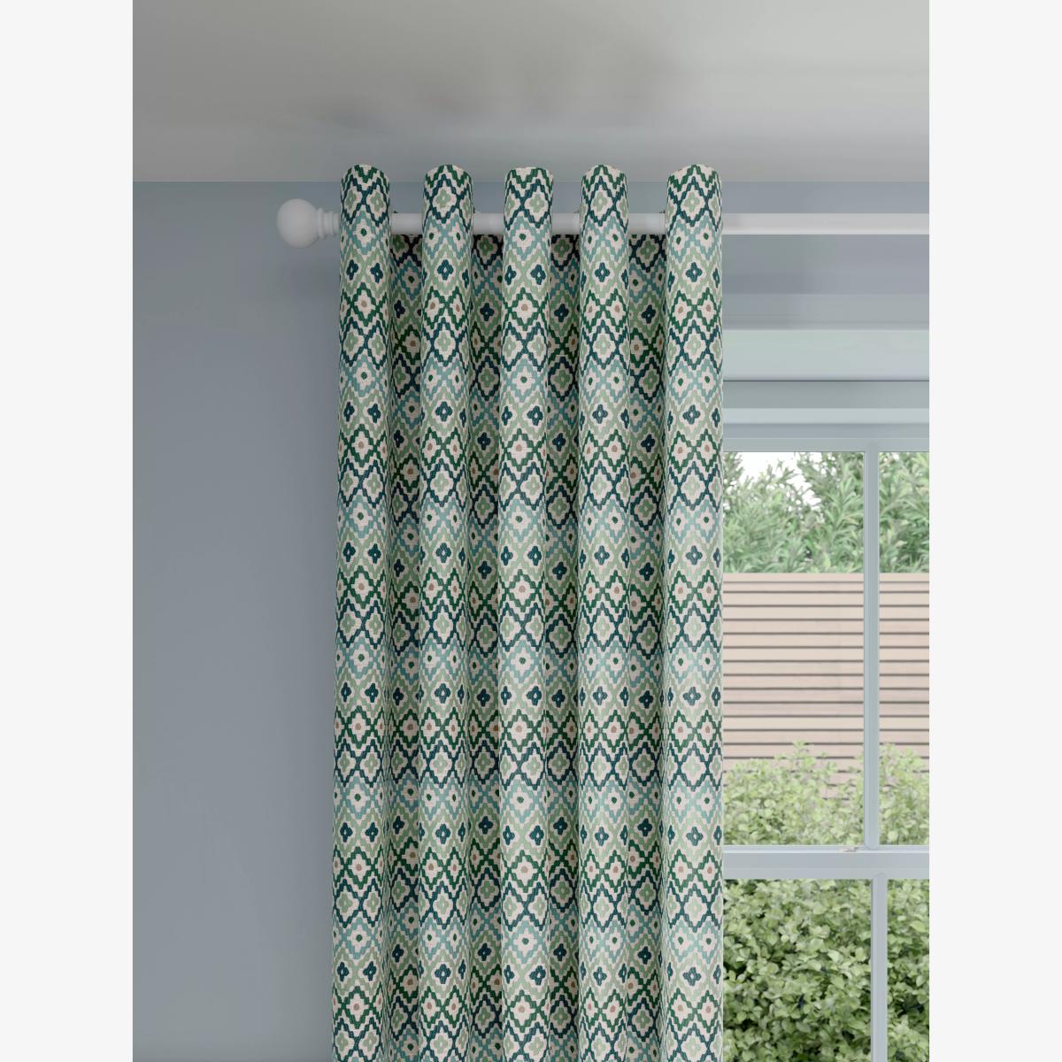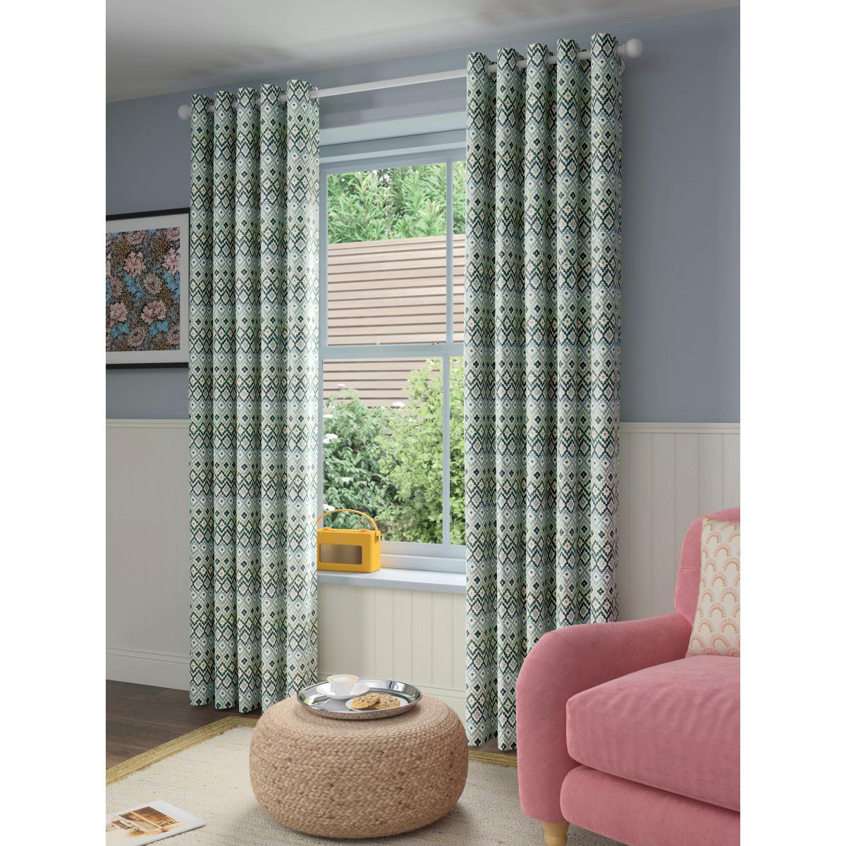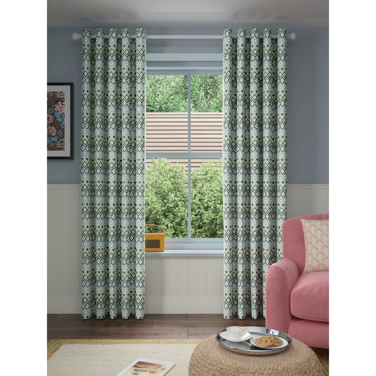 Geometric patterned eyelet curtains. The lining adds the perfect finish, improving the drape and enhancing the vibrancy of the curtain. The width stated indicates the size of one curtain panel when laid completely flat. This pack contains two panels, and the track/pole length we've recommended allows for the two panels to be gathered when the curtains are drawn. For a fuller look, increase the curtain width. One pair of 167cm width curtains will fit a curtain track/pole size of 167-223cm One pair of 228cm width curtains will fit a curtain track/pole size 228-304cm Worth knowing... We package our curtains in recycled materials to keep them protected whilst they make their way to you. This means that when they arrive there could be some creases in them. We recommend you hang them for a few days to allow them to flatten and for the creases to fall out. If after this period your curtains still show signs of being folded then follow the ironing instructions on the back of the packaging. Be aware that each style of curtain has different ironing instructions, including heat limitations according to the fabric, so do make sure you follow the guidance provided to get the best results. Do you need a curtain pole and accessories? Shop them here.