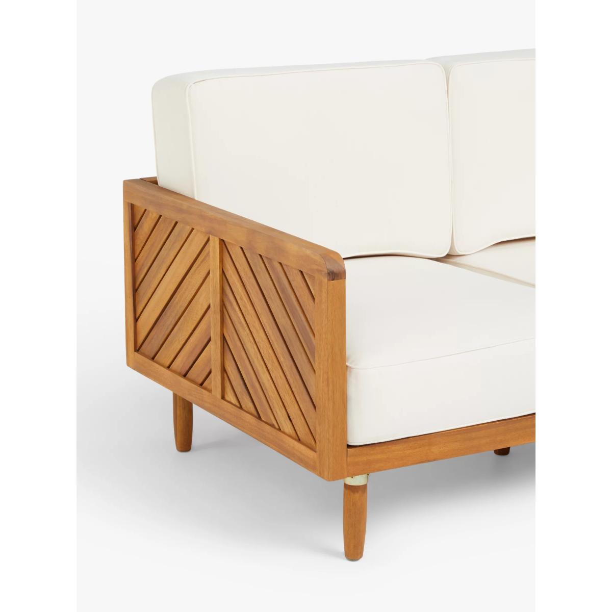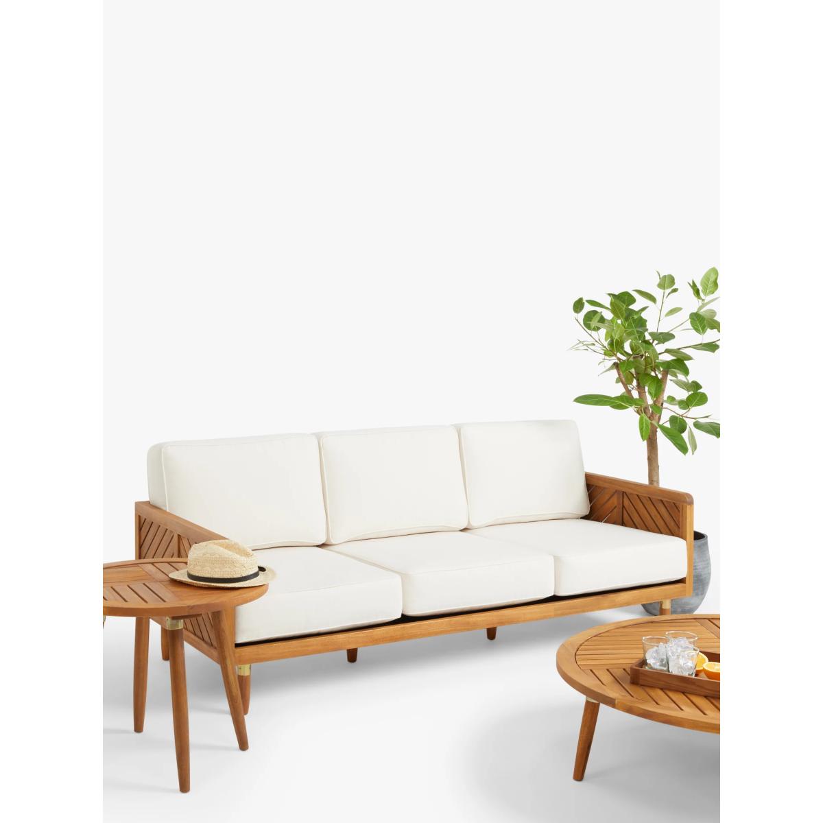 Designed by Swoon, made by us. With a shared commitment to exceptional design and quality, we've collaborated to create an exclusive furniture collection for the modern home. Taking cues from our popular Franklin range, we've created outdoor furniture inspired by Franklin's distinctive, geometric design and Scandinavian Mid-century aesthetic. The rich tones of acacia wood bring a familiar natural warmth, with brass-finished accents and tall, tapering legs adding poise and elegance. All our outdoor wooden furniture ranges are made from sustainably sourced, naturally weather-resistant tropical hardwoods. All our outdoor cushions are shower-resistant and our seating is rigorously weight-tested, ensuring stability and strength. Key features: 3-seater garden sofa Weather-resistant FSC-certified acacia wood Geometric design and elegant tapered legs Shower-resistant plump seat and backrest cushions Feet caps protect flooring and furniture legs and are adjustable in height for uneven surfaces Team with our Franklin range of garden furniture Garden furniture care: To keep your outdoor furniture in the best condition, store it in a cool, dry, well-ventilated spot indoors over the winter. If it’s staying outside, use an outdoor furniture cover whenever the weather is wet or unseasonal. Make sure furniture is clean and dry before storing it away and keep cushions in a clean and dry place when not in use. By choosing this product you are supporting responsible management of the world's forests. The Forest Stewardship Council® (FSC®) is a global, not-for-profit organisation that helps take care of forests and the people and wildlife that call them home. To learn more, visit fsc.org. Choose the perfect outdoor furniture We have a selection of wooden furniture for you to choose from which will suit the home or garden. Below are a few options to consider when choosing your perfect outdoor furniture. TeakA premium and popular wood with an attractive appearance which ages beautifully. Strong, durable and resistant to rot and decay, this furniture requires little maintenanceEucalyptusDistinctive scent and appearance which darkens as it ages. Provides similar natural benefits to teak including moisture resistance, hardness and durability. It's plentiful in supply which makes the furniture an inexpensive choice. AcaciaNaturally durable, this wood is incredibly hard and is unlikely to suffer damage during everyday use. It provides similar natural benefits to teak, yet unlike many other hardwoods, acacia is also relatively fast growing which minimises the environmental impact.