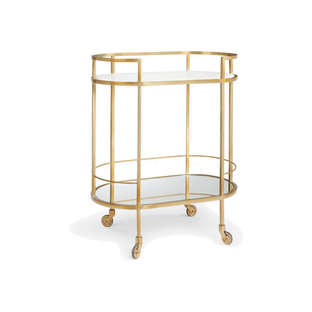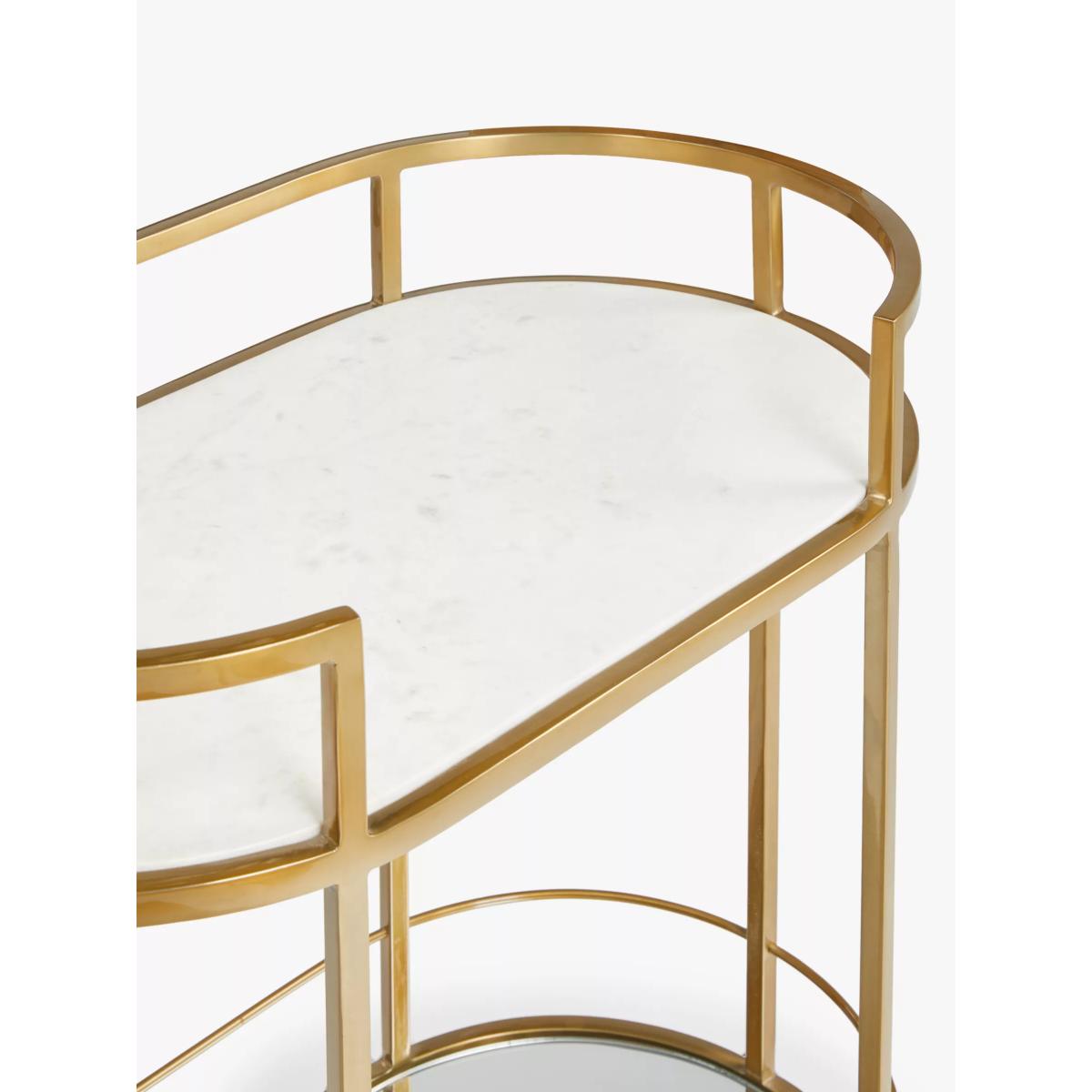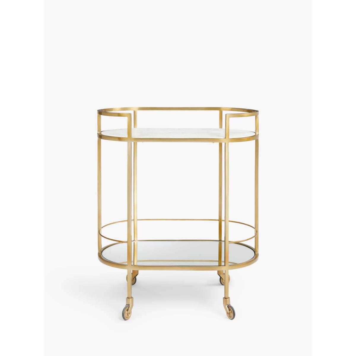 Designed by Swoon, made by us. With a shared commitment to exceptional design and quality, we've collaborated to create an exclusive furniture collection for the modern home. The Lovelace bar cart is inspired by the modernist architecture of the famous De La Warr Pavilion in Bexhill-on-Sea. Crafted with one marble and one glass shelf, it provides a beautiful base for your barware and bottles, while its carefully curved brass-toned frame lends an Art Deco-inspired contrast. Easy to transport between rooms thanks to metal castors, it's the entertaining piece you need at your next dinner party. Want to see it first? You may want to see and get a feel for the furniture in one of our shops before ordering. We'll be able to tell you where the range you'd like to view is on display.