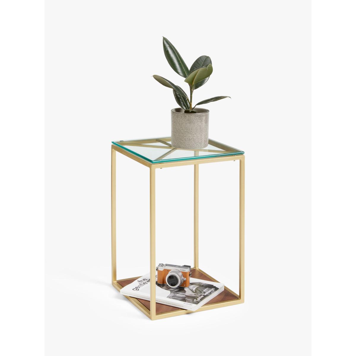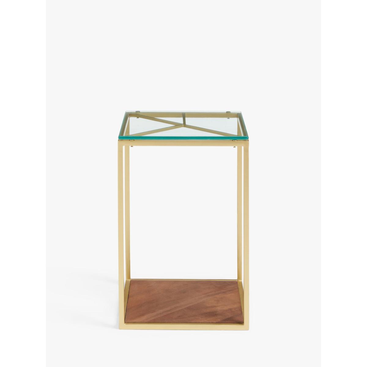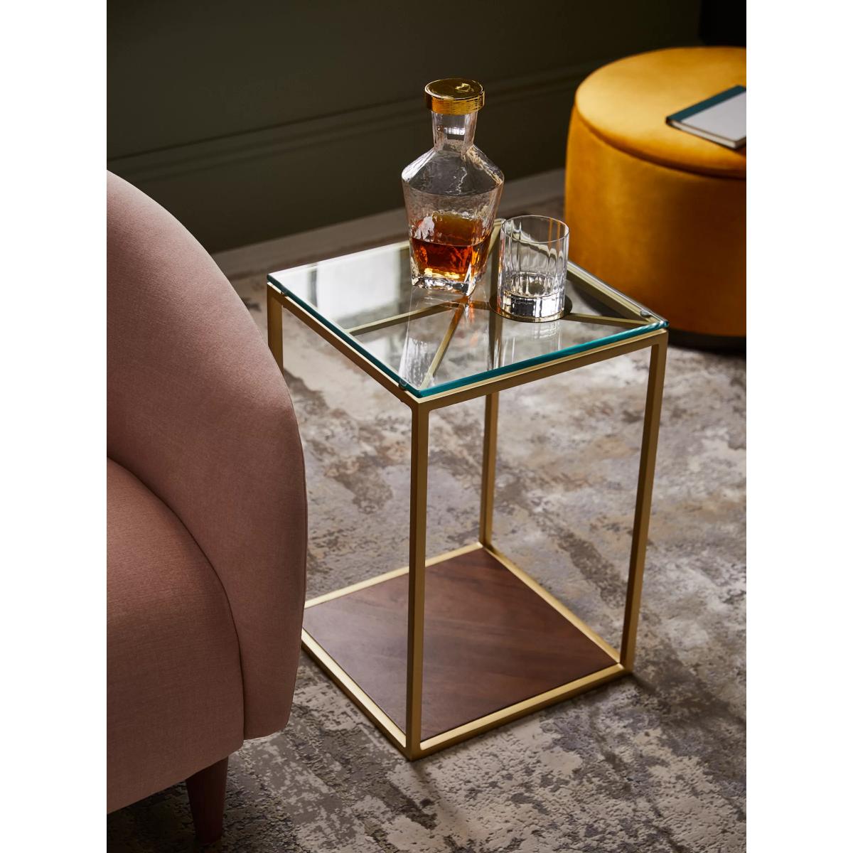 Designed by Swoon, made by us. With a shared commitment to exceptional design and quality, we've collaborated to create an exclusive furniture collection for the modern home. The Mendel side table features a clear toughened glass top and a metal frame in a brass finish. Angled cross bracing on the top gives added dimension and the acacia wood veneer MDF shelf at the bottom provides room for storage or display. Want to see it first? You may want to see and get a feel for the furniture in one of our shops before ordering. We'll be able to tell you where the range you'd like to view is on display.