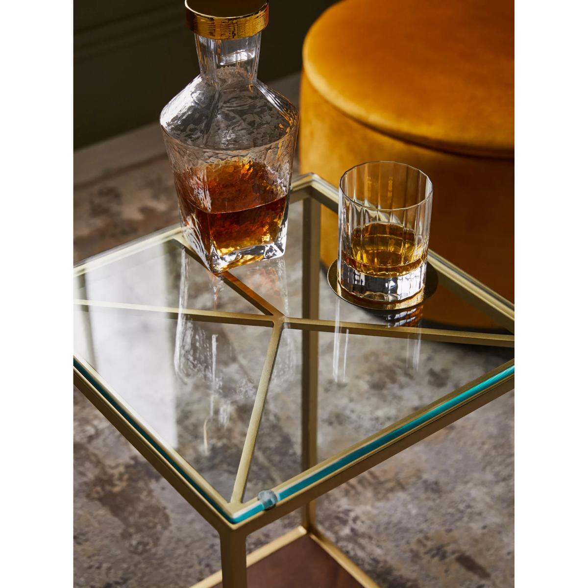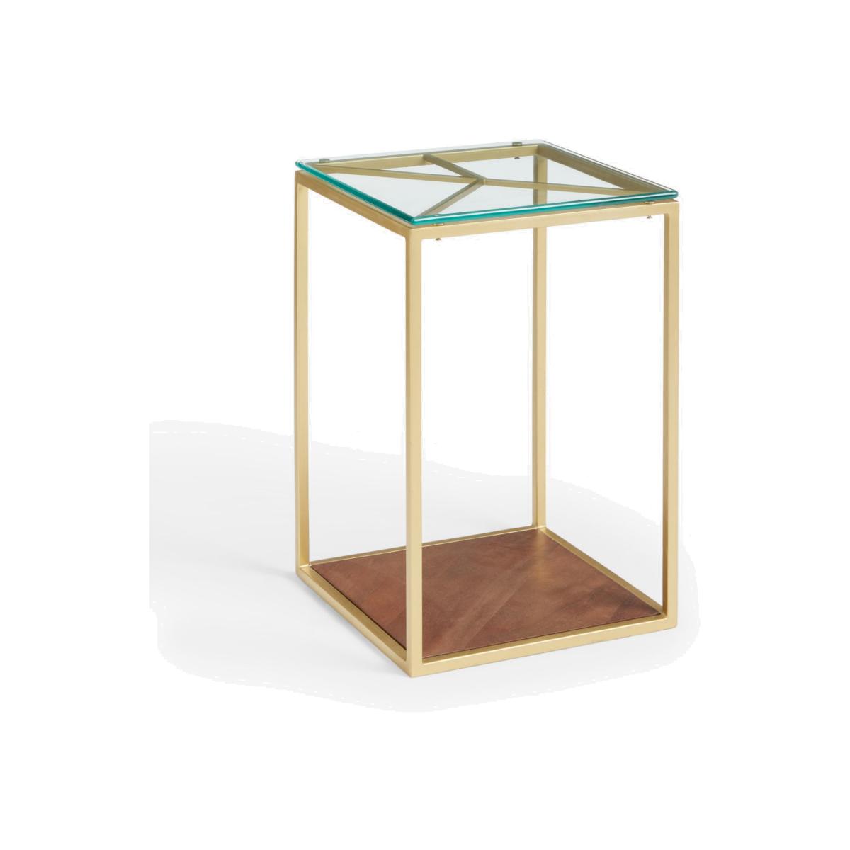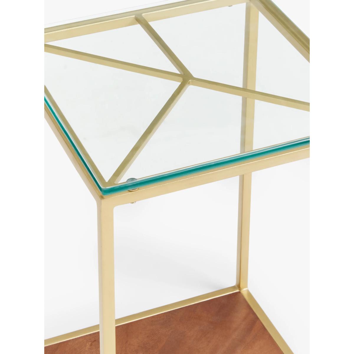 Designed by Swoon, made by us. With a shared commitment to exceptional design and quality, we've collaborated to create an exclusive furniture collection for the modern home. The Mendel side table features a clear toughened glass top and a metal frame in a brass finish. Angled cross bracing on the top gives added dimension and the acacia wood veneer MDF shelf at the bottom provides room for storage or display. Want to see it first? You may want to see and get a feel for the furniture in one of our shops before ordering. We'll be able to tell you where the range you'd like to view is on display.
