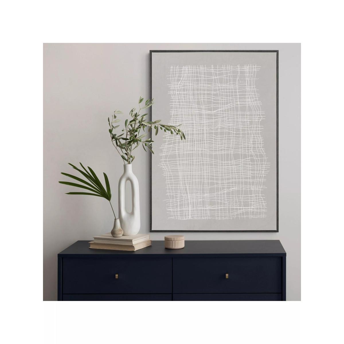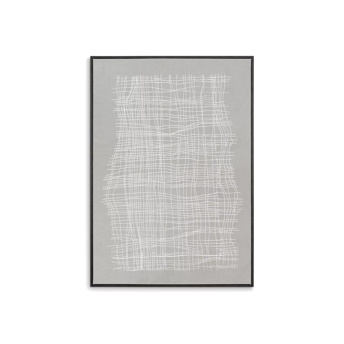 A contemporary design that magnifies a piece of natural material to reveal the entwine of a weave. The fibres unite to create a structure of strength. A tactile, raised embellishment runs the course of the threads. A neutral background adds character to the pattern. Detailed on a wrapped canvas, a charcoal textured frame completes the minimalistic artwork by artist Tom Reeves. Tom Reeves was born in 1967 in Tulsa, Oklahoma but relocated to southern California as a young adult. California's contemporary design style had a major influence on his growth as a modern-day artist. Have you thought about wall hooks and fittings?
