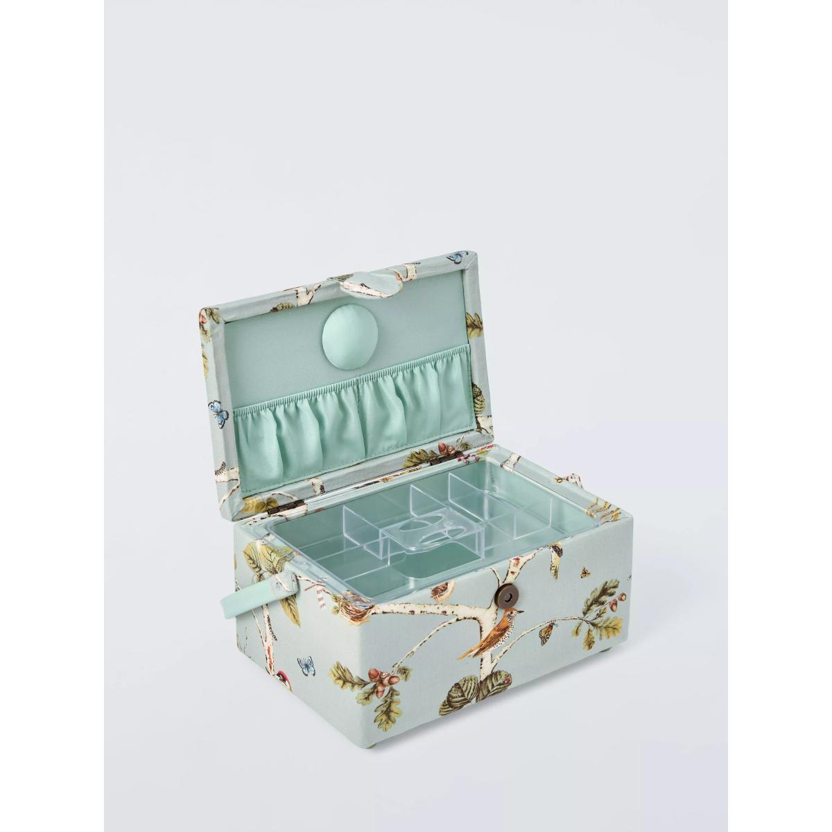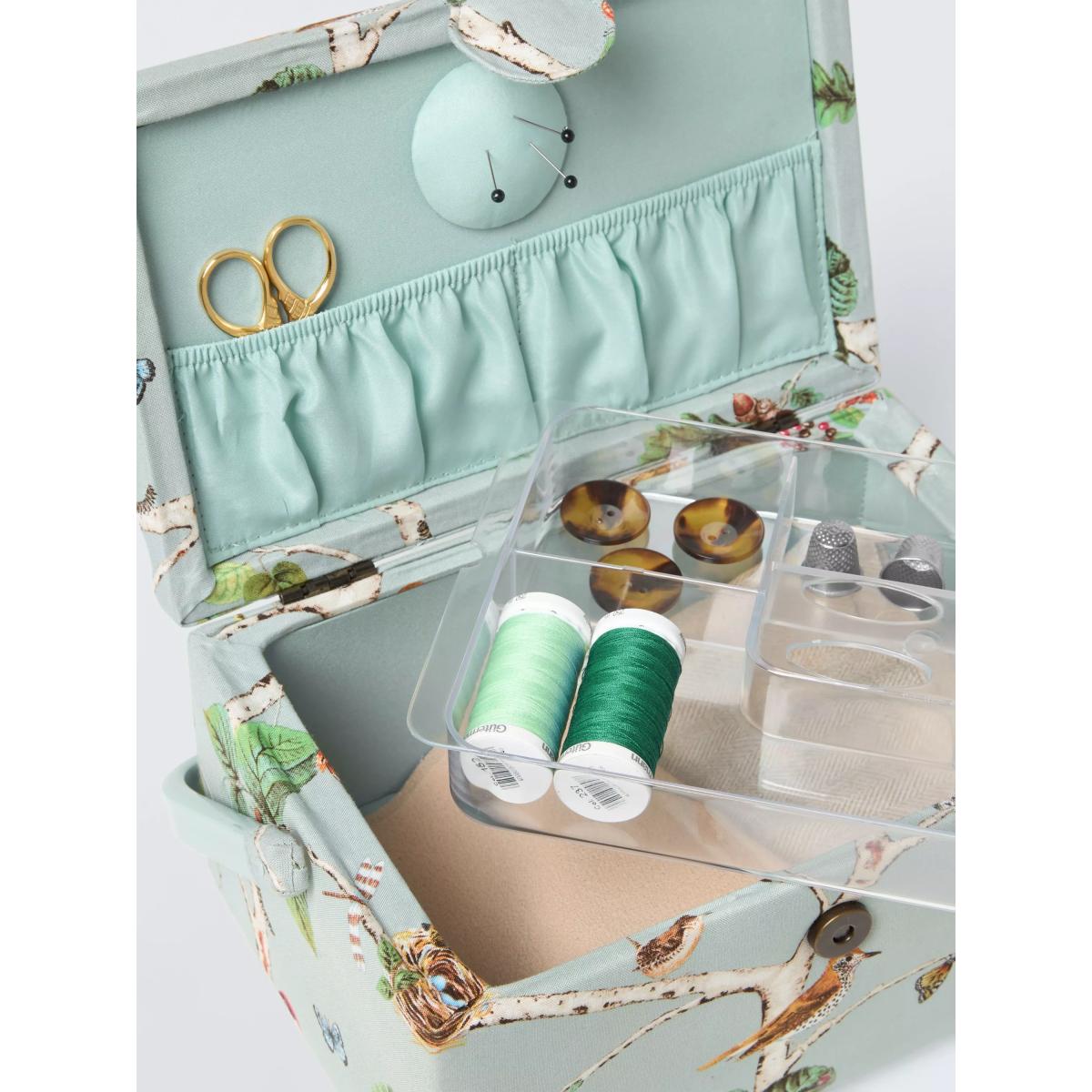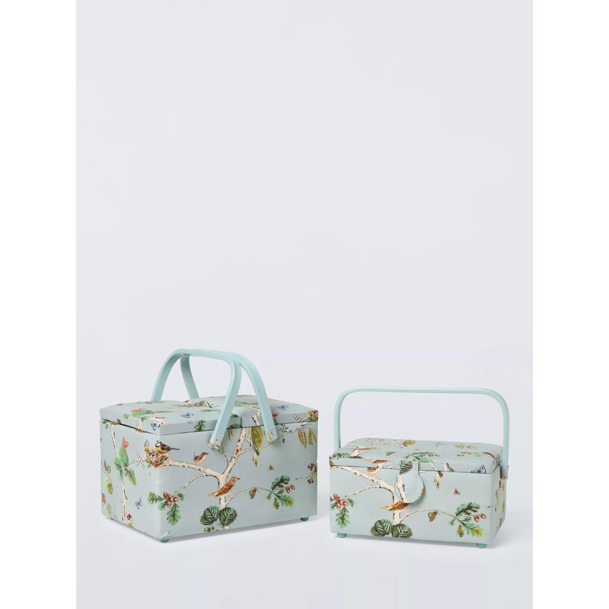 The ideal storage solution for keen crafters, this sewing box will keep your worktop tidy whilst adding a touch of charm to your home. Covered in soft printed cotton, this rectangular sewing basket has a grab handle that allows for ease of transport enabling you to sew on the go. It also has a removable plastic tray with plenty of compartment space for needles, thimbles and threads allowing you to organise your sewing kit in preparation for your next project. The removable tray lifts to reveal a spacious compartment that can be used for storing fabrics and other essential equipment. Finished with a nature inspired print, this basket is an essential for serious sewers.