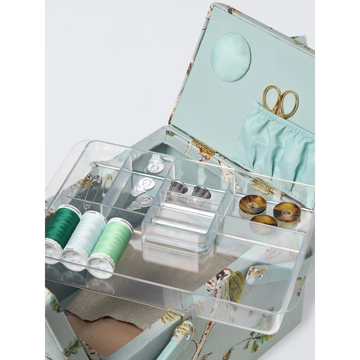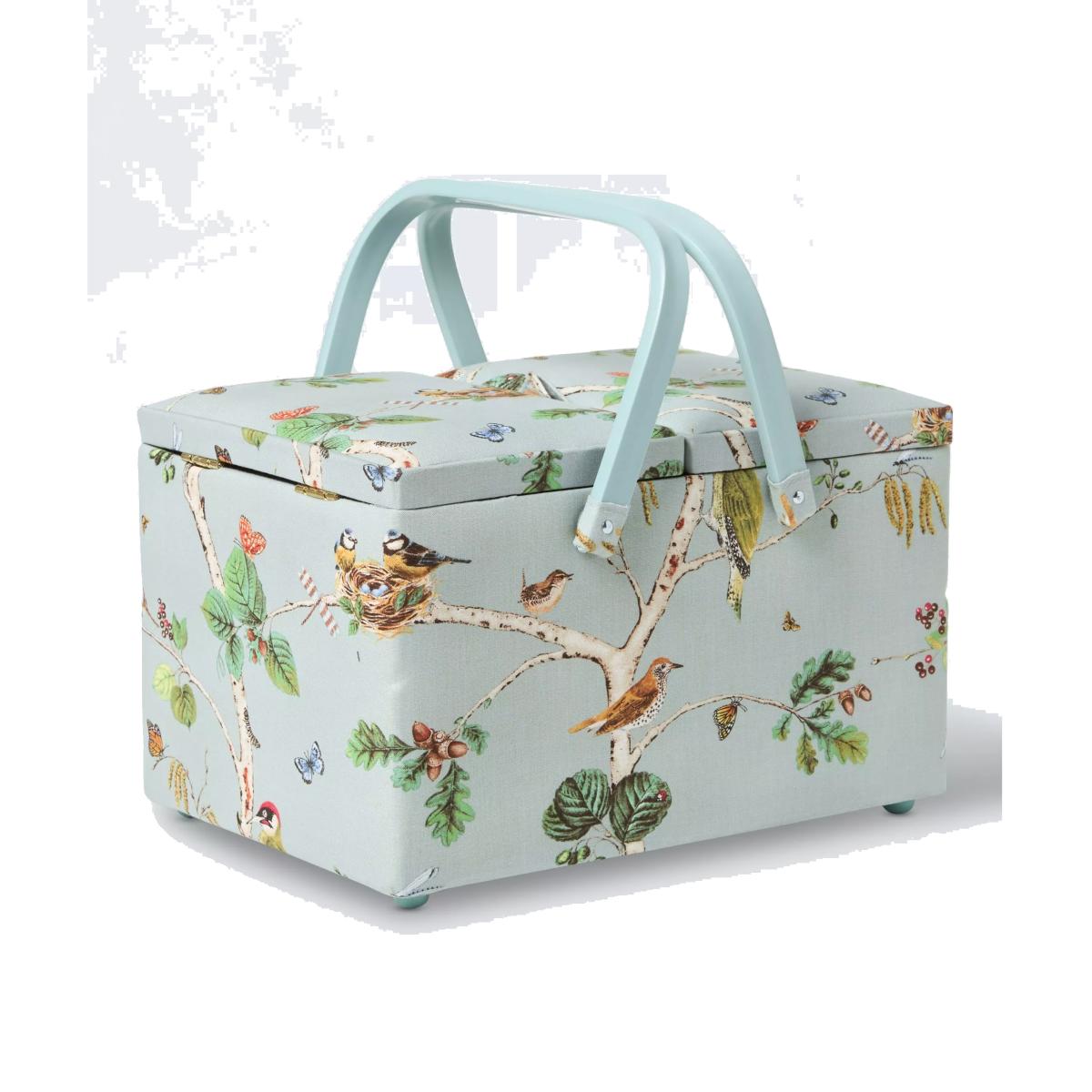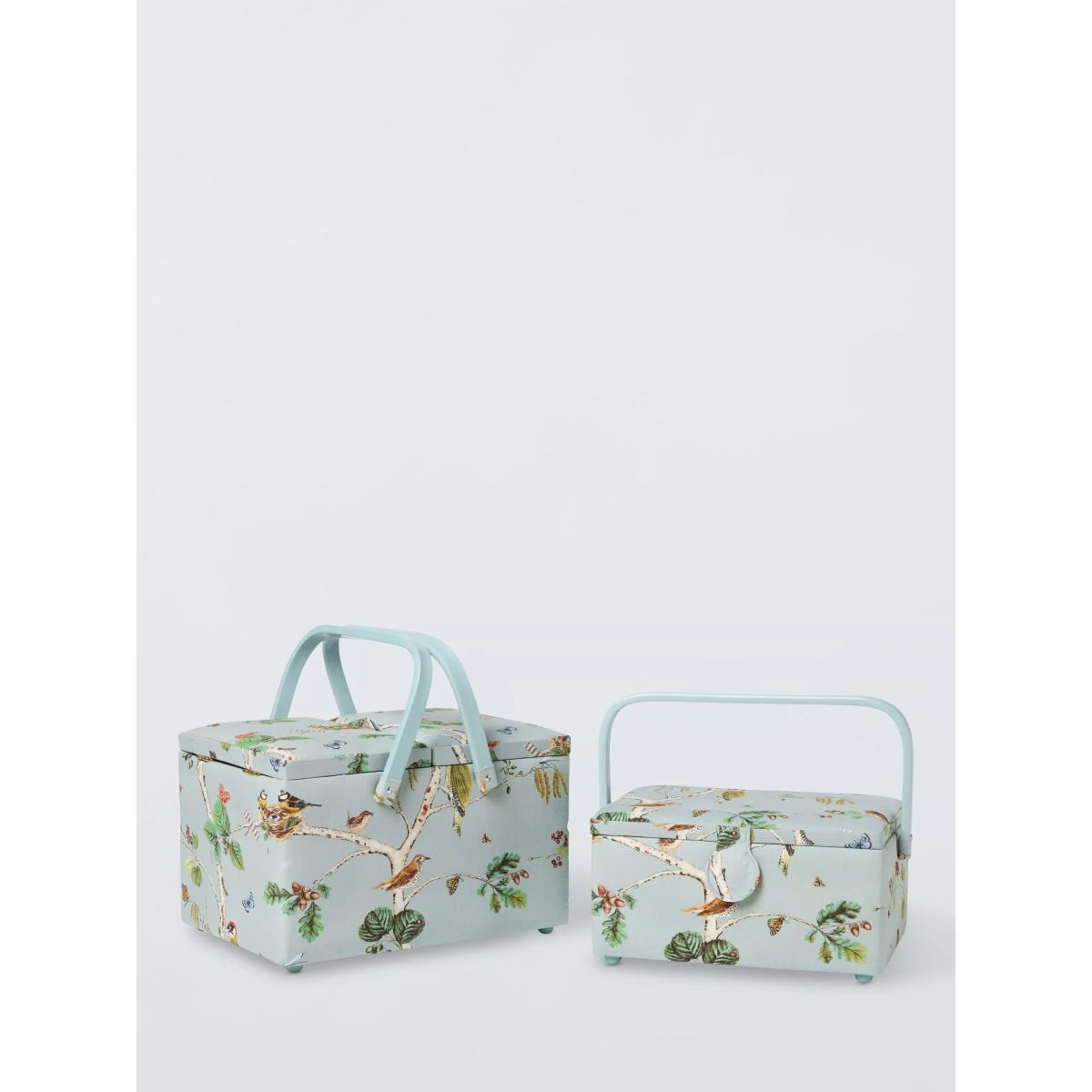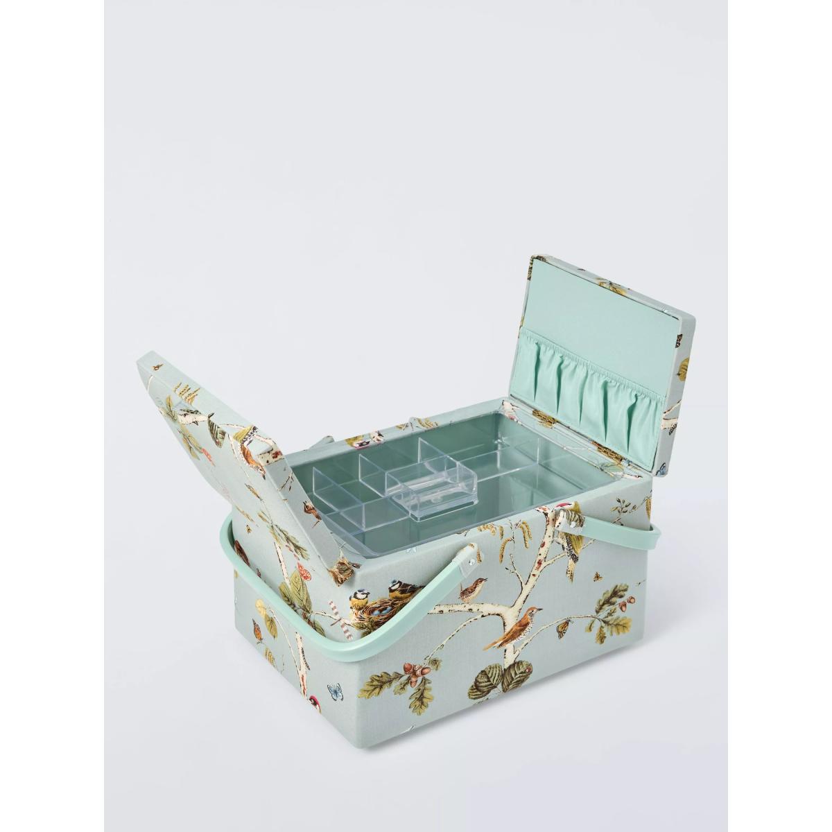 The ideal storage solution for keen crafters, this sewing box will keep your worktop tidy whilst adding a touch of charm to your home. Covered in soft printed cotton, this twin lid sewing basket has a double grab handle that allows for ease of transport enabling you to sew on the go. It also has a removable plastic tray with plenty of compartment space for needles, thimbles and threads allowing you to organise your sewing kit in preparation for your next project. The removable tray lifts to reveal a spacious compartment that can be used for storing fabrics and other essential equipment. This basket is an essential for serious sewers.